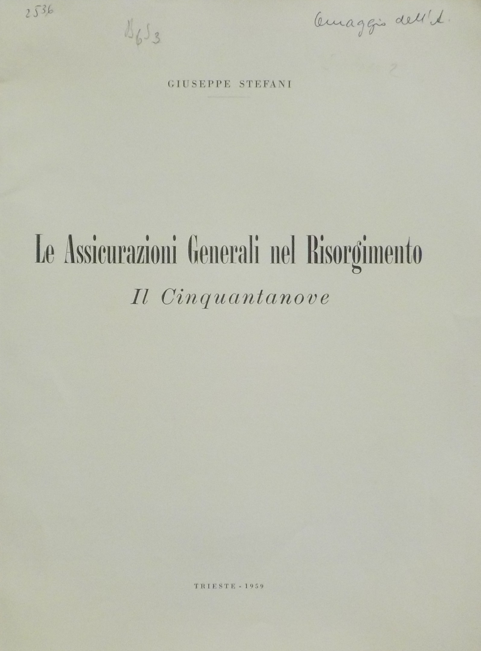 Le *assicurazioni generali nel Risorgimento : Il cinquantanove / Giuseppe Stefani. - Trieste : Le Editoriale Libraria, 1959. - P. 29-55, ill. ; 29 cm. ((Estratto da: Bollettino delle Assicurazioni Generali. - Trieste, aprile-maggio 1959 ; n° 4-5.