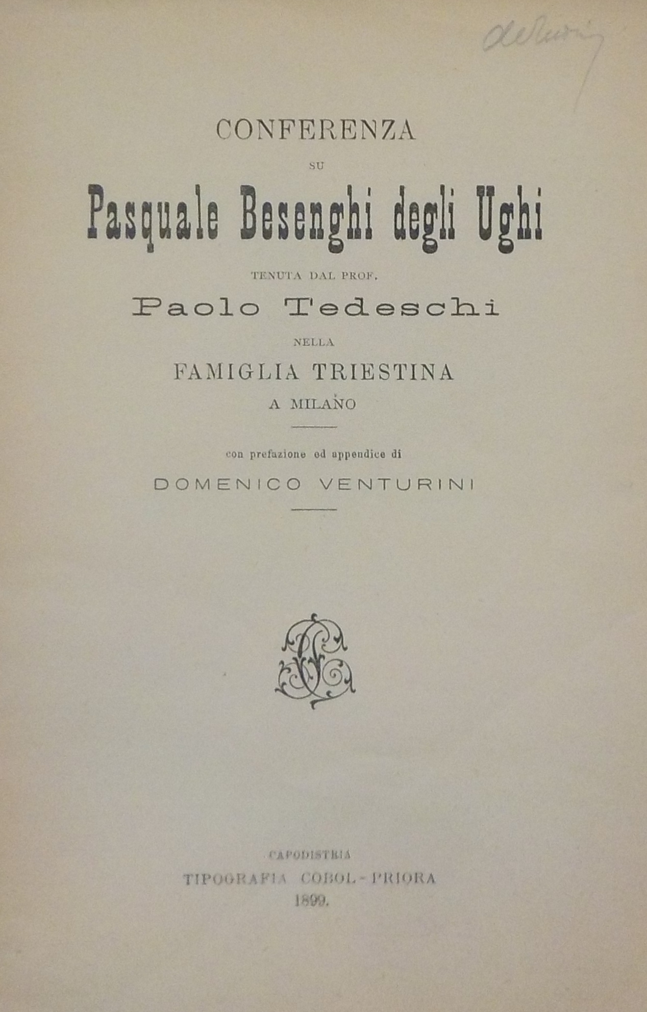 *Conferenza su Pasquale Besenghi degli Ughi / tenuta da Paolo Tedeschi nella famiglia triestina a Milano ; con prefazione ed appendice di Domenico Venturini. - Trieste : Tip. Cobol-Priora, 1899. - 71 p. ; 21 cm.