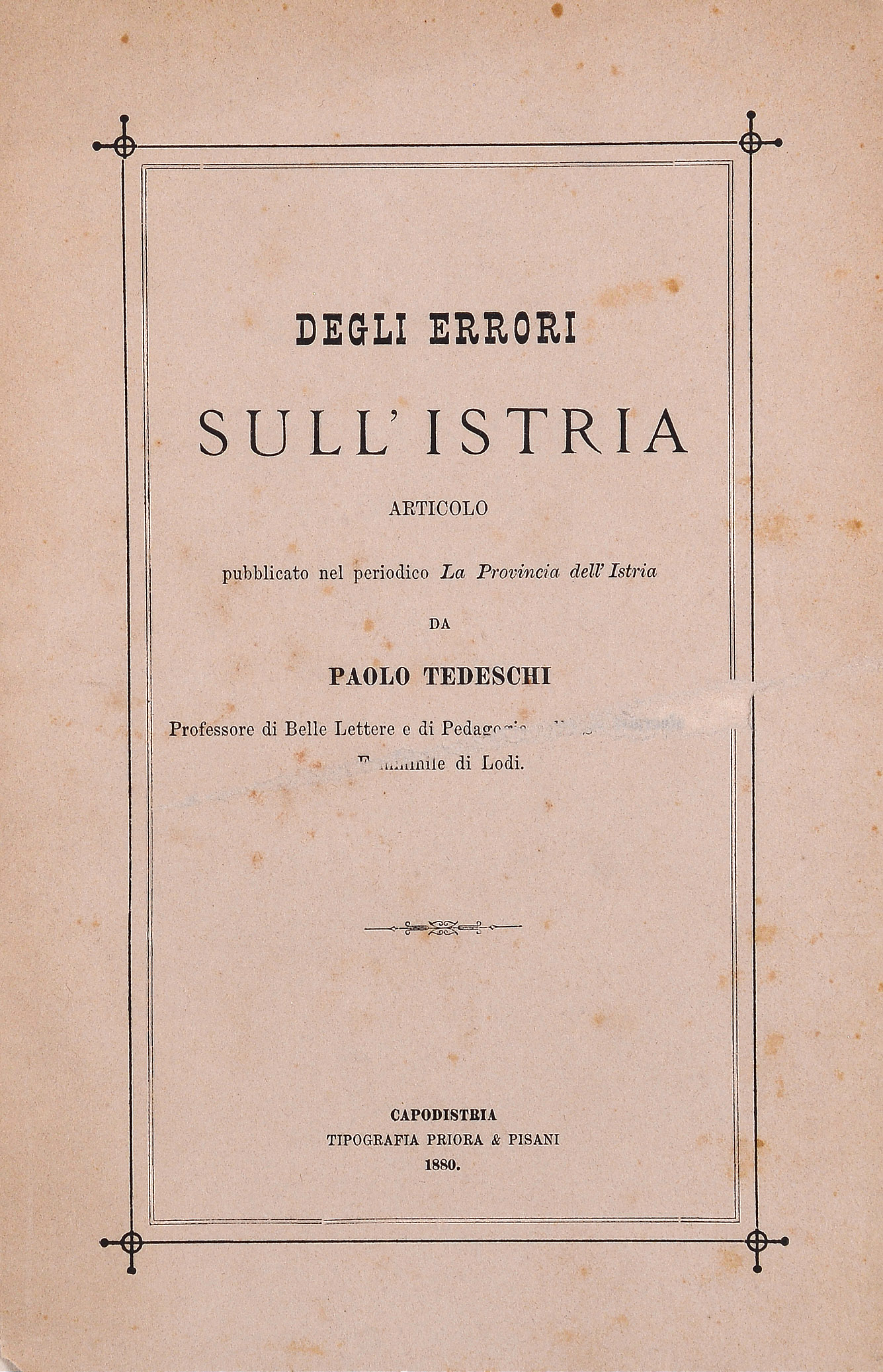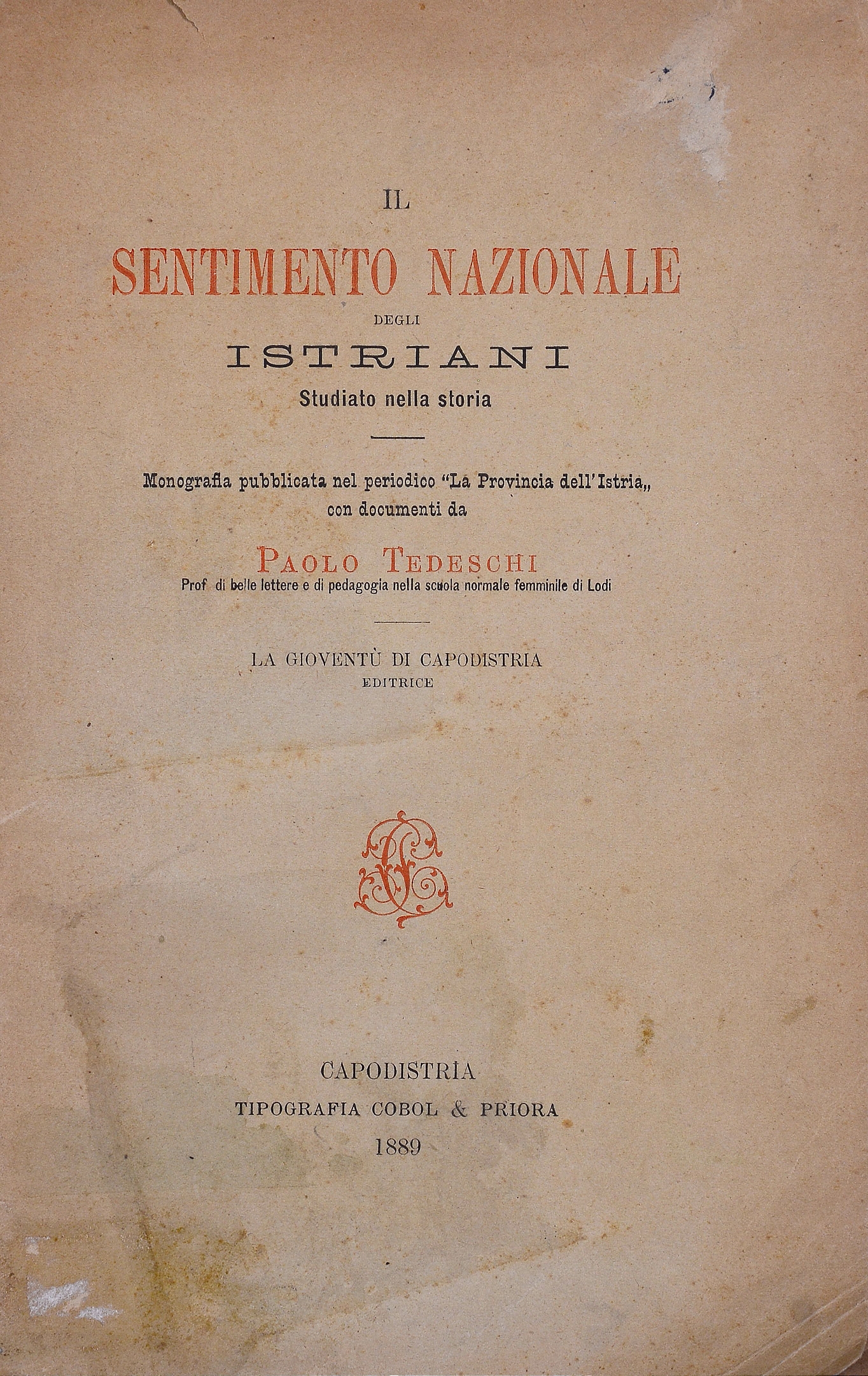 Il *sentimento nazionale degli istriani studiato nella storia : monografia pubblicata nel periodico "La provincia dell'Istria" con documenti / da Paolo Tedeschi. - Capodistria : Tip. Cobol & Priora, 1889. - 80 p. ; 22 cm. ((Nel front.: La gioventù di Capodistria editrice. - Edizione di 1000 copie per la distribuzione gratuita.