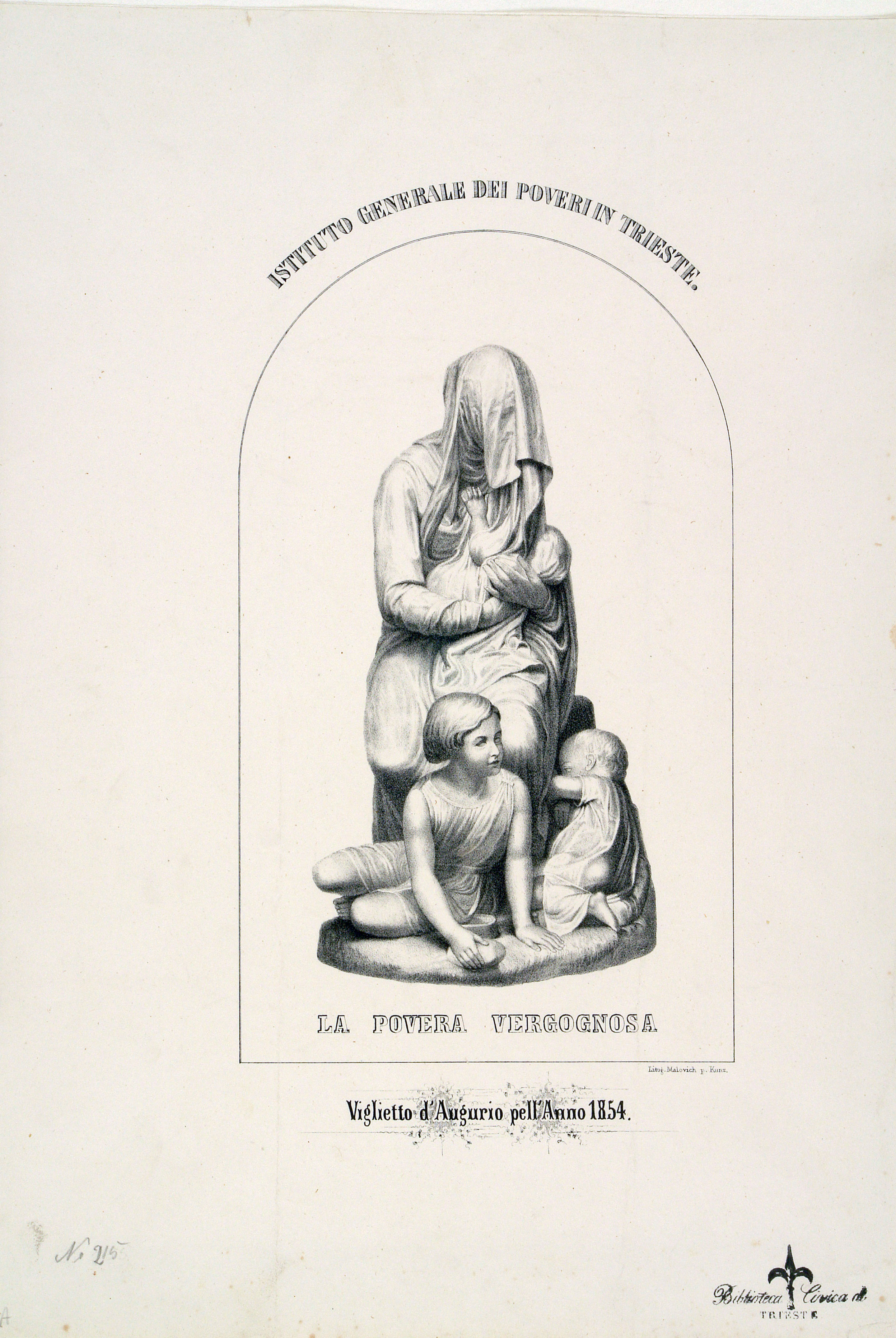 La *povera vergognosa : viglietto d'augurio pell'anno 1854 / litog. Malovich. - Trieste : Kunz, 1854. - 1 stampa : lit. ; 30x16 cm su foglio 41x30 cm.