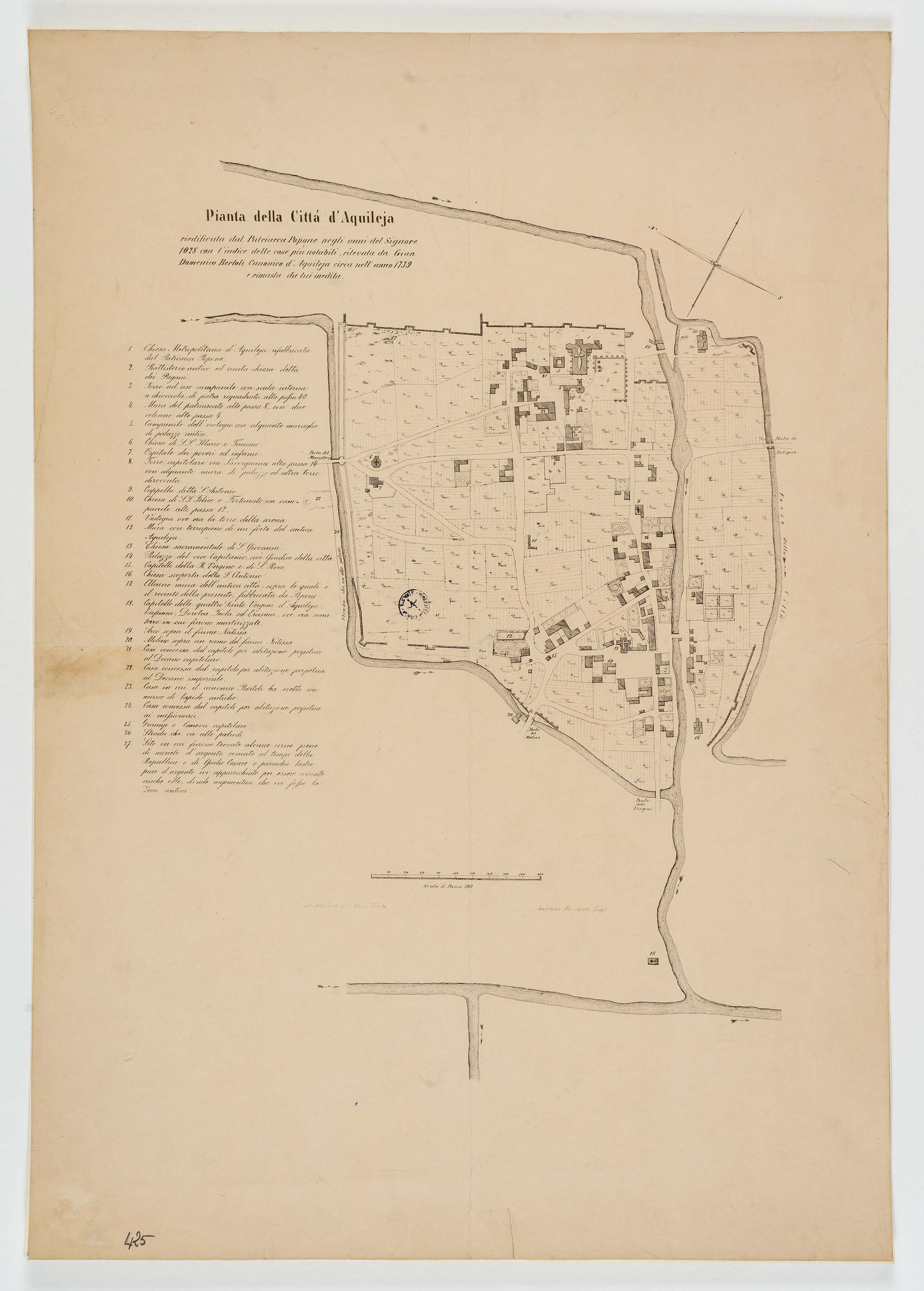 *Pianta della città d'Aquileja riedificata dal patriarca Popone negli anni del signore 1028, con l'indice delle cose più notabili, rilevata da Gian Domenico Bertoli canonico d'Aquileja circa nell'anno 1739 e rimasta da lui inedita / Gaetano Ferrante ing. - Scala di passi 200[=8,6 cm, circa 1:1 700]. - Trieste : Lit. Malovich p. C. Kunz, [18..]. - 1 carta : lit. ; 61x43 cm.