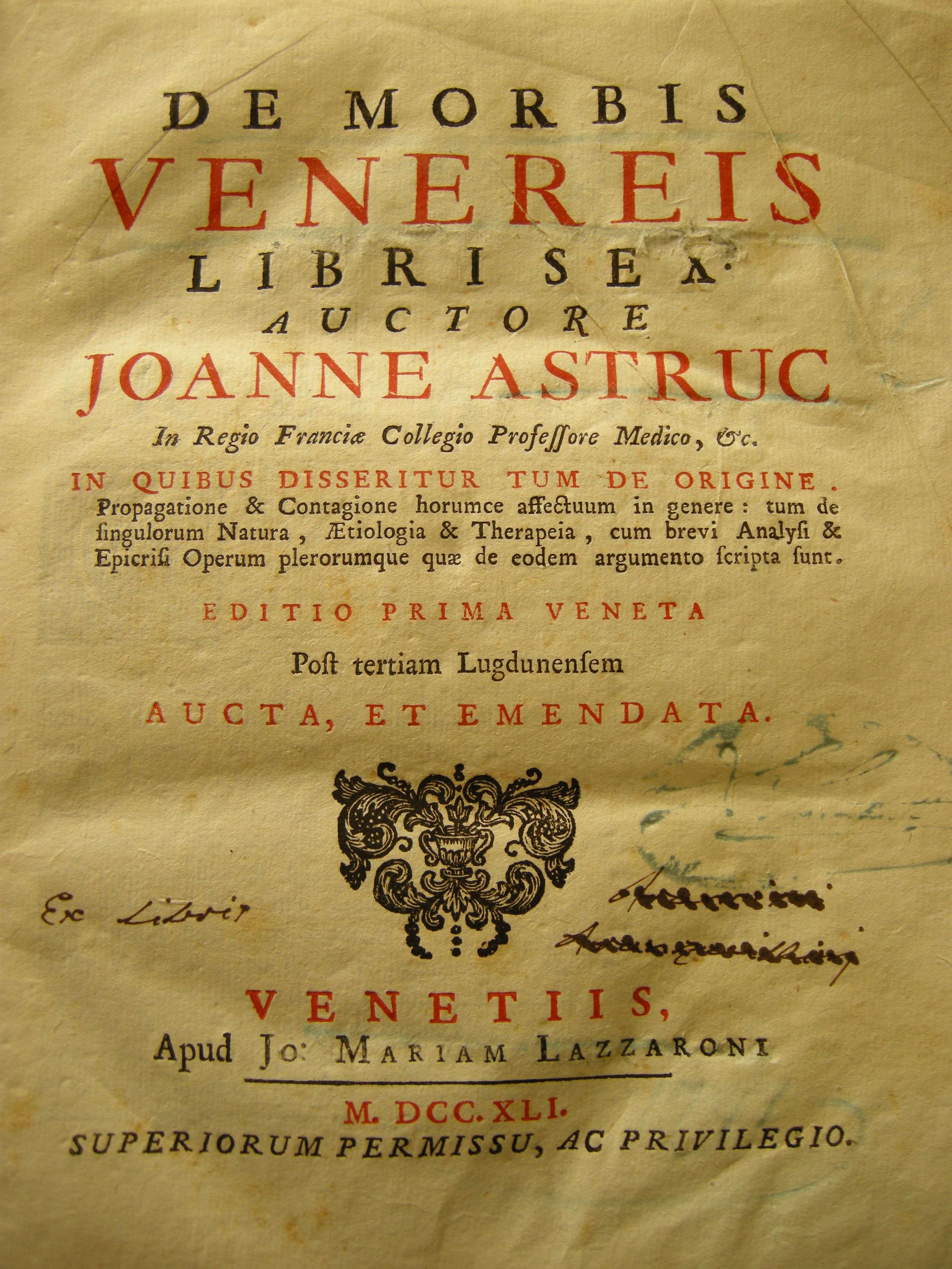 *De morbis venereis libri sex. Auctore Joanne Astruc in regio Franciae Collegio professore medico, & c. In quibus disseritur tum de origine. Propagatione & contagione horumce affectuum in genere: tum de singulorum natura, aetiologiae & therapeia, cum brevi analysi & epicrisi operum plerorumque quae de eodem argumento scripta sunt. - Editio prima Veneta post tertiam lugdunensem aucta, et emendata. - Venetiis : apud Jo. Mariam Lazzaroni, 1741. - XXXI [i.e. 35], [1], 639, [33] p. ; 4°. ((Occhietto. - Segnatura: a⁸ b¹⁰ A-2T⁸. - Le p. XXXIV e XXXV numerate erroneamente XXX e XXXI. - Frontespizio in rosso e nero. - Fregio xilografico sul front. - Iniziali, finalini e testatine xilografiche.