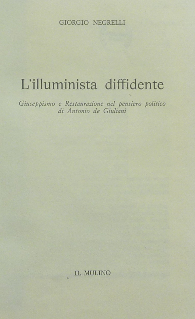 L' *illuminista diffidente : Giuseppismo e Restaurazione nel pensiero politico di Antonio de Giuliani / Giorgio Negrelli. - Bologna : Il mulino, 1974. - 304 p. ; 22 cm.