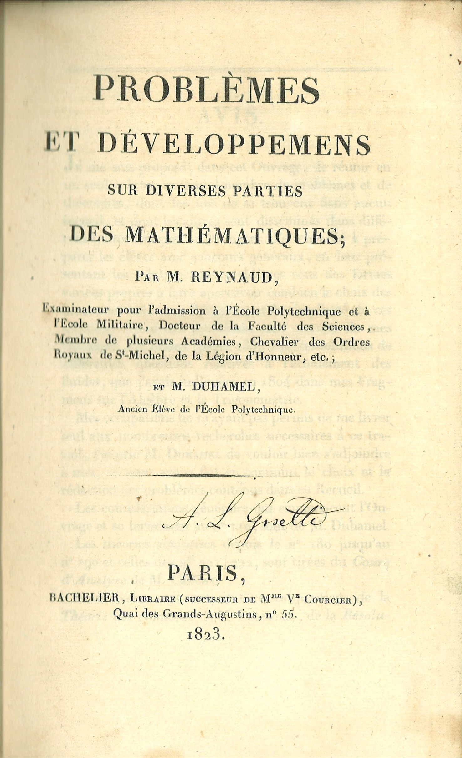 *Problèmes et développemens sur diverses parties des mathématiques; par m. Reynaud ... et M. Duhamel ... - Paris : Bachelier, libraire (successeur de m.me ve Courcier), quai des Grands-Augustins, n. 55, 1823 ([Parigi] : imprimerie de Huzard-Courcier, rue du jardinet, n. 12). - VIII, 399, [3], 4 p., 11 c. di tav. ripieg. : ill. calcogr. ; 8º. ((A c. chi2,3 estratto del catalogo dell'ed. - Indicazione di stampa sul verso dell'occhietto. - Altro colophon a c. ch3v.: Imprimerie de Huzard-Courcier, rue du jardinet St. André des Arcs, n. 12. - Segn.: pigrego4 1-25/8 chi4 (-ch4).