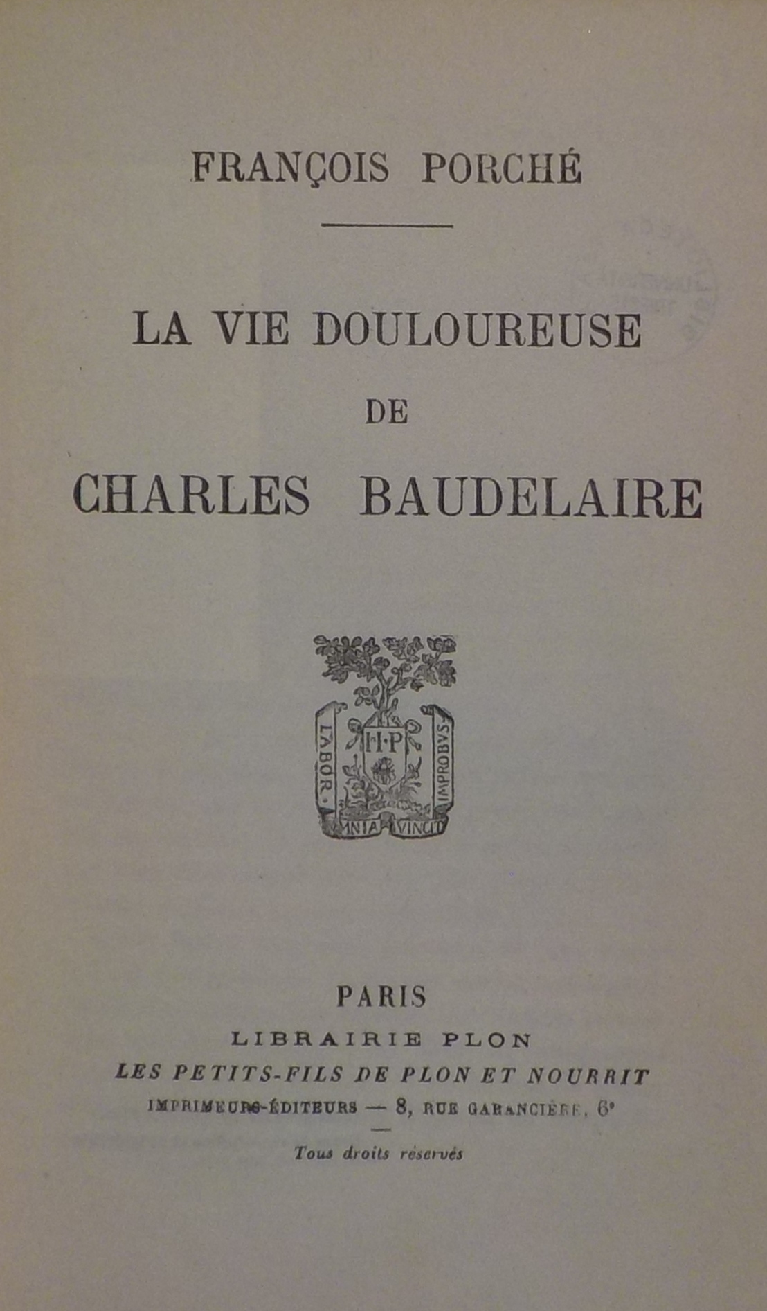 La *vie douloureuse de Charles Baudelaire / Francois Porche. - Paris : Librairie Plon, c1926. - III, 304 p. ; 19 cm