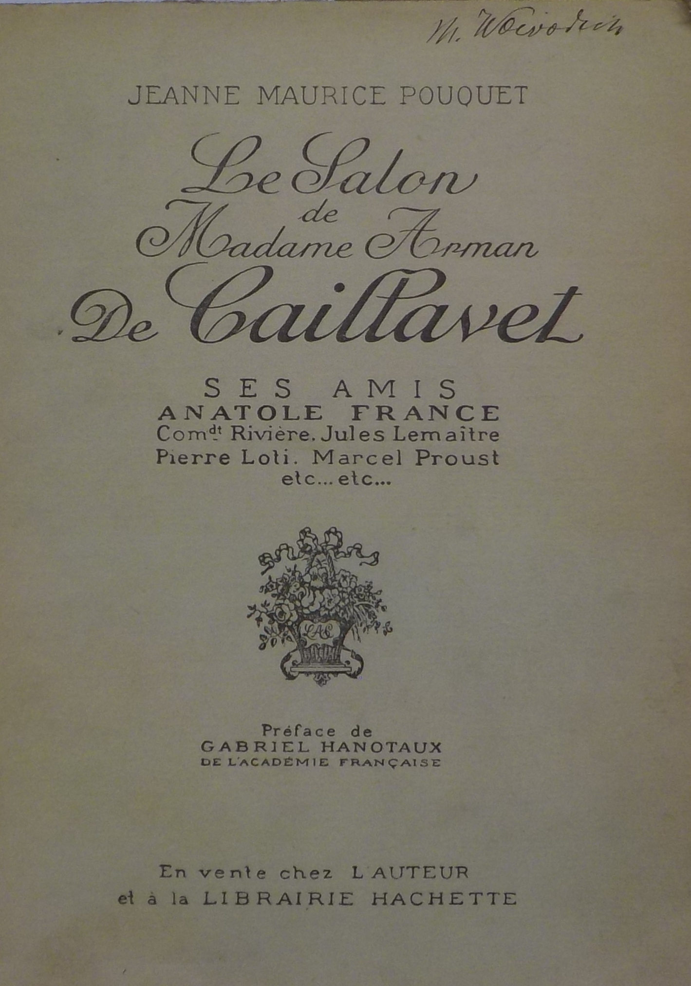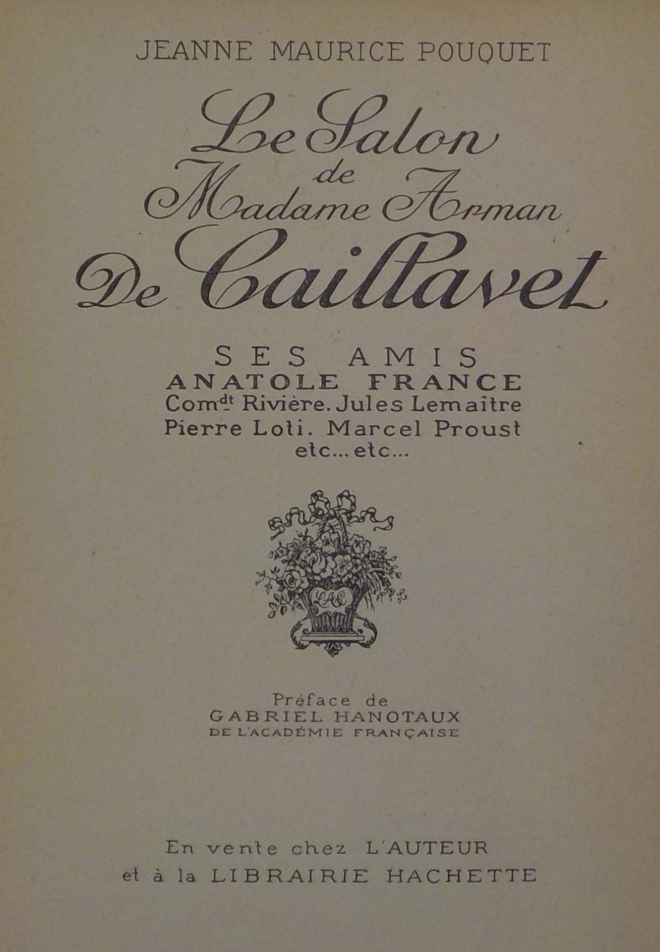 Le *salon de Madame Arman De Caillavet : ses amis Anatole France, Rivière, Jules Lemaître, Pierre Loti, Marcel Proust etc... etc... / Jeanne Maurice Pouquet ; préface de Gabriel Hanotaux. - \Parigi! : en vente chez l'Auteur et à la librairie Hachette, \1926!. - VII, 268 p., \8! c. di tav. : ill. ; 19 cm.