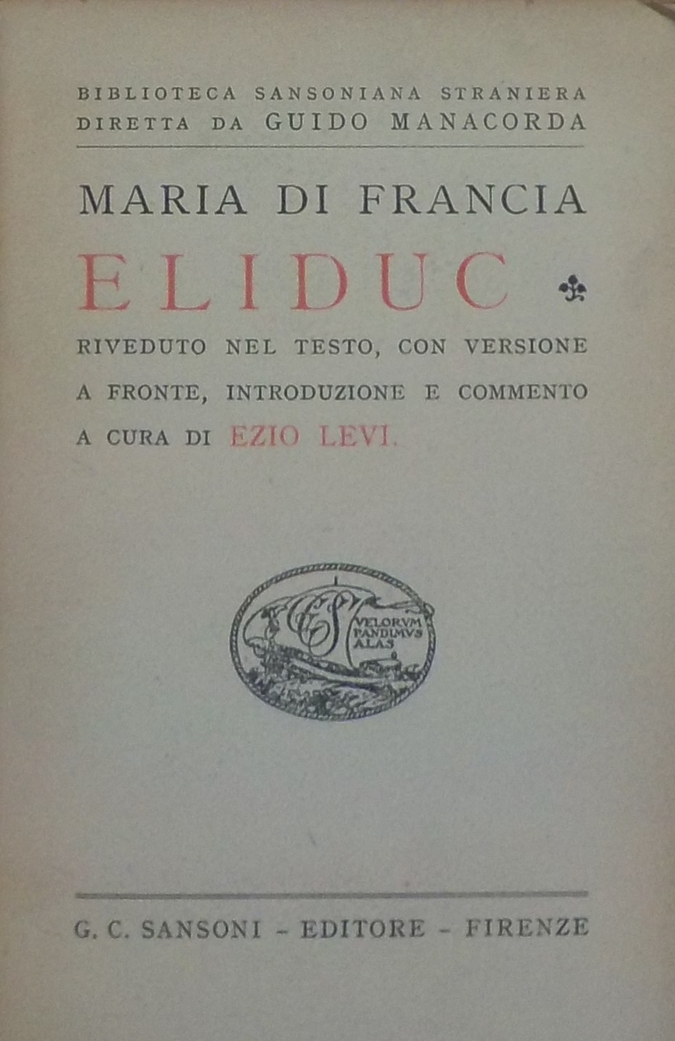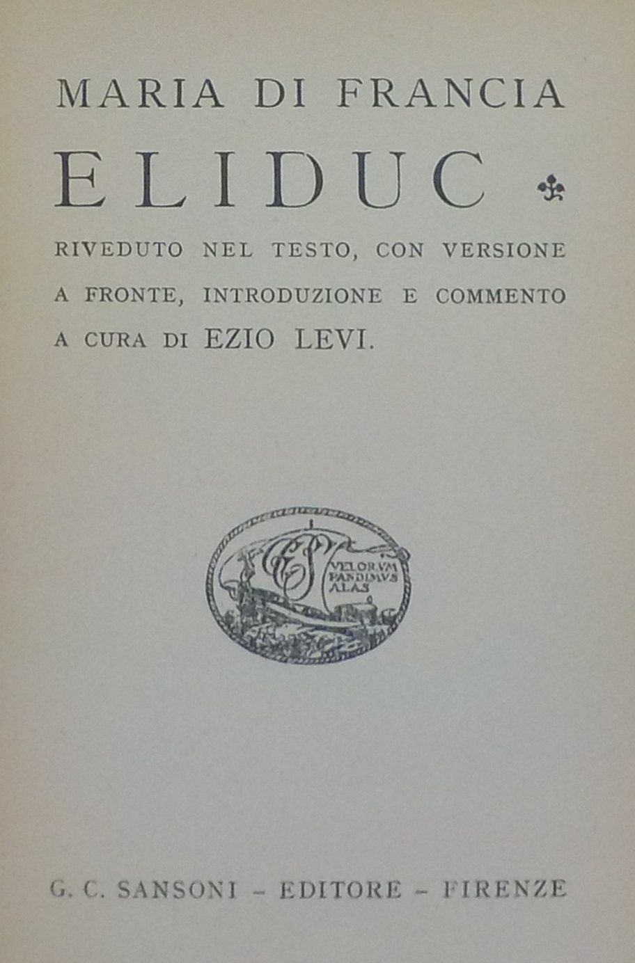*Eliduc / Maria di Francia ; riveduto nel testo, con versione a fronte, introduzione e commento a cura di Ezio Levi. - Firenze : Sansoni, stampa 1924. - XCIV, 127 p., [1] carte di tav. : ill. ; 16 cm