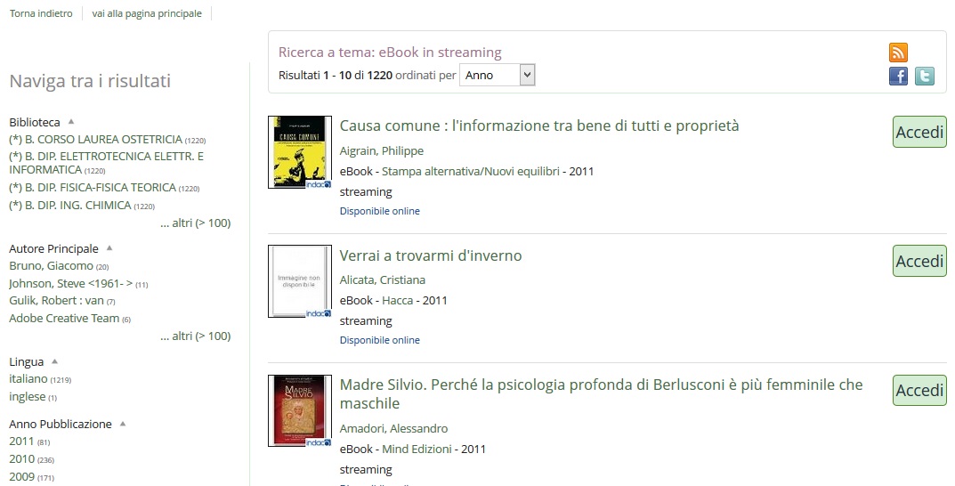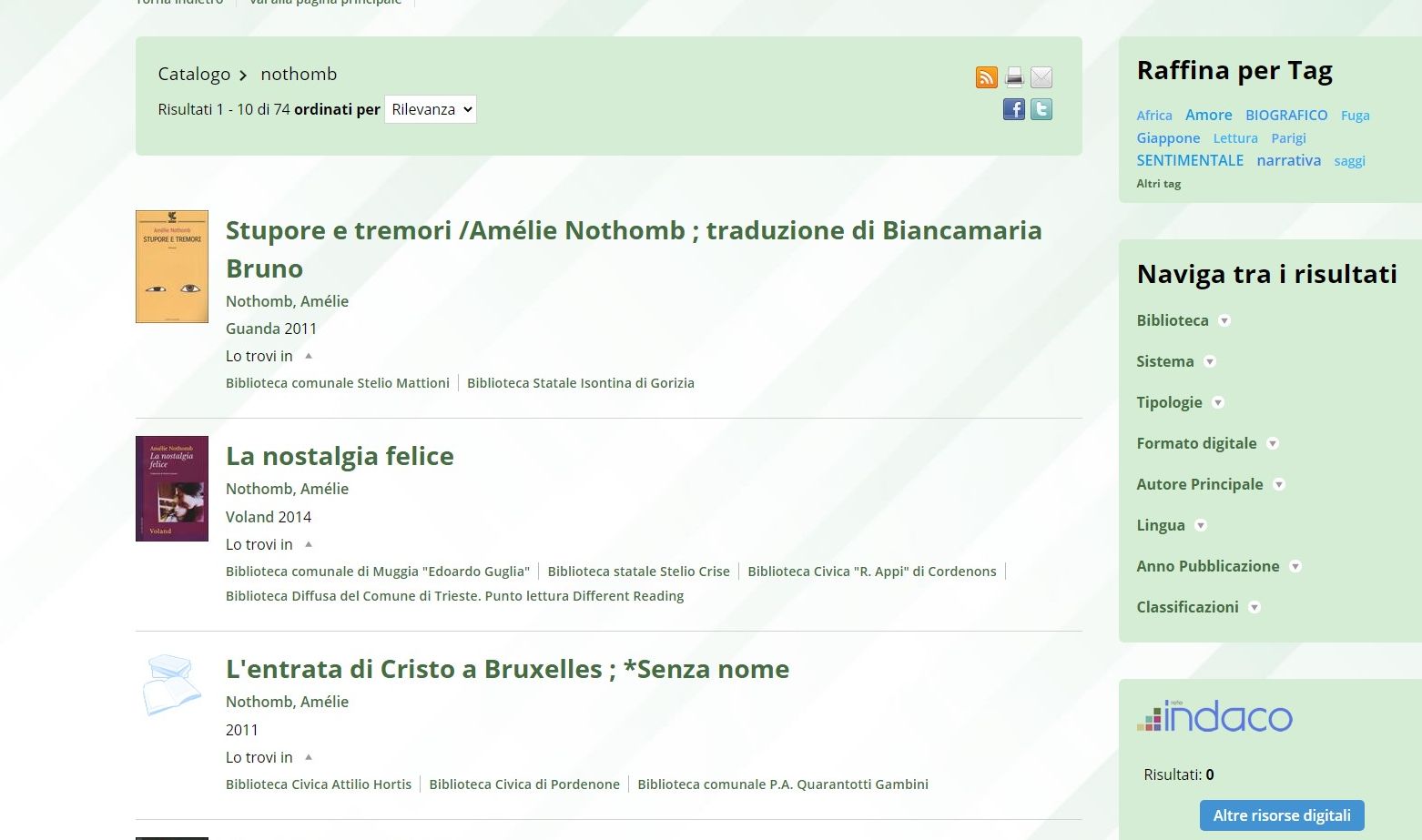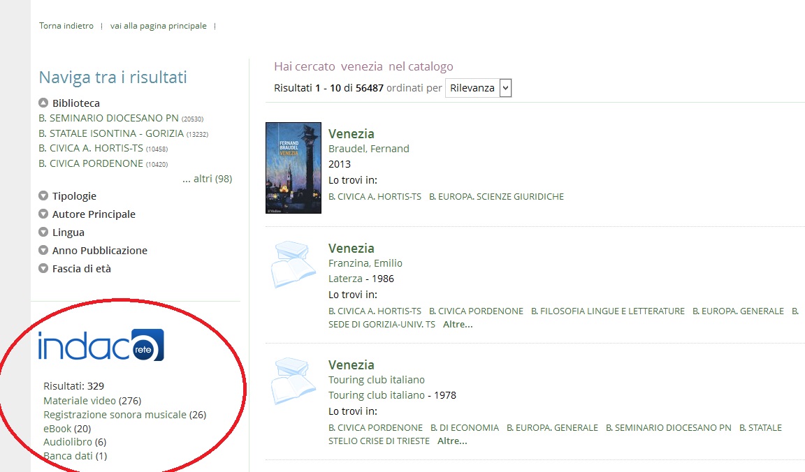 - Si può partire dalla home page, inserendo una o più parole nella stringa di ricerca; a quel punto i risultati possono essere filtrati attraverso la faccetta Indaco