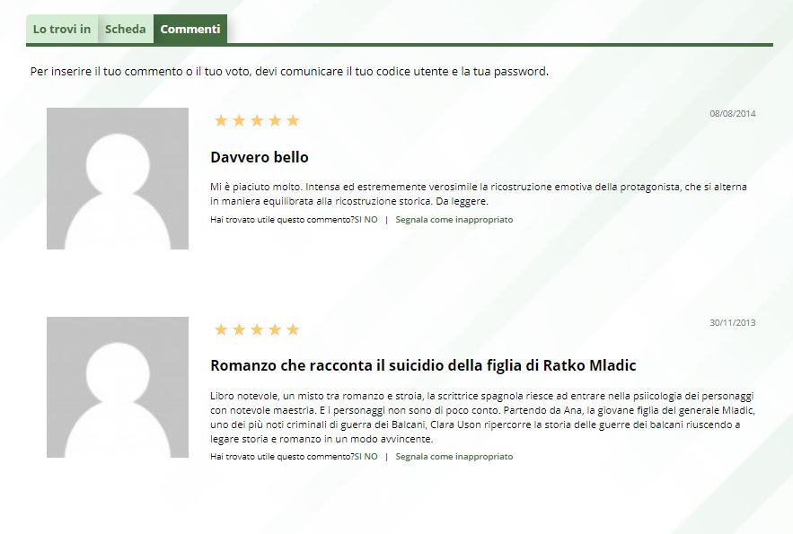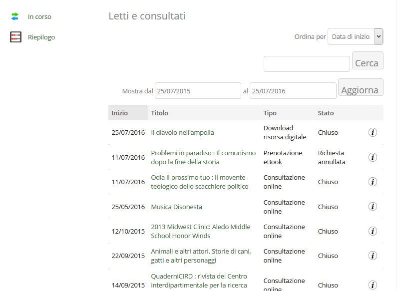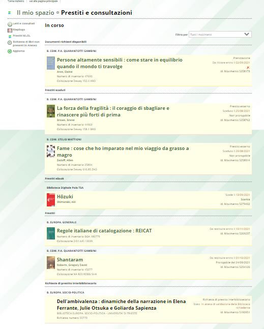 - Non sono disponibili documenti per il prestito: il documento (o i documenti, nel caso in cui la biblioteca ne possegga più copie) non può in quel momento essere dato in prestito.