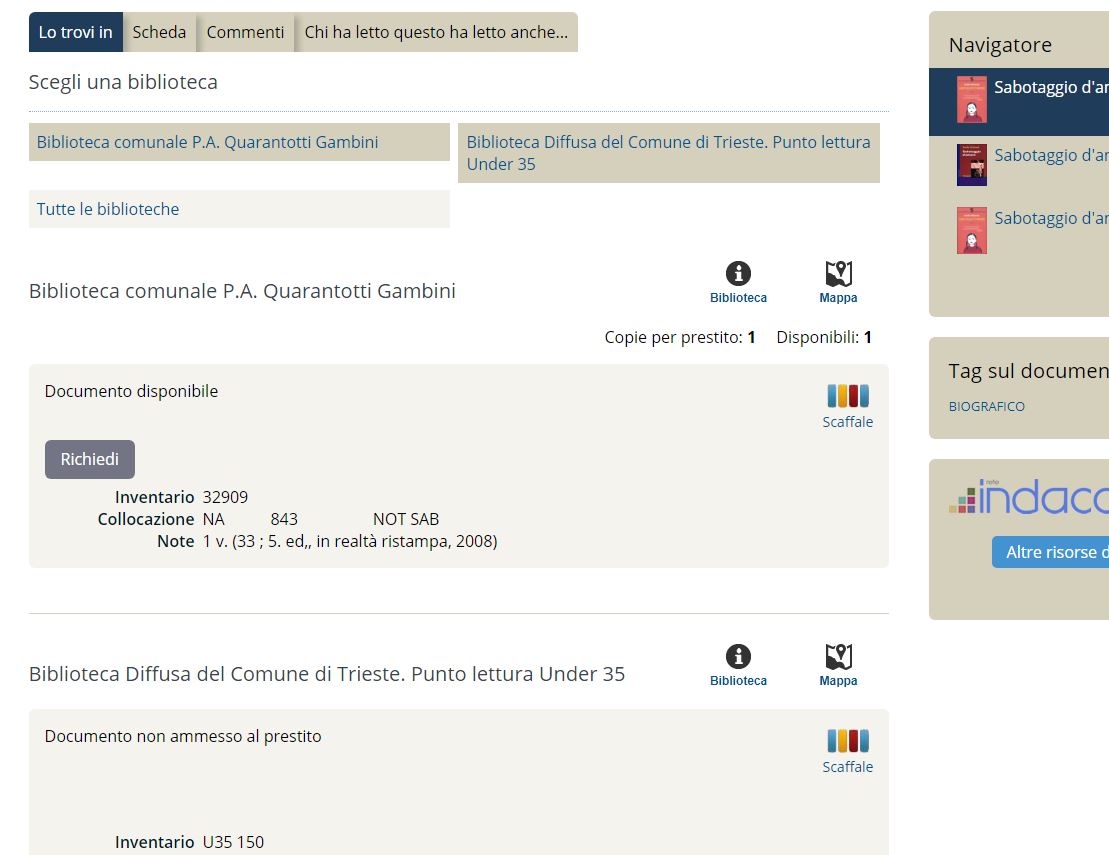 Se il documento è presente in più biblioteche, è necessario cliccare sulla biblioteca desiderata, per accedere ai dati della copia che si trova lì. Cliccando su TUTTE è possibile vedere i dati di tutte le biblioteche che possiedono quel documento.