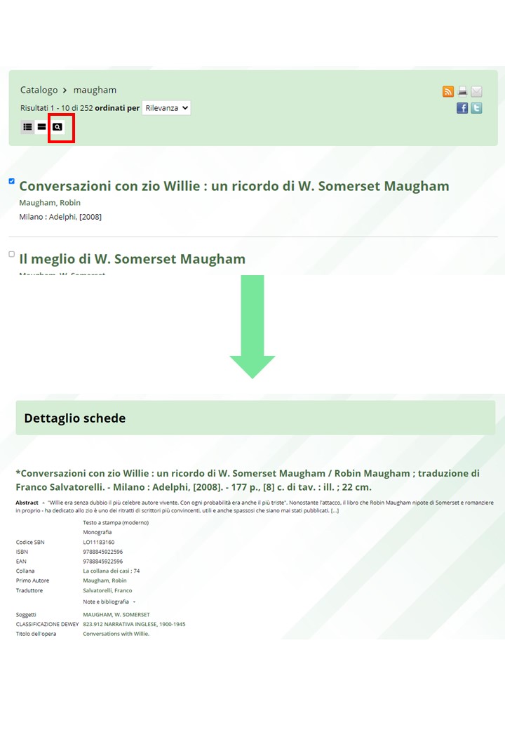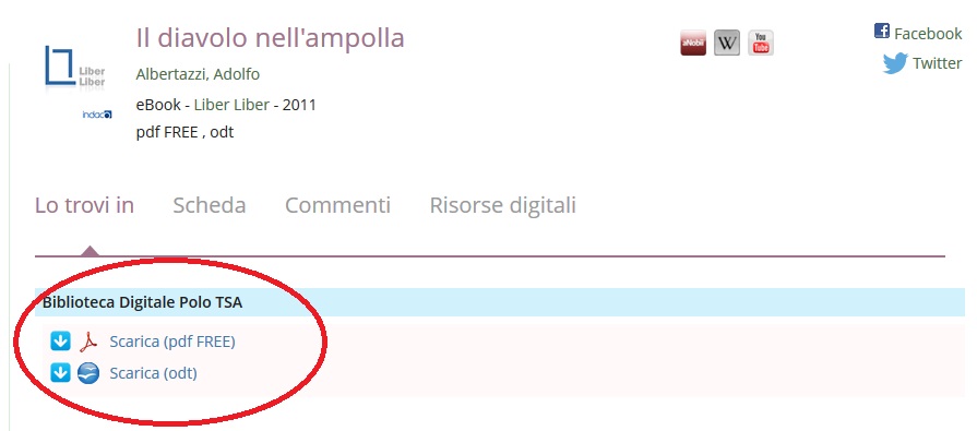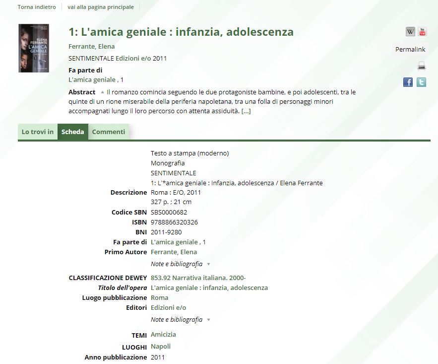 Accanto al titolo, a destra, è possibile cercare il titolo del documento in Google Books, Wikipedia e You Tube. E' possibile inoltre postare il documento su Facebook o inviare un Tweet con i dati dello stesso. La scheda del documento può anche essere stampata.