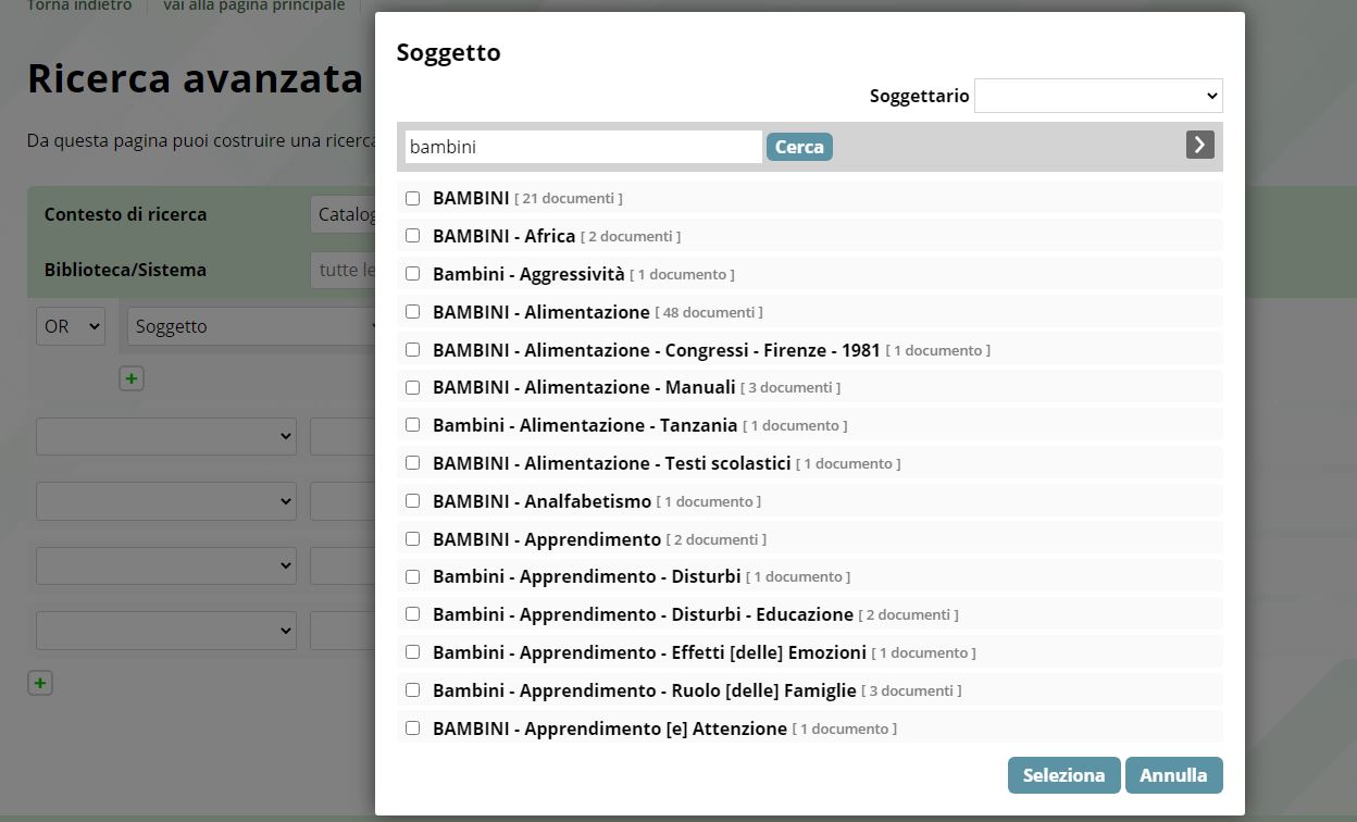 Si ricorda, inoltre, che non tutte le parole del linguaggio corrente sono accettate dal Soggettario che è composto da una lista di termini controllati. Per attivare una ricerca per parte iniziale del soggetto è necessario comunicare la parte iniziale del soggetto e premere sulla faccetta che punta verso il basso.