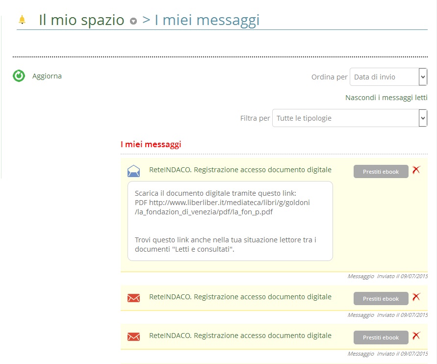 Il sistema invierà anche un messaggio all'utente sullo spazio personale, dove sarà riportato il link della risorsa