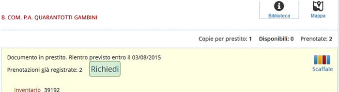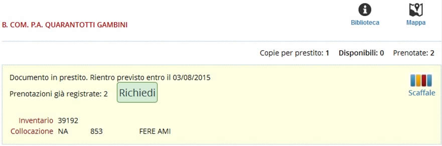 - Richiedi: appare SOLO nel caso in cui la biblioteca abbia attivato la prenotazione via Opac per gli utenti registrati (vedi sezione Servizi all'utente registrato).