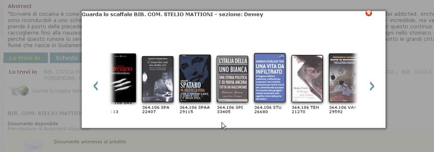 Cliccando su SCAFFALE è possibile visualizzare lo scaffale virtuale su cui è posizionato il documento e scorrere i documenti che si trovano posizionati prima e dopo il documento scelto. Questa funzione può essere utile, in quanto la scansione della sezione a cui appartiene il documento esaminato può portare a recuperare altri documenti di contenuto affine.