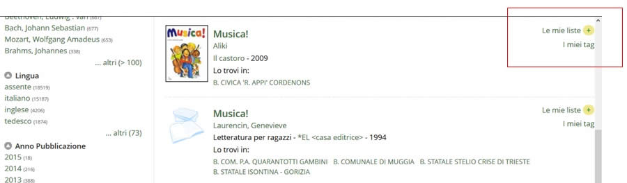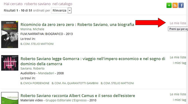 Se si desidera aggiungere un documento ad una lista creata, non lo si potrà fare dallo Spazio personale, ma bisognerà rifare la ricerca e quando ci si troverà in lista risultati, basterà cliccare sul + a fianco della voce se la lista è appena stata creata, oppure su Le mie liste, per aggiungere il documento in un'altra lista.