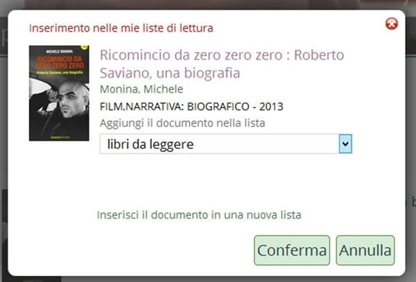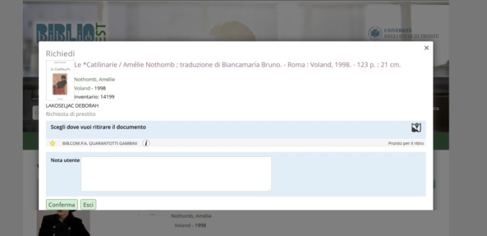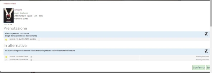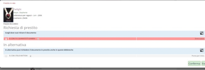 Il sistema chiederà una conferma, e l’utente dovrà selezionare la biblioteca in cui andare a ritirare il libro.