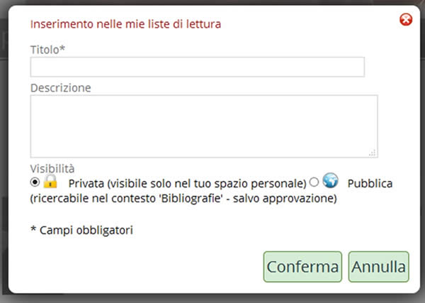 Nel caso si desideri creare una nuova lista, il sistema chiede che a questa vengano assegnati un titolo e una descrizione(facoltativa). E' inoltre possibile decidere se tale bibliografia sarà privata (e quindi visibile solo al suo creatore) oppure pubblica. In tal caso, dopo che il gruppo di Redazione del Polo l'avrà approvata, questa sarà visibile a tutti gli utenti sulla home page di Biblioest, nella sezione PERCORSI DI LETTURA.