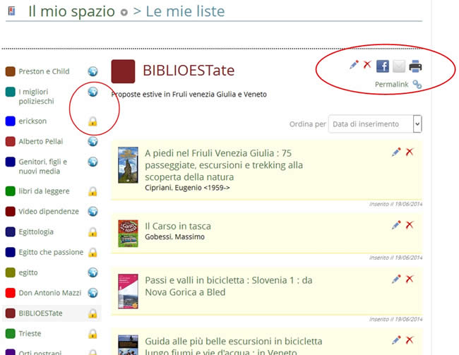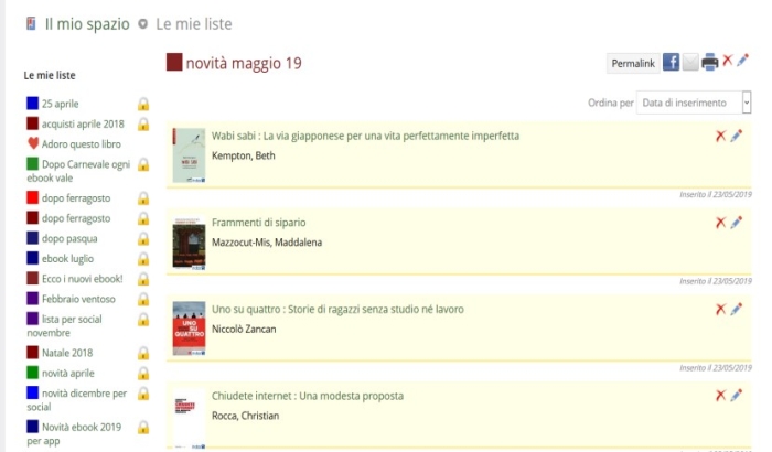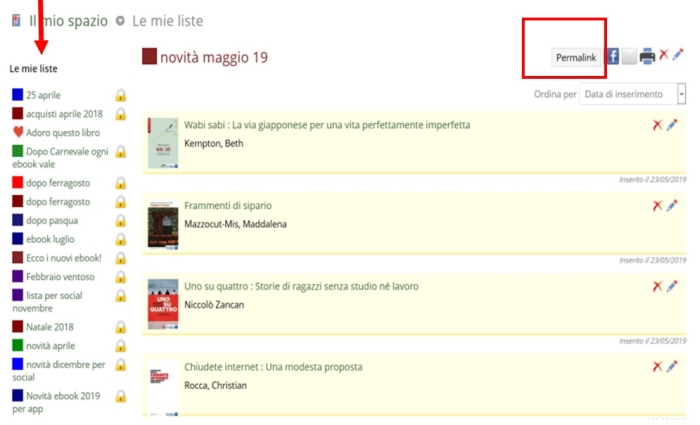 A destra del titolo, è possibile modificare il titolo o la descrizione della bibliografia scelta, cancellarla, postarla su Facebook, inviarla via email, stamparla e visualizzarne il permalink, che può essere diffuso liberamente (per esempio via mail). Grazie al permalink è possibile condividere e diffondere le bibliografie sia private e pubbliche.