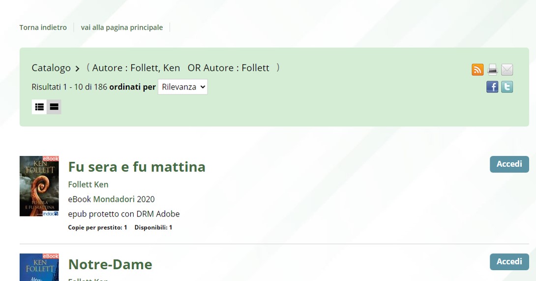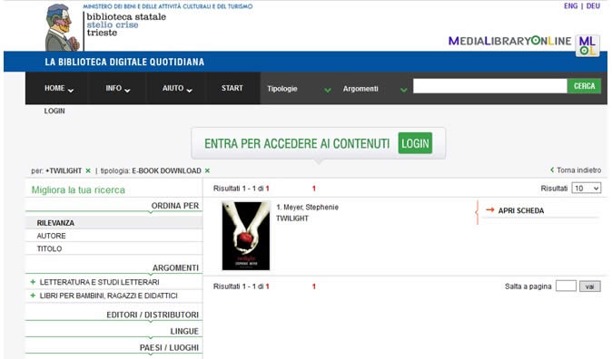 La ricerca in Biblioest permette di reperire anche documenti presenti n Medialibraryonline, che possono essere consultati grazie al widget laterale.
