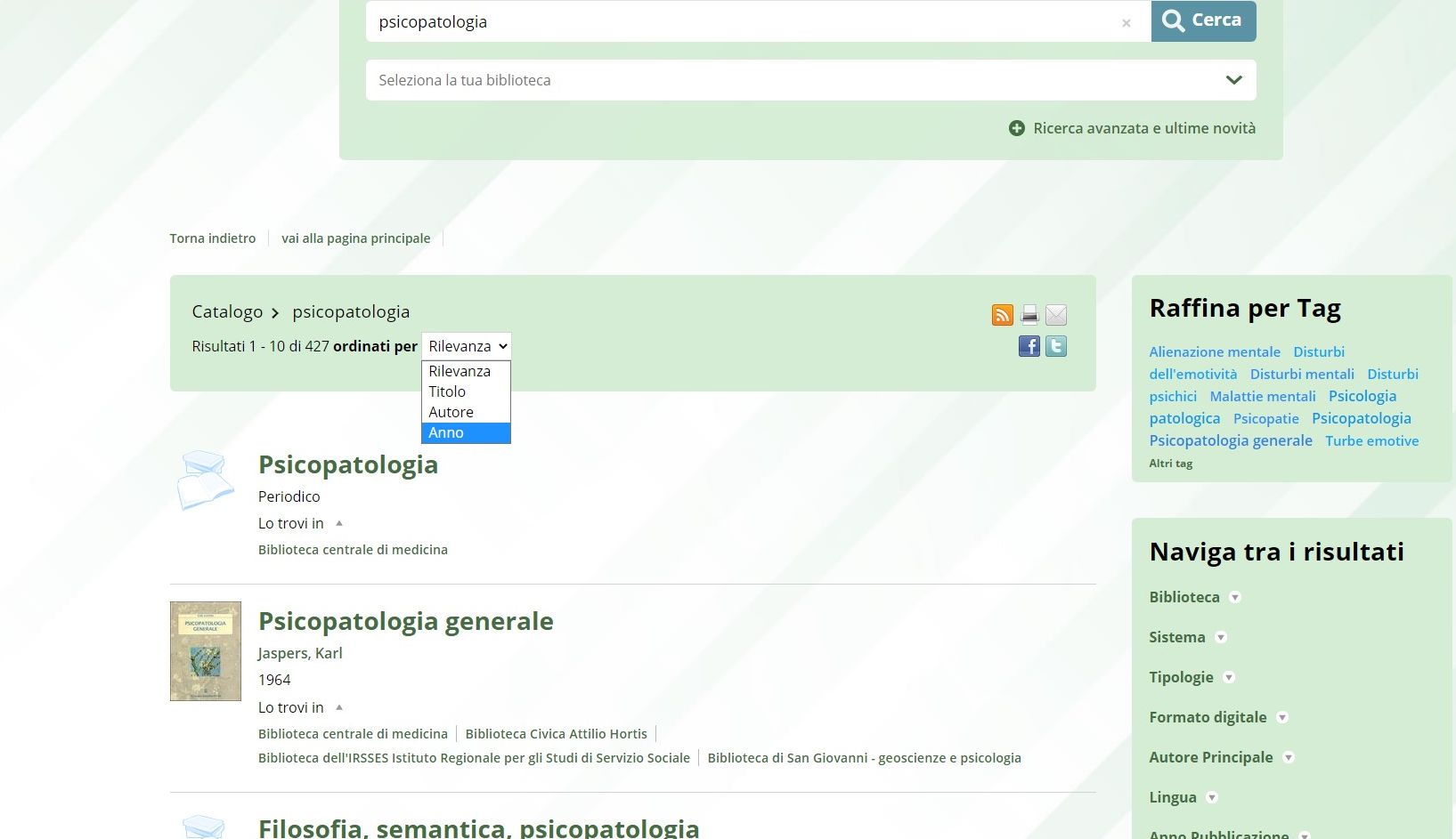 L'elenco dei documenti viene raggruppato in base alla BIBLIOTECA, al SISTEMA, alle TIPOLOGIE, al FORMATO DIGITALE, all'AUTORE PRINCIPALE, alla LINGUA, all'ANNO di PUBBLICAZIONE, alla NATURA, alla LINGUA e alla FASCIA DI ETA', alle CLASSIFICAZIONI... Cliccando direttamente sui risultati è possibile accedere alla lista dei risultati filtrati.