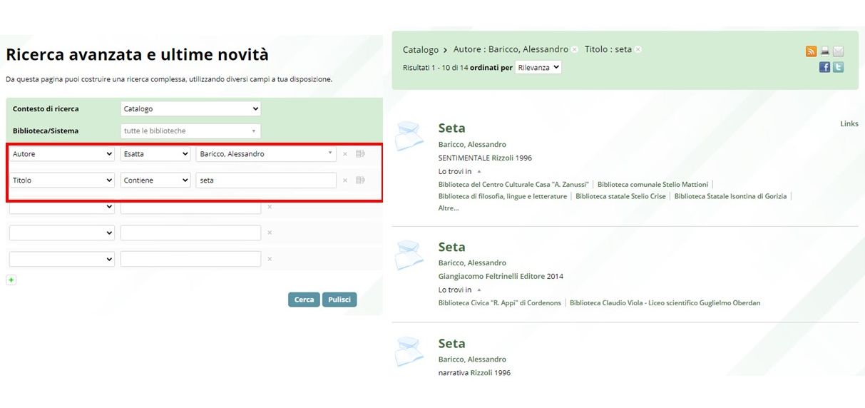 Ad esempio per visualizzare tutti i documenti che contengono il valore “Baricco, Alessandro” nel campo AUTORE e i valori “seta” oppure “mare” nel campo TITOLO basterà utilizzare la ricerca avanzata in questo modo: