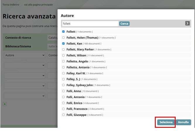 Spuntando la casella posta al lato del nome e cliccando sul tasto SELEZIONA, l'autore selezionato apparirà nel campo del form. Cliccando quindi su CERCA, il sistema presenterà i risultati dei parametri inseriti.