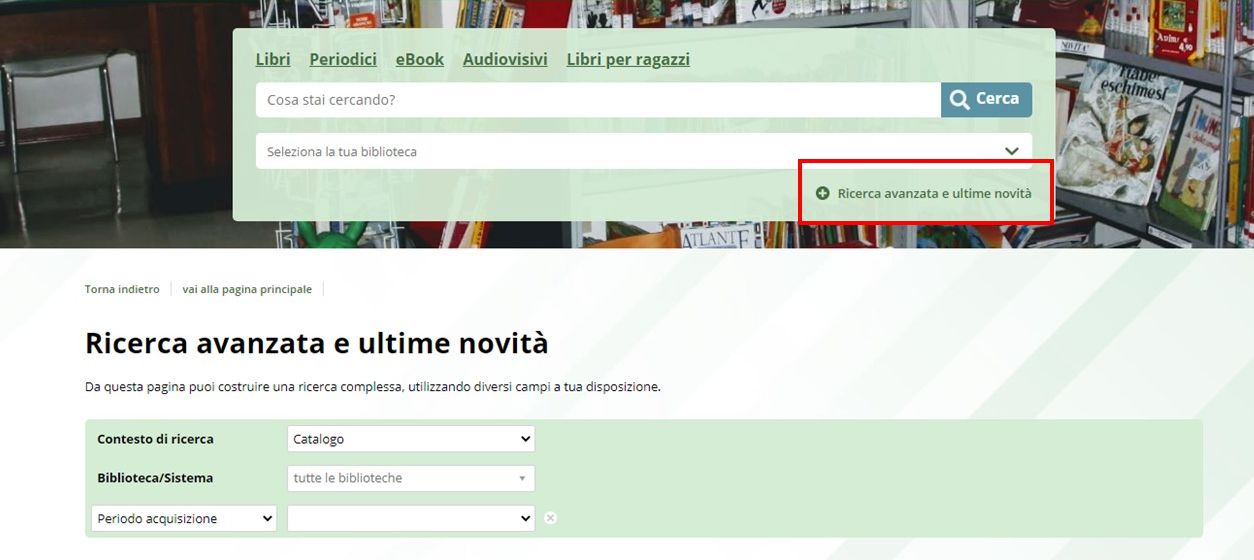 E' possibile accedere agli ultimi acquisti delle biblioteche del Polo, cliccando su RICERCA AVANZATA E ULTIME NOVITA'. E' possibile anche selezionare la biblioteca di interesse tra tutte quelle del polo.