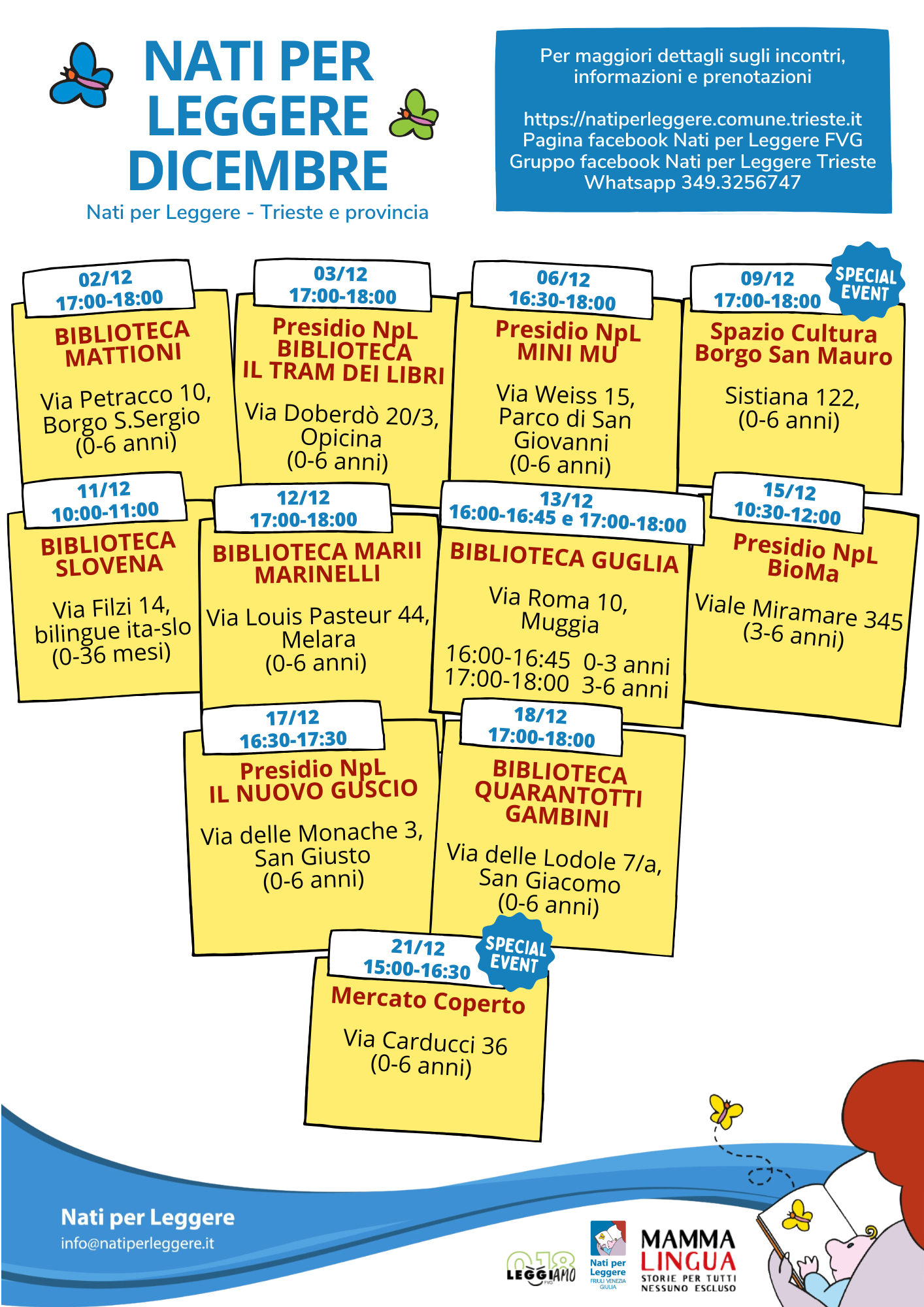 Nel mese dedicato alle festività natalizie il Gruppo Nati per Leggere Trieste, in collaborazione con varie realtà pubbliche e private cittadine, organizza gli ultimi undici incontri del 2024.