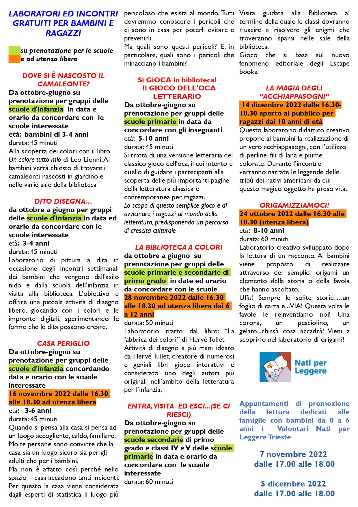 Le letture e i laboratori sono gratuiti, ma è necessaria la prenotazione fino ad esaurimento dei posti disponibili.