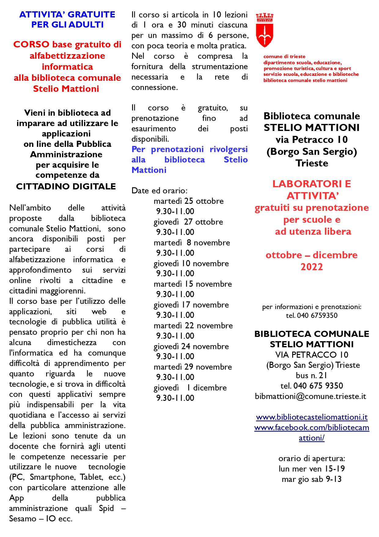 La biblioteca comunale Stelio Mattioni promuove nei mesi di ottobre e dicembre 2022