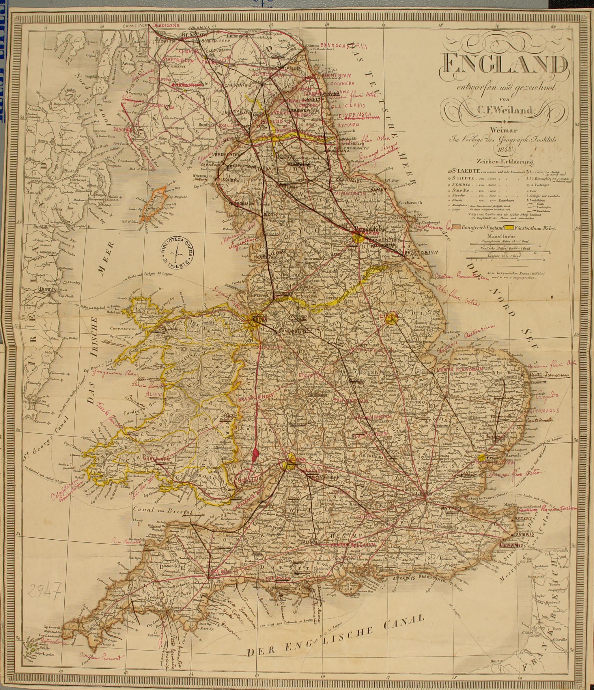 *England / entworfen und gezeichnet von C. F. Weiland. - Geographische meilen 10[=5,4 cm, circa 1:1 400 000]. - Weimar : Im Verlage des Geograph. Instituts, 1848. - 1 carta geografica : acqf. ; 52x44,2 cm