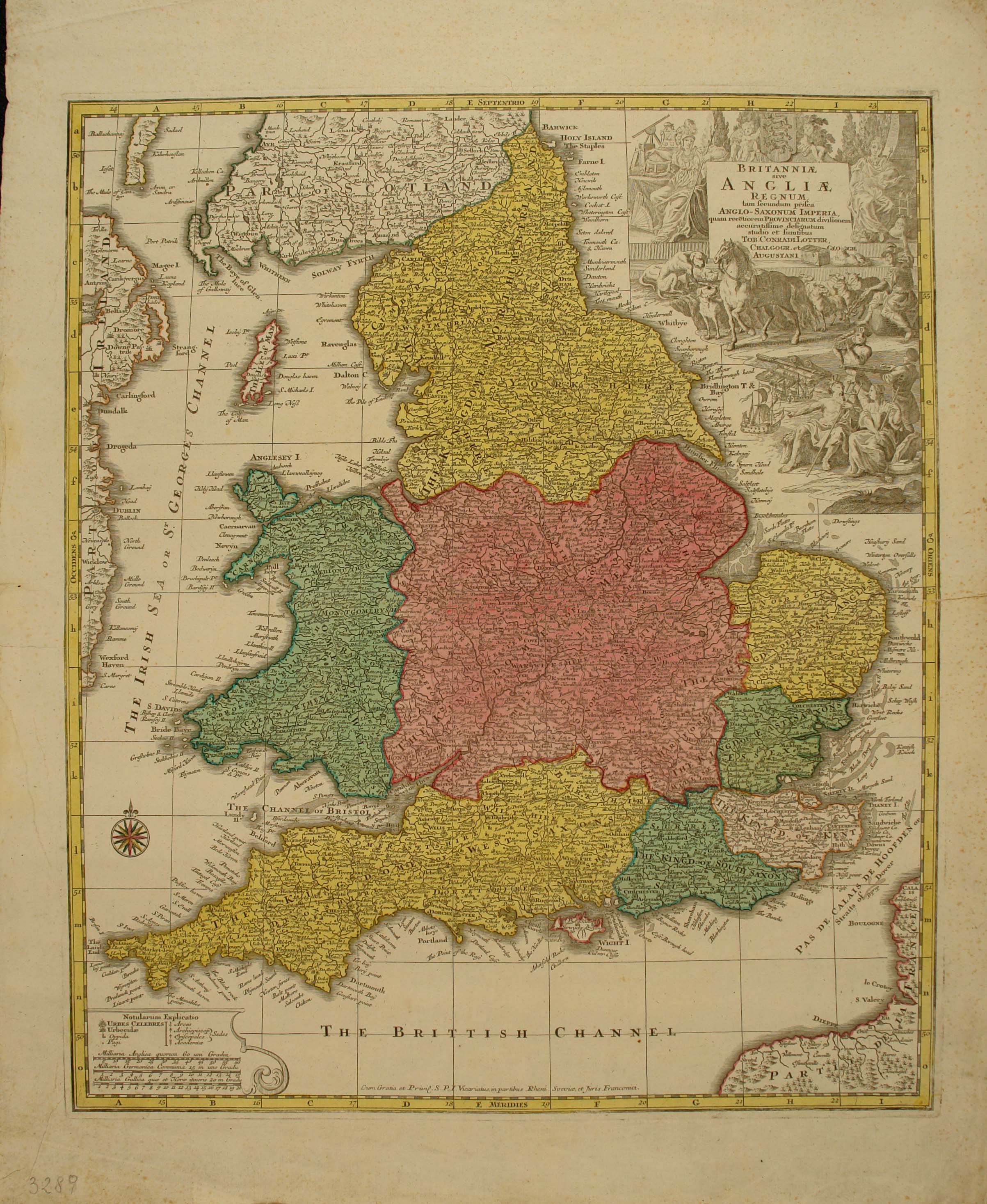*Britanniæ, sive Angliæ Regnum, tam secundum prisca Anglo-Saxonum Imperia, quam rece[n]tiorem Provinciarum divisionem accuratissime designatum studio et sumtibus Tob. Conradi Lotter chalcogr. et geogr. Augustani. - Milliaria Germanica communia 15[=8,4 cm, circa 1:1 300 000]. - [Augsburg] : T. C. Lotter, [17..]. - 1 carta geografica : acqf. color. ; 57x48 cm. ((Cfr: http://gateway-bayern.de/BV000745232.