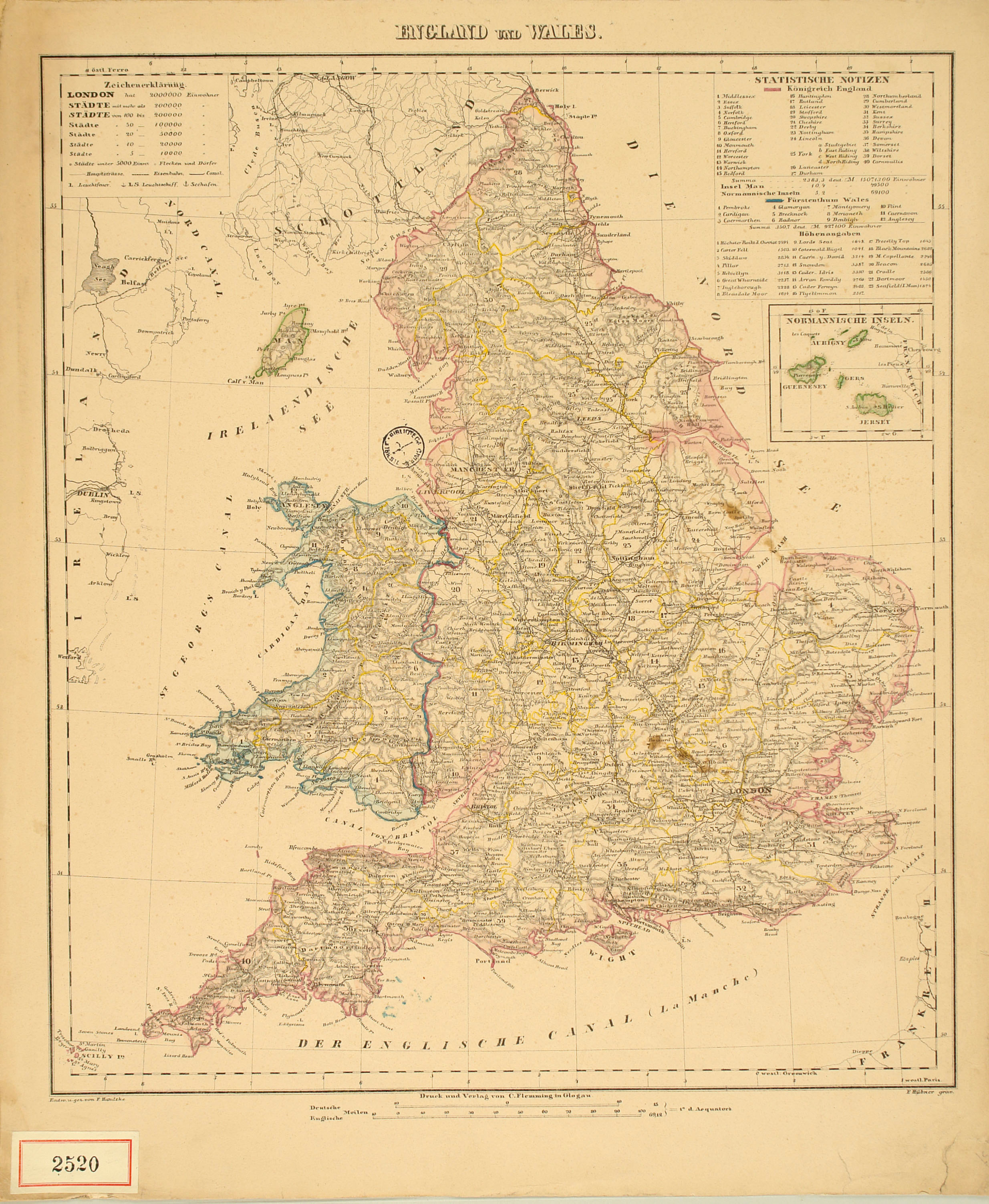 *England und Wales / entw. u. gez. von F. Handkte ; F. Hübner grav. - Deutsche Meilen 10=[4,2 cm circa 1:1 700 000]. - Glogau : Druck und Verlag von C. Flemming, [184.?]. - 1 carta geografica : litografia color.; 39x34 cm.