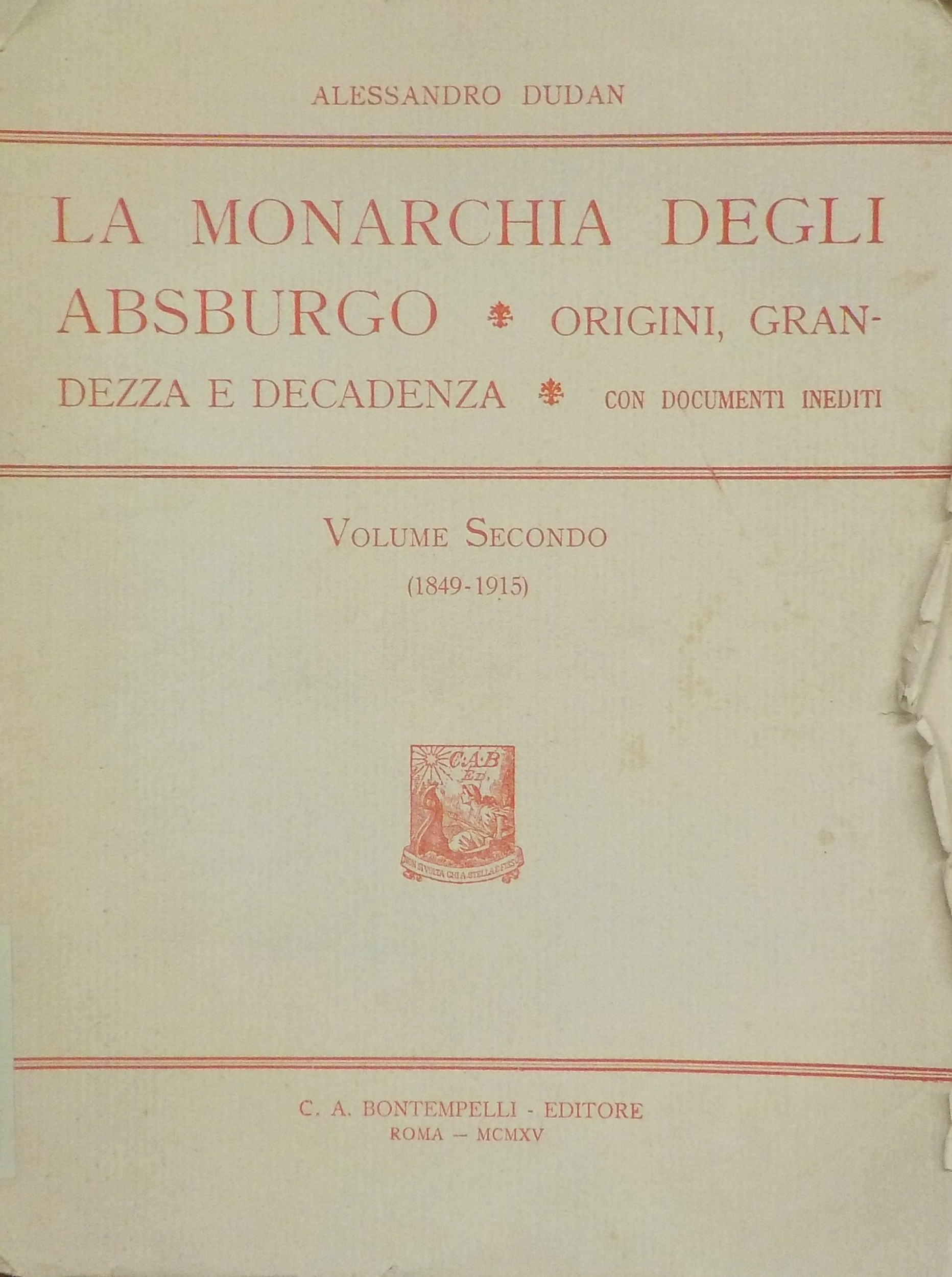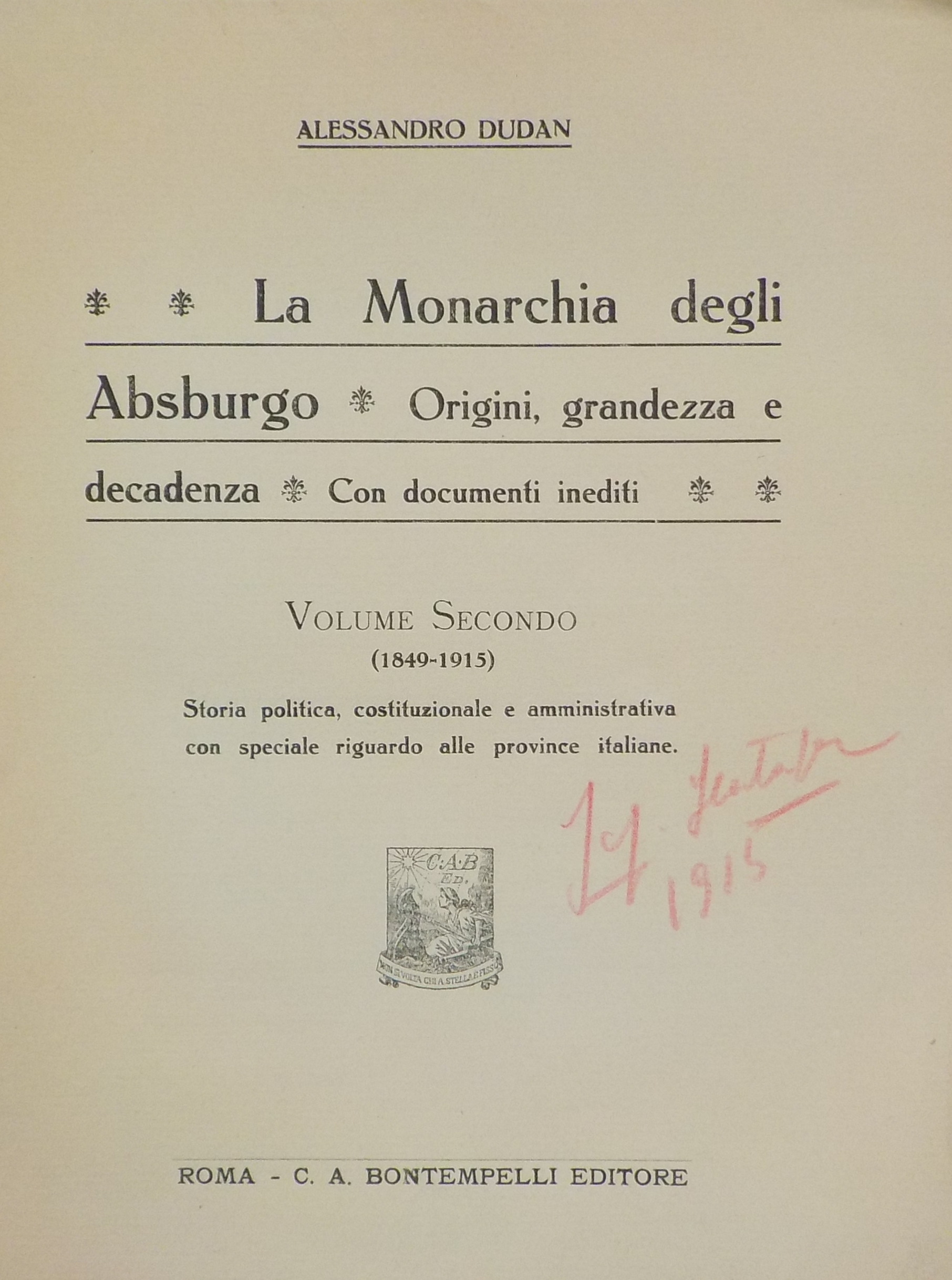 <> 2: (1849-1915) : storia politica, costituzionale e amministrativa con speciale riguardo alle province italiane / Alessandro Dudan. - Roma : C. A. Bontempelli, 1915. - 296 p. ; 24 cm.