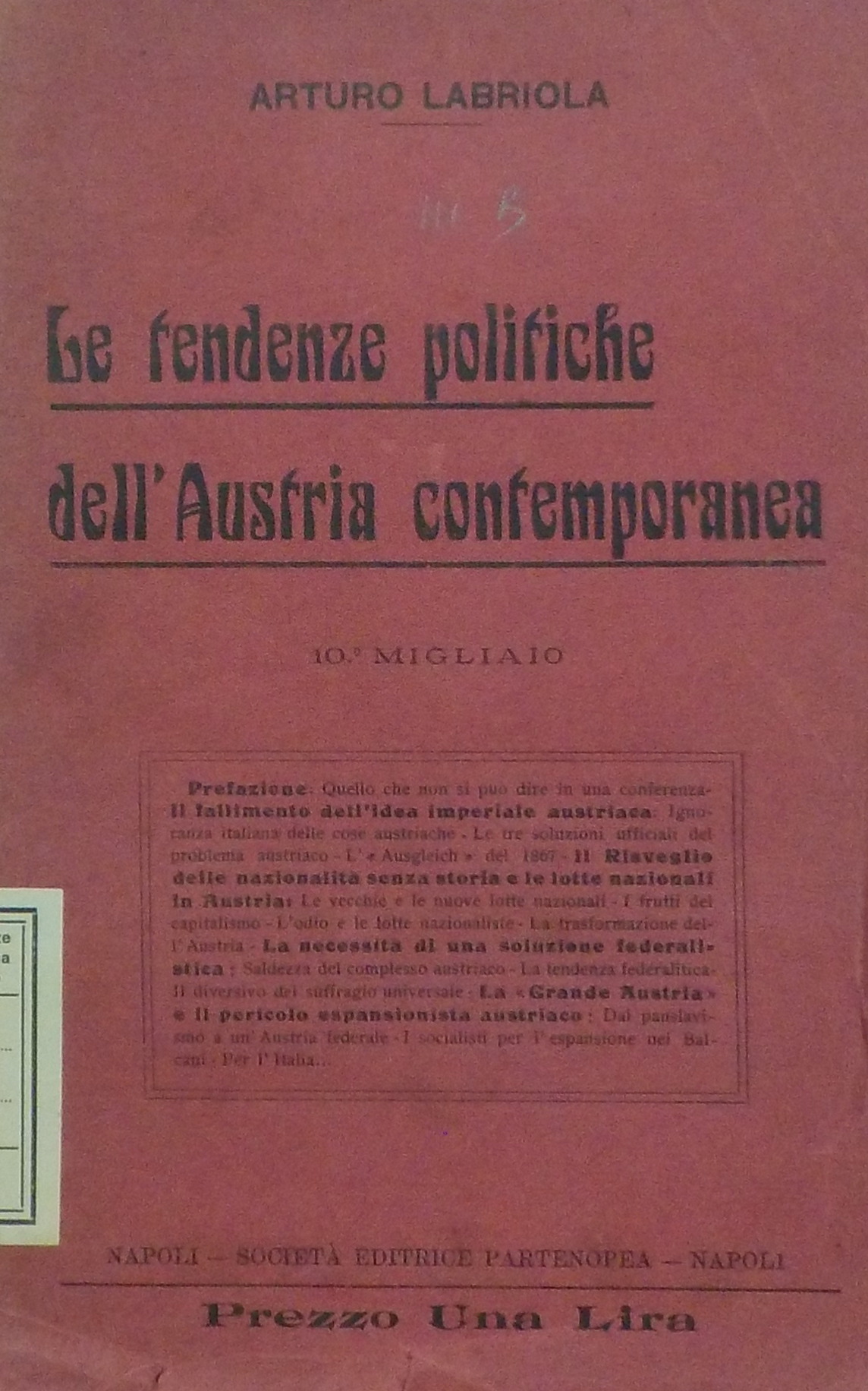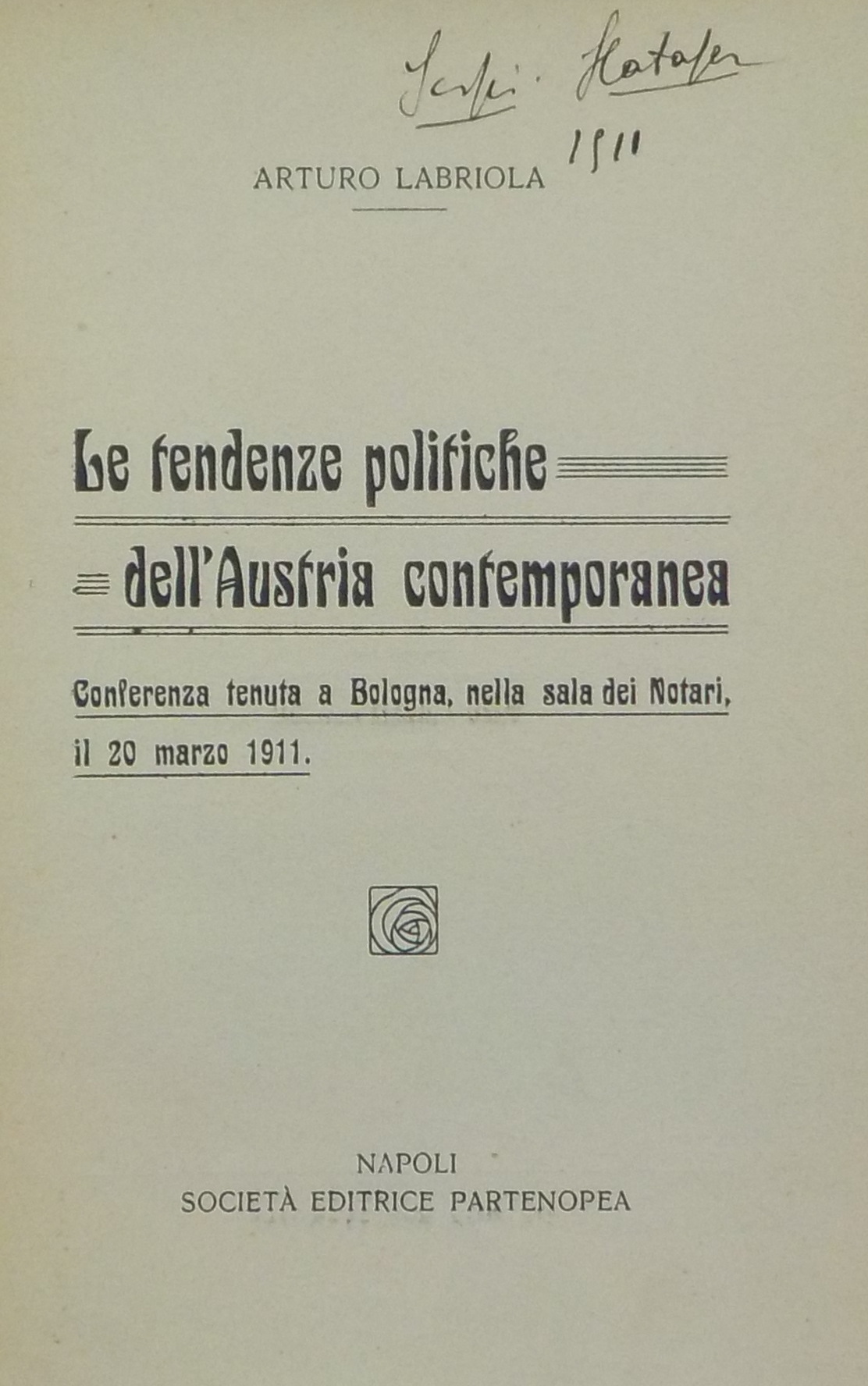 Le *tendenze politiche dell'Austria contemporanea : conferenza tenuta a Bologna, nella Sala dei Notari, il 20 marzo 1911 / Arturo Labriola. - Napoli : Società editrice partenopea, pref. 1911. - 89 p. ; 17 cm.