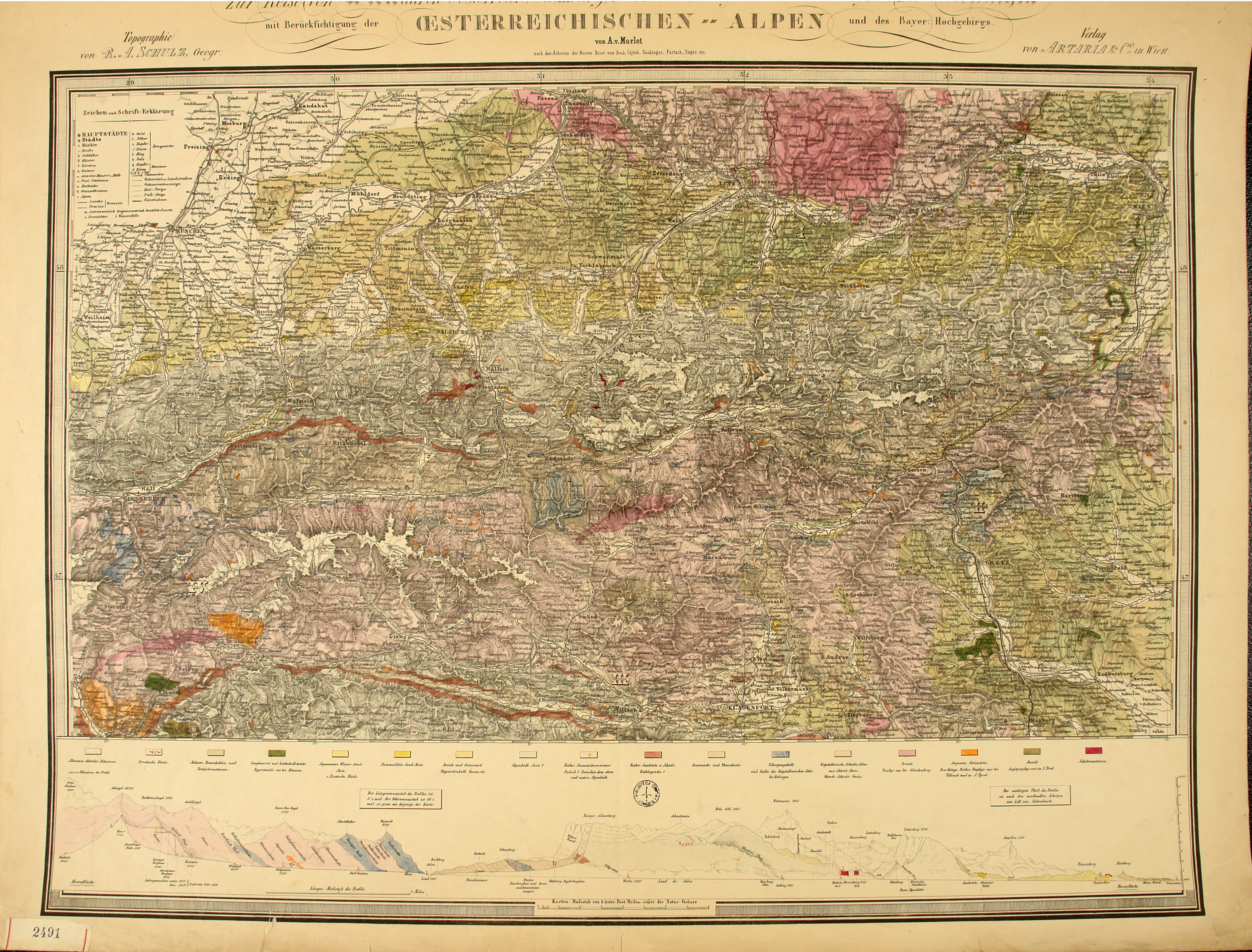 *Geologische Uibersichts Karte zur Reise von Wien durch Oesterreich, Salzburg, Kärnthen, Steyermark und Tyrol bis München : mit Berücksichtigung der Oesterreichischen-Alpen und des Bayer. Hochgebirgs / von A. v. Morlot ; topographie von R. A. Schulz. - Scala 1:576.000. - Wien : Artaria & C., [1847?]. - 1 carta corografica : color. ; 513x708 mm su foglio 604x774 mm. ((Sotto il titolo: Nach den Arbeiten der Herren Boué von Buch, Cžjžek, Haidinger, Partsch, Unger etc. - La data di pubblicazione si ricava dal catalogo della Biblioteca Nazionale Austriaca http://data.onb.ac.at/rec/AC04069638