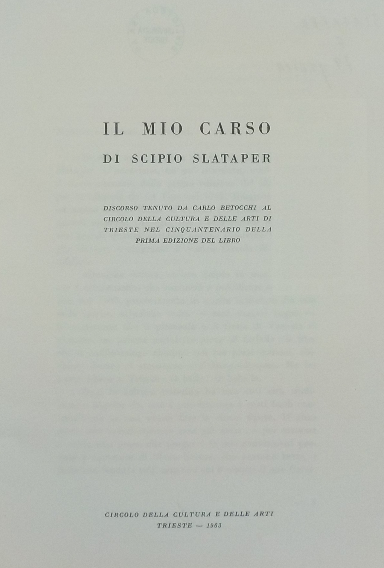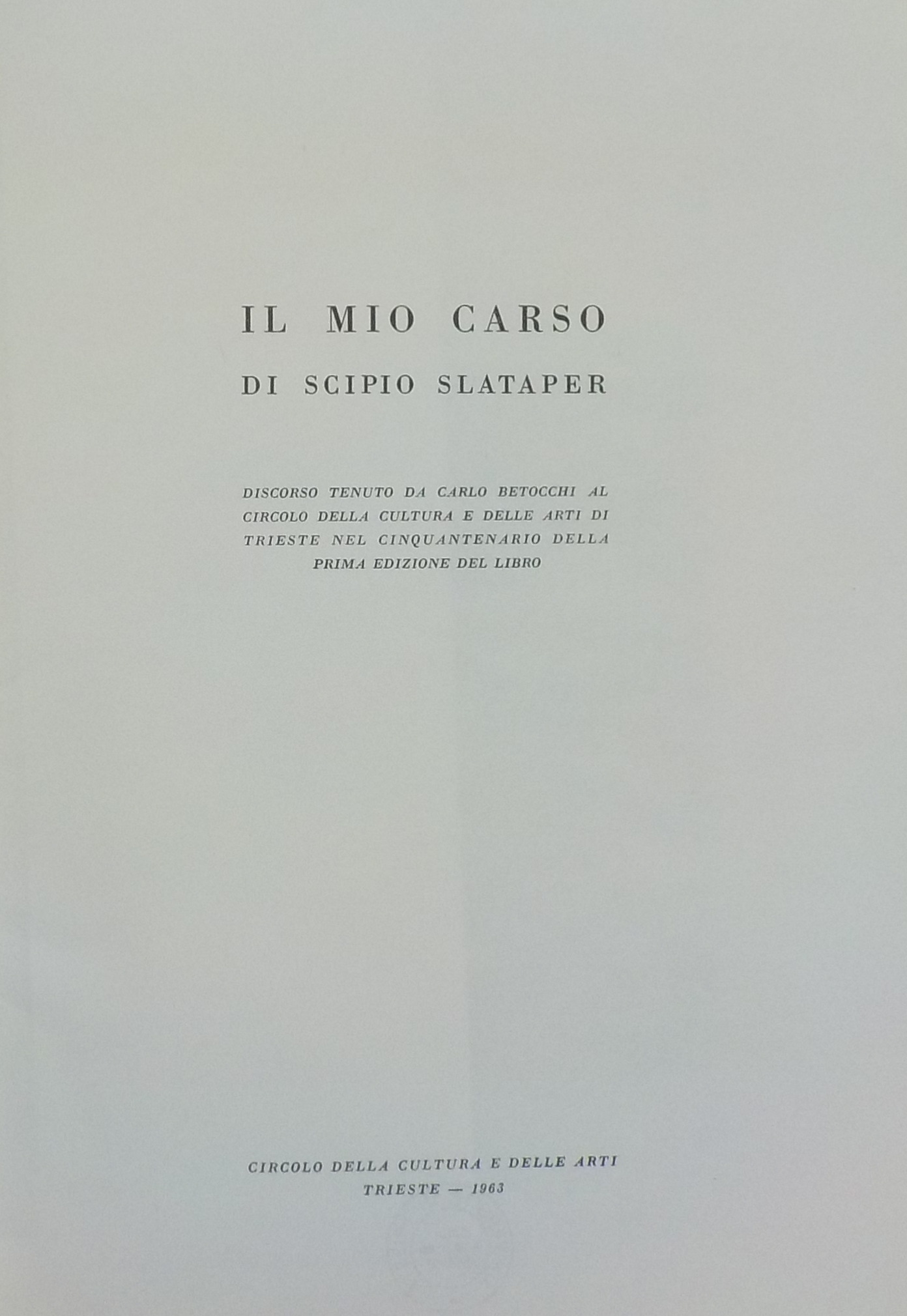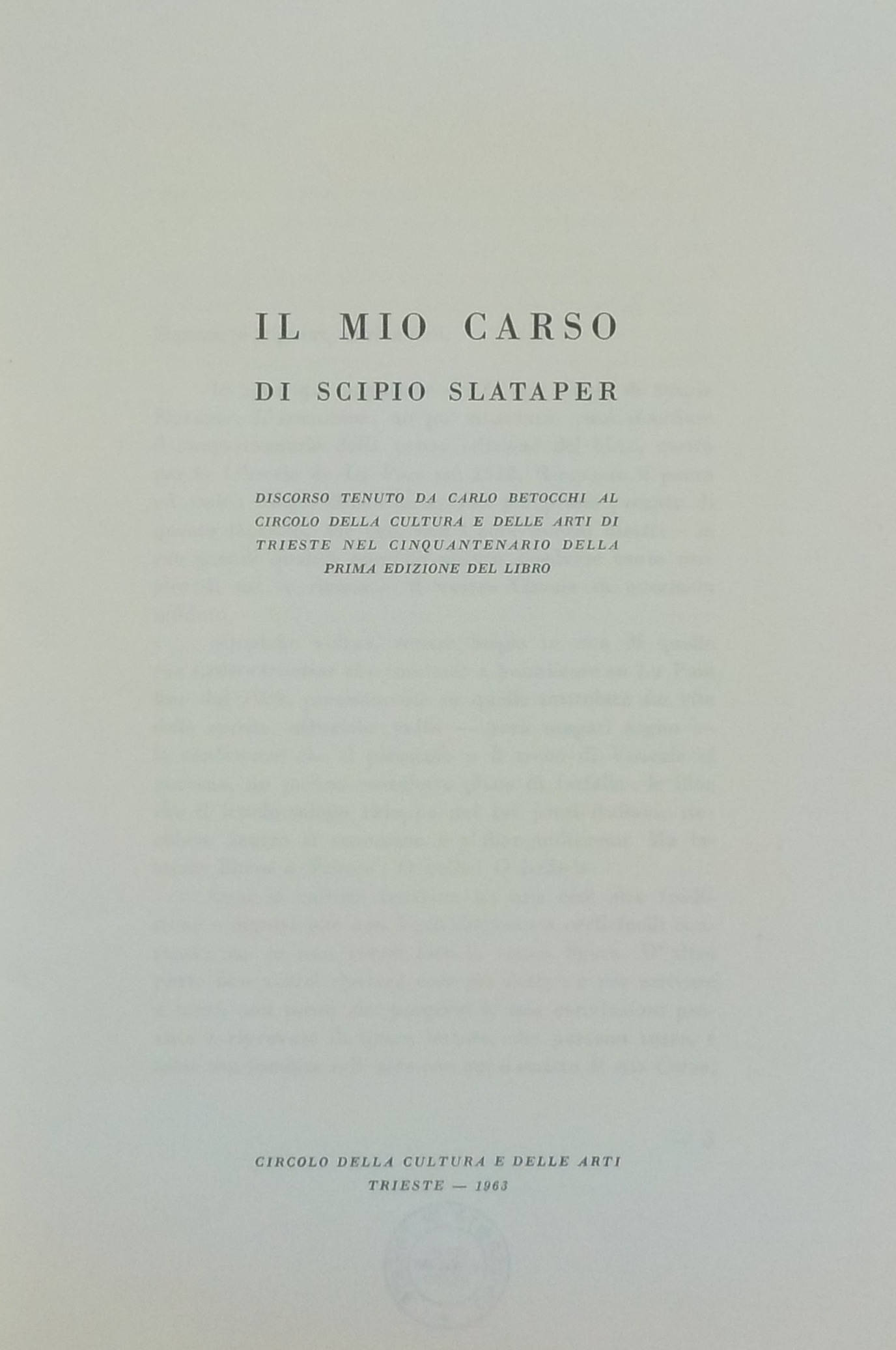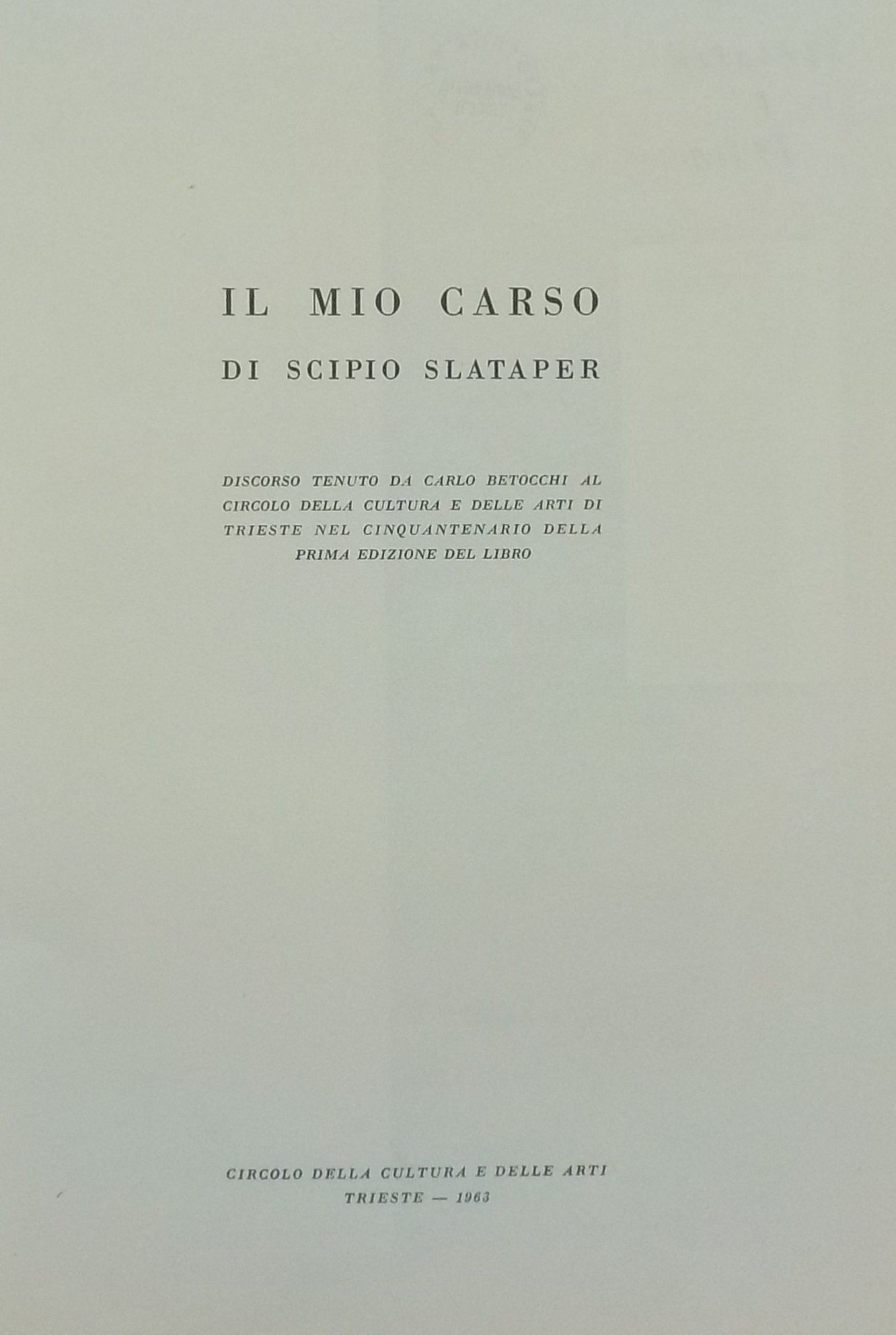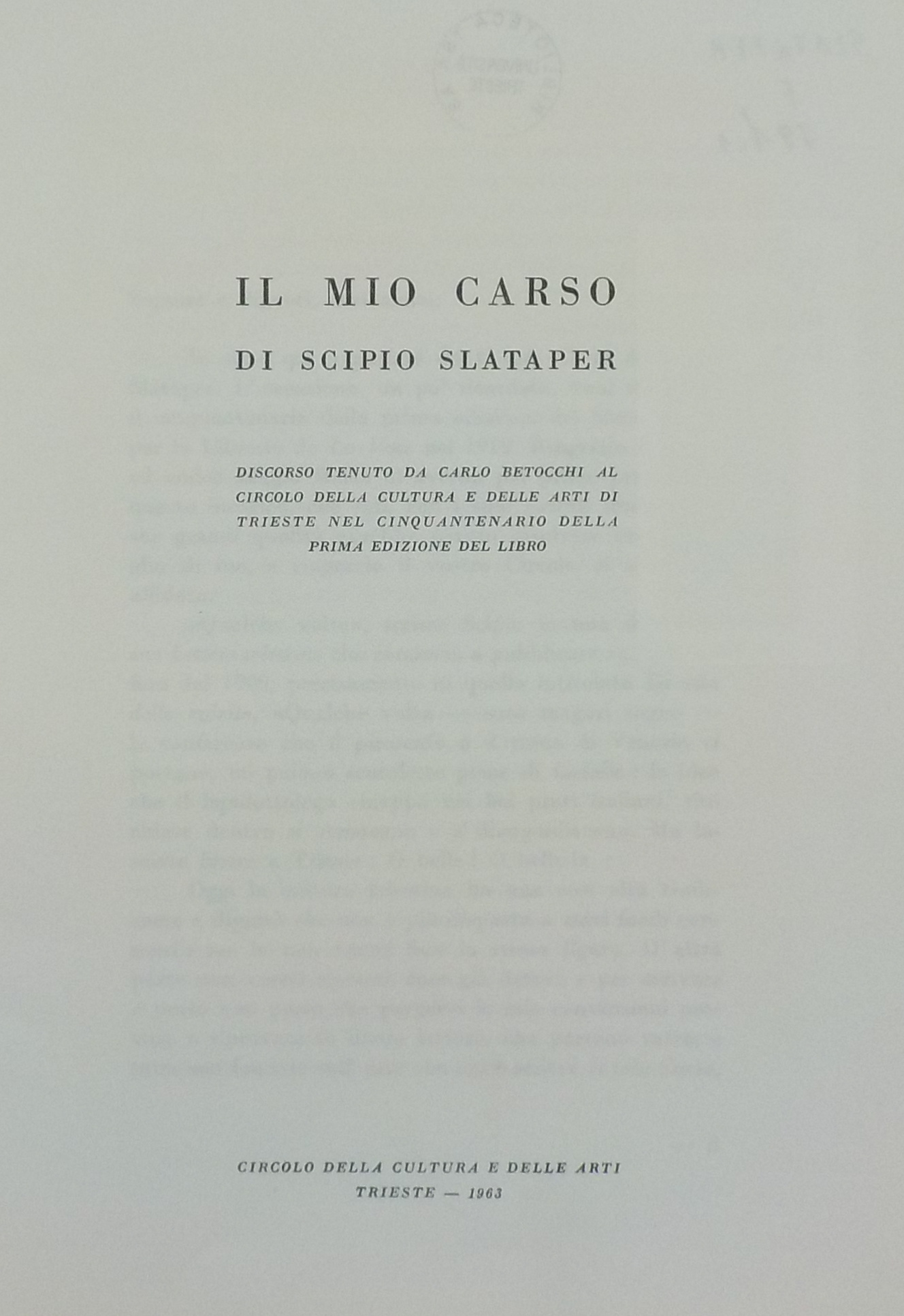 Il *mio Carso di Scipio Slataper : discorso tenuto da Carlo Betocchi al Circolo della cultura e delle arti di Trieste nel cinquantenario della prima edizione del libro. - Trieste : Circolo della cultura e delle arti, 1963. - 25 p., [1] c. di tav. : ritr. ; 24 cm.