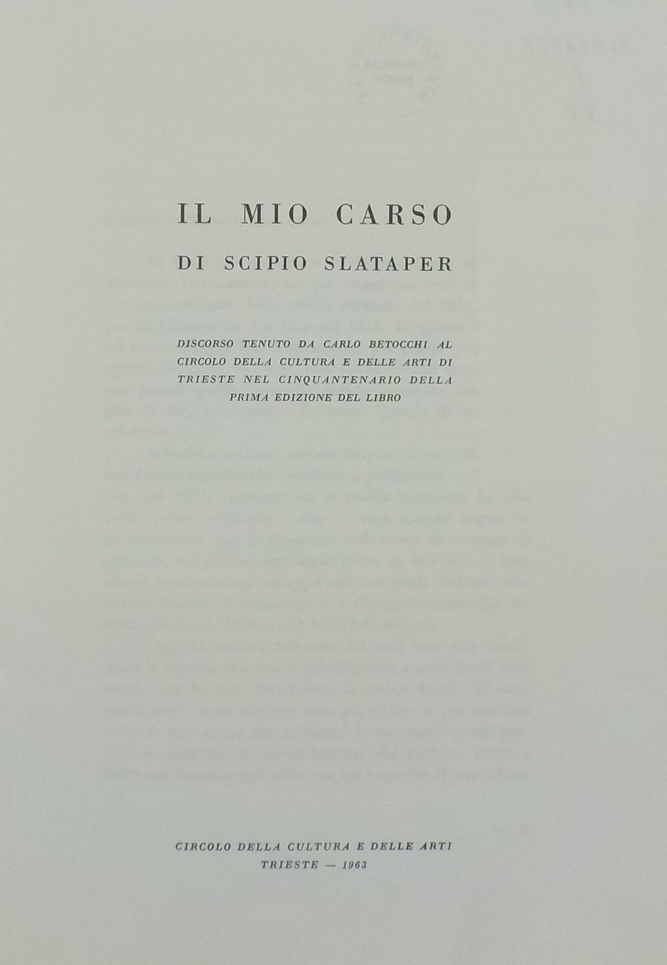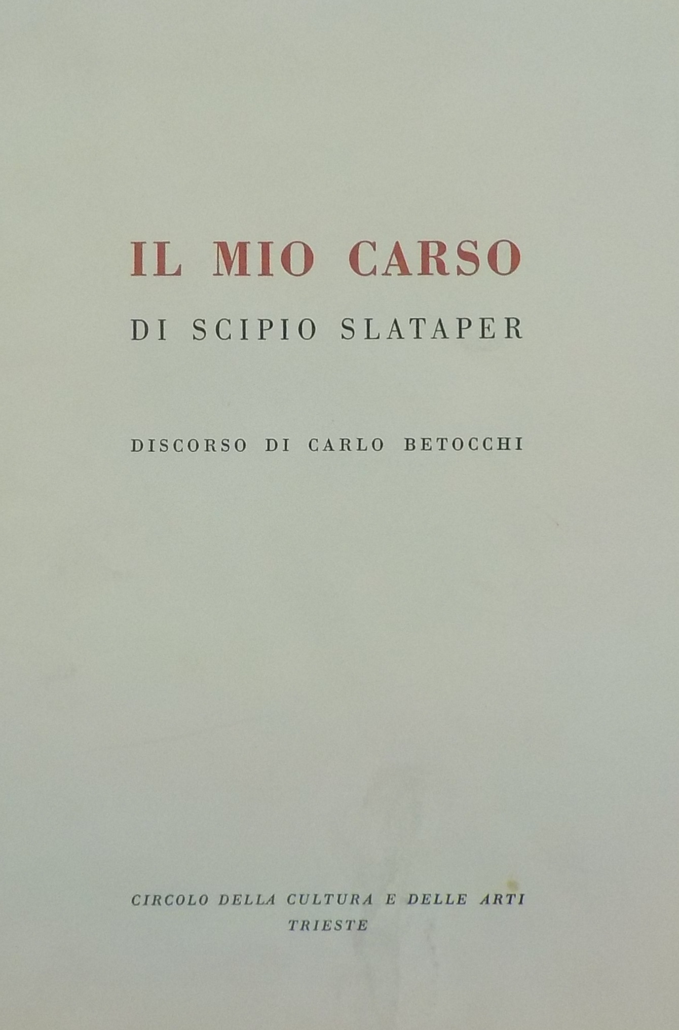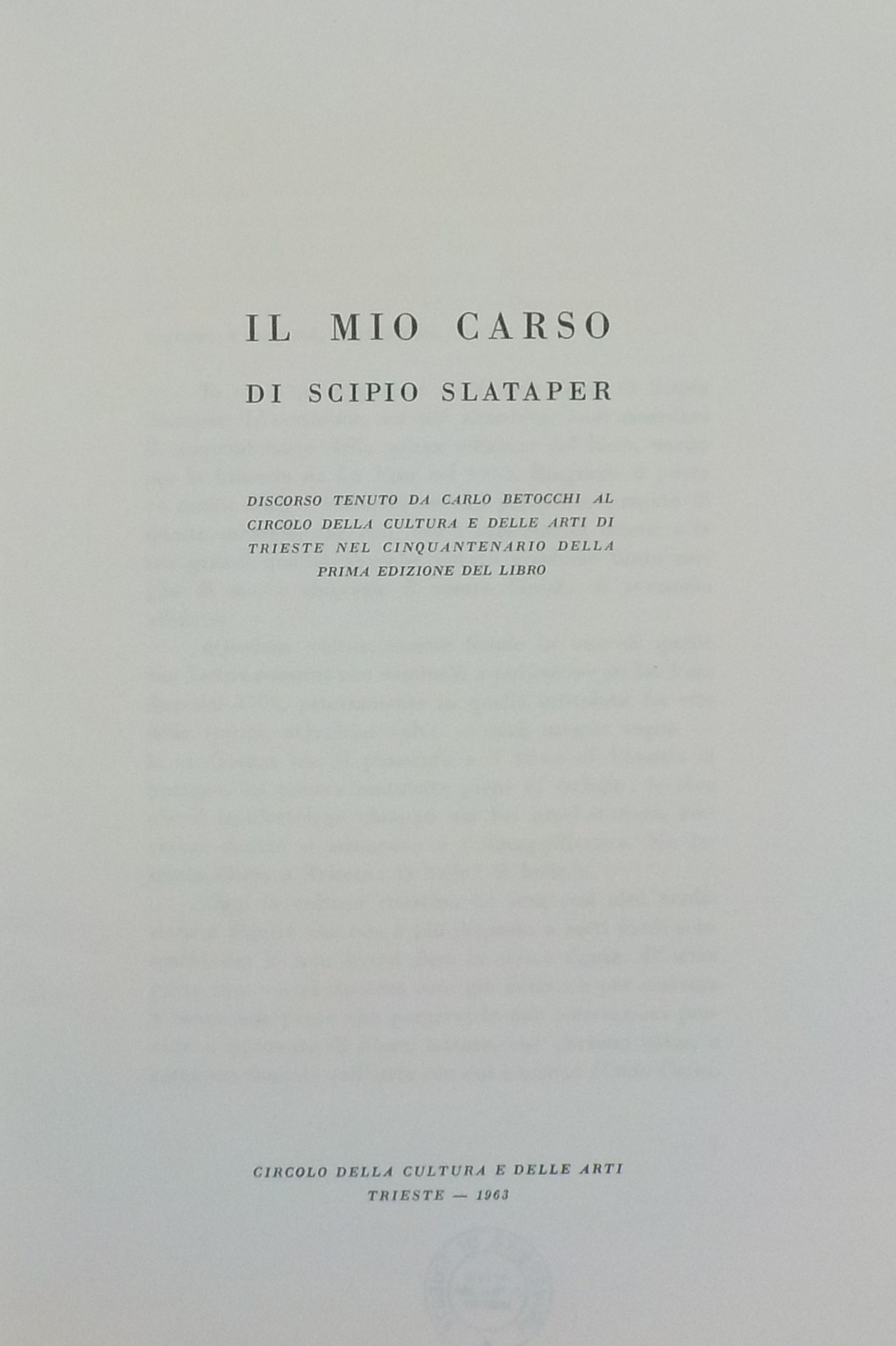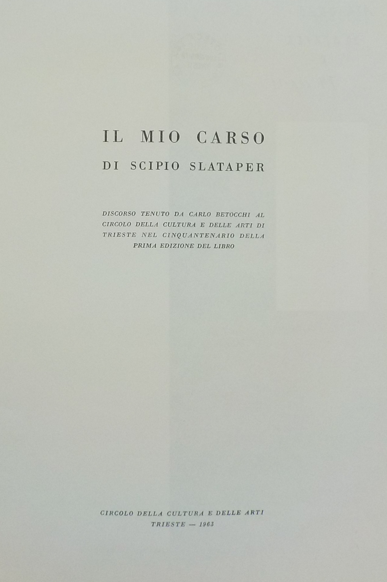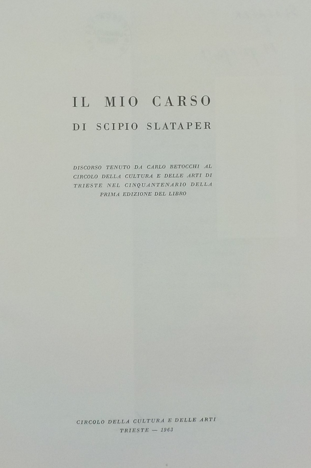 Il *mio Carso di Scipio Slataper : discorso tenuto da Carlo Betocchi al Circolo della cultura e delle arti di Trieste nel cinquantenario della prima edizione del libro. - Trieste : Circolo della cultura e delle arti, 1963. - 25 p., [1] c. di tav. : ritr. ; 24 cm.