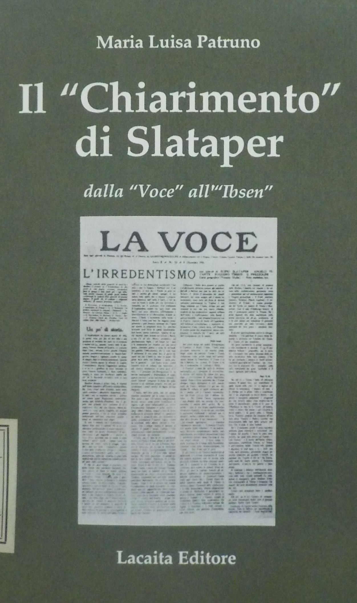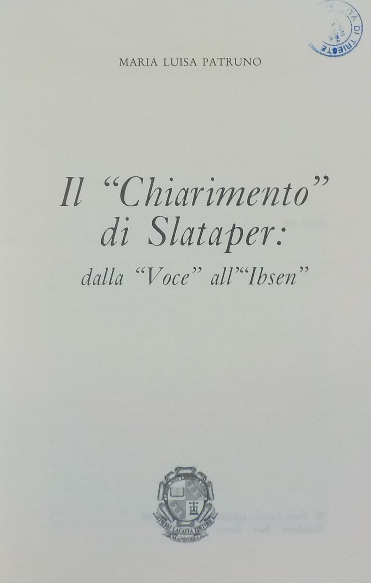 Il *chiarimento di Slataper : dalla Voce all'Ibsen / Maria Luisa Patruno. - Manduria \ecc.! : P. Lacaita, \1987!. - 173 p. ; 22 cm.