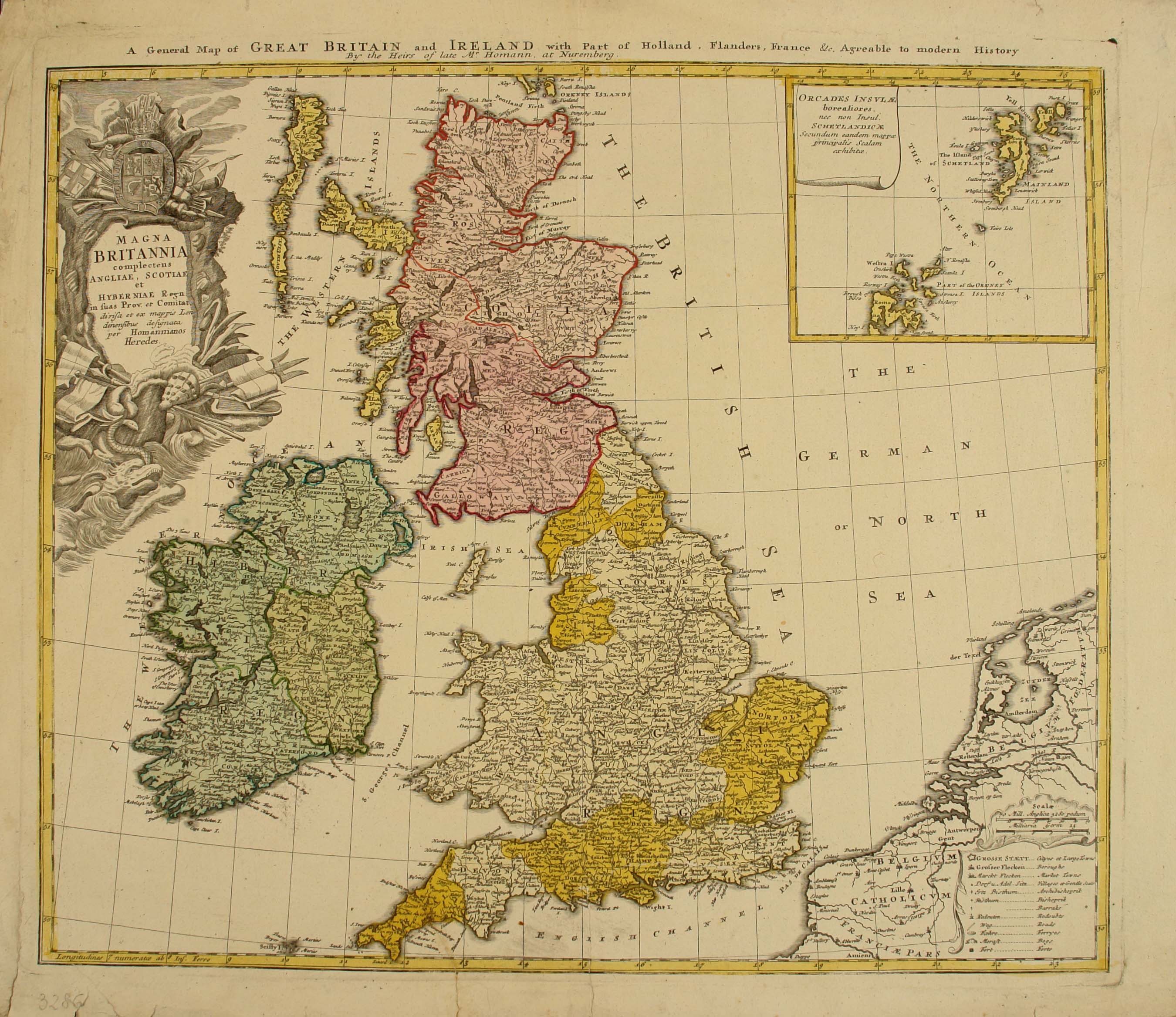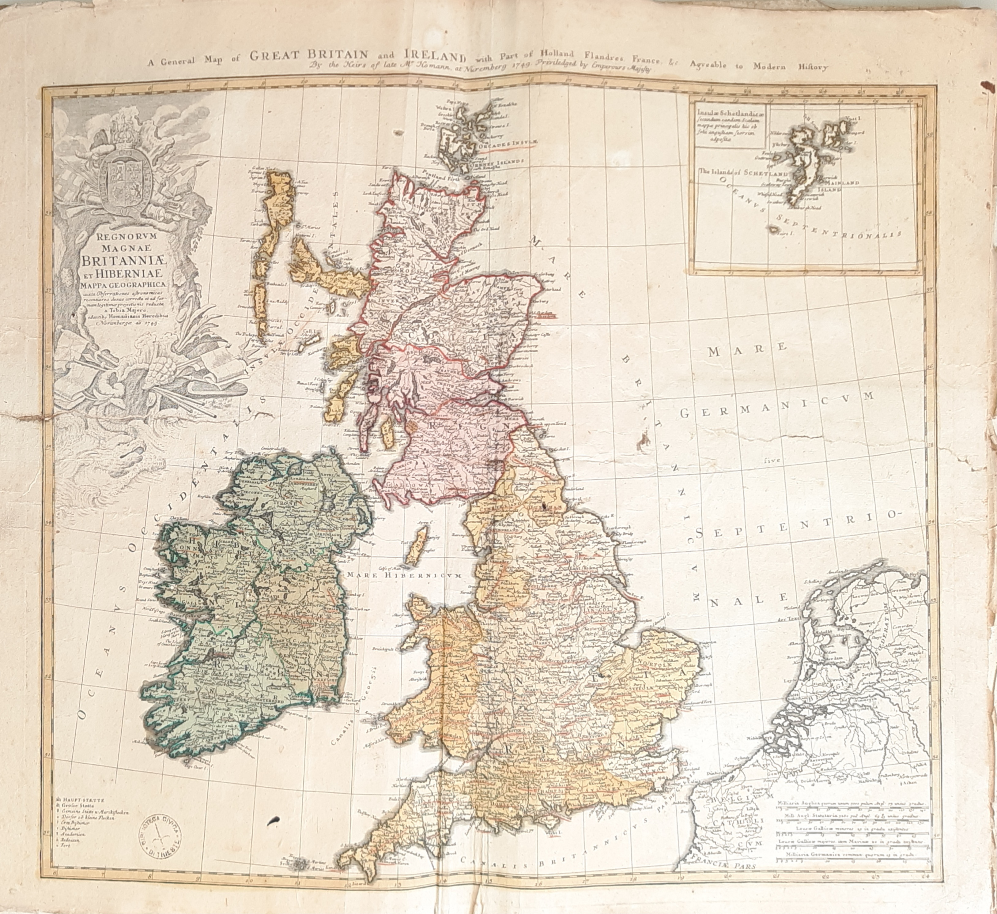 A *general map of Great Britain and Ireland with part of Holland Flandres, France, & c. agreable to modern history ; Insulae Schetlandicae. - Milliaria Germanica 30[=9 cm, circa 1:2 500 000]. - Norimberga : Heredi d'Homann, 1749. - 1 carta geografica : color. ; 469x541 mm.
