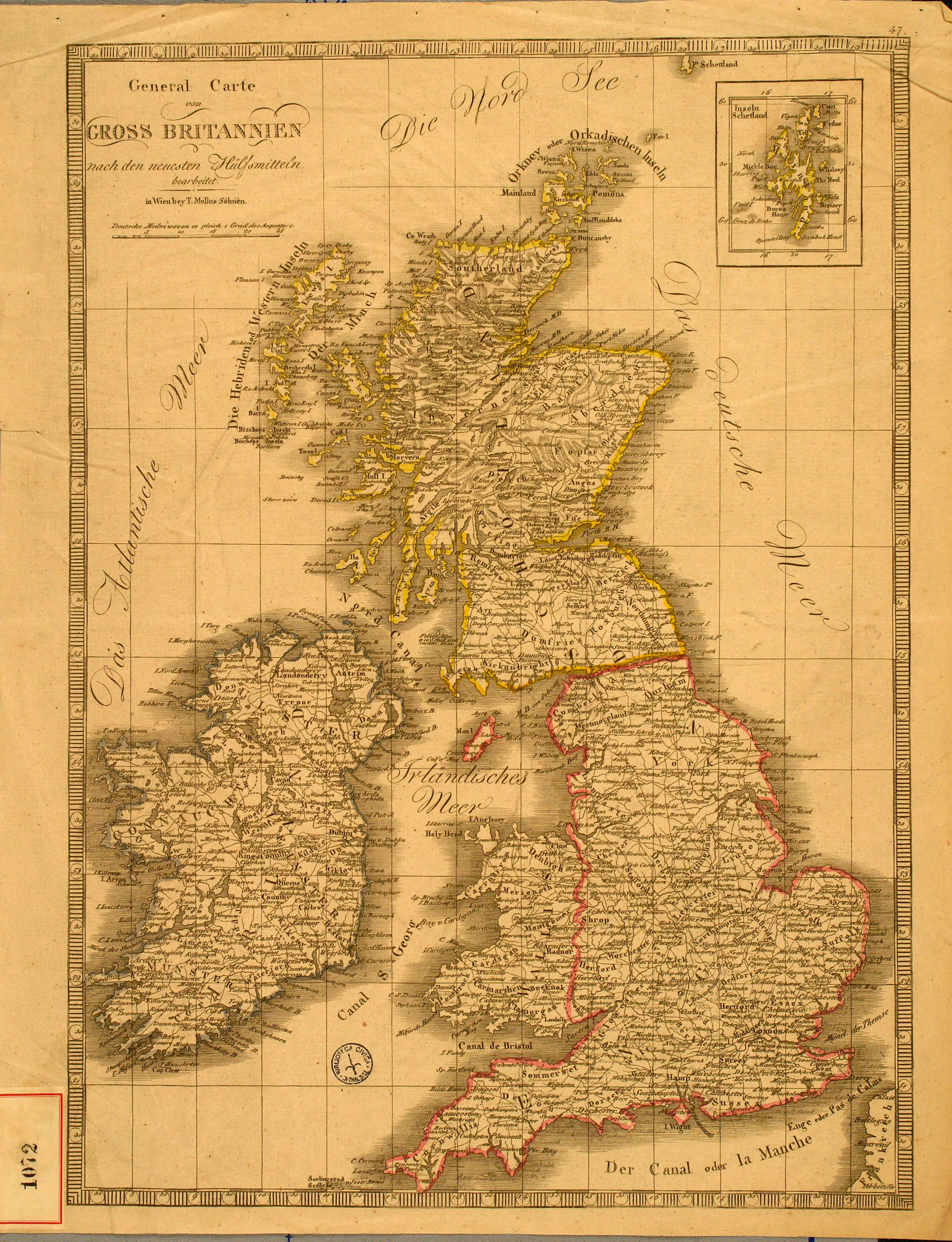 *General Carte von Gross Britannien nach den neuesten Hülfsmitteln bearbeitet. - [Scala 1:1.000.000 ca.]. - Wien : T. Mollos Söhnen, [1800?]. - 1 c. geogr. : color. ; 437x310 mm.