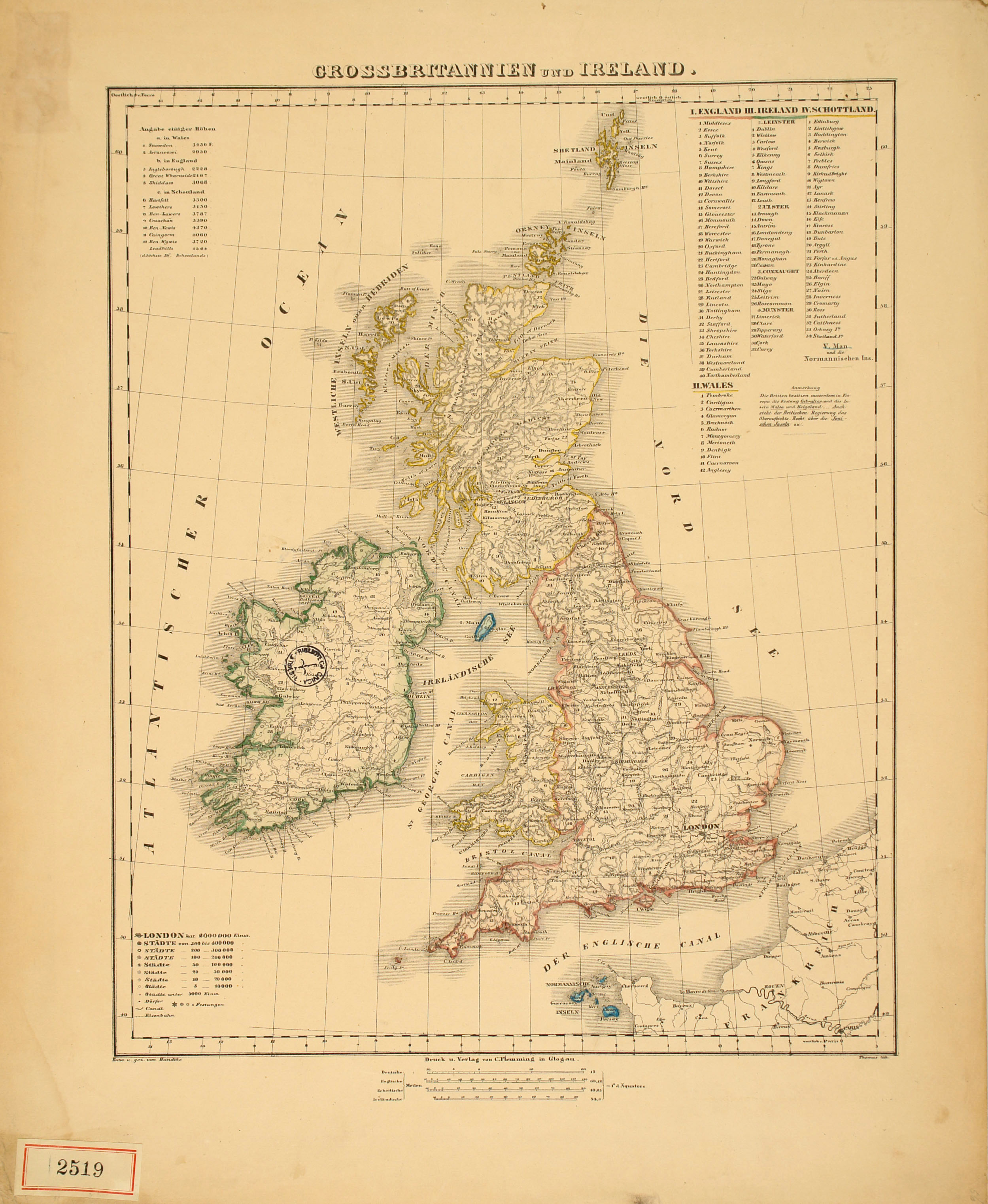 *Grossbritannien und Ireland / entw. u. gez. von Handkte ; Thomas lith. - Deutsche Meilen 20=[4 cm circa 1:3 700 000]. - Glogau : Druck u. Verlag von C. Flemming, [184.?]. - 1 carta geografica : litografia color.; 37x30 cm.