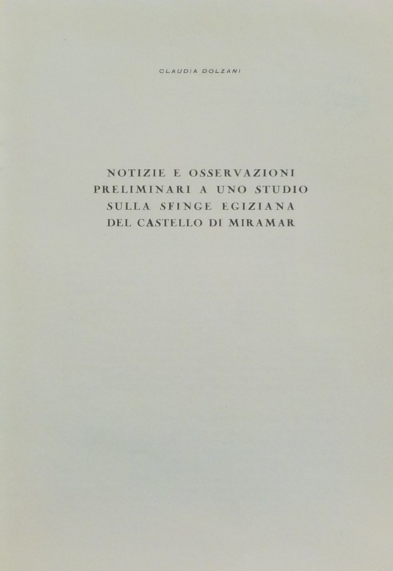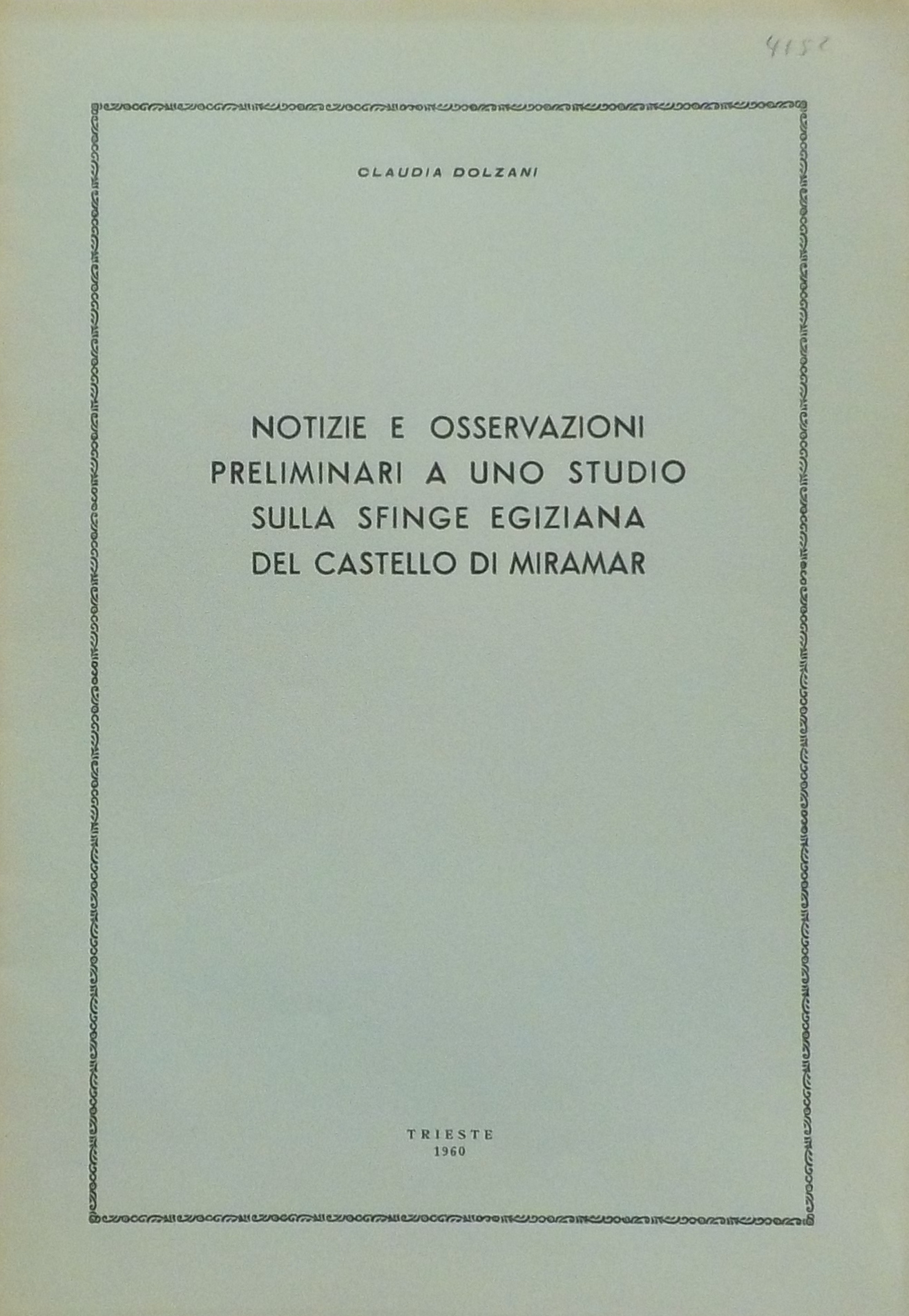 *Notizie e osservazioni preliminari a uno studio sulla sfinge egiziana del castello di Miramar / Claudia Dolzani. - Trieste : Tipografia Giuliana, 1960. - 11 p. : ill. ; 25 cm. ((Estratto da La Porta Orientale, n. 1-2, gennaio-febbraio 1960. - Comunicazione letta nella sede della società di Minerva il 26 marzo 1960