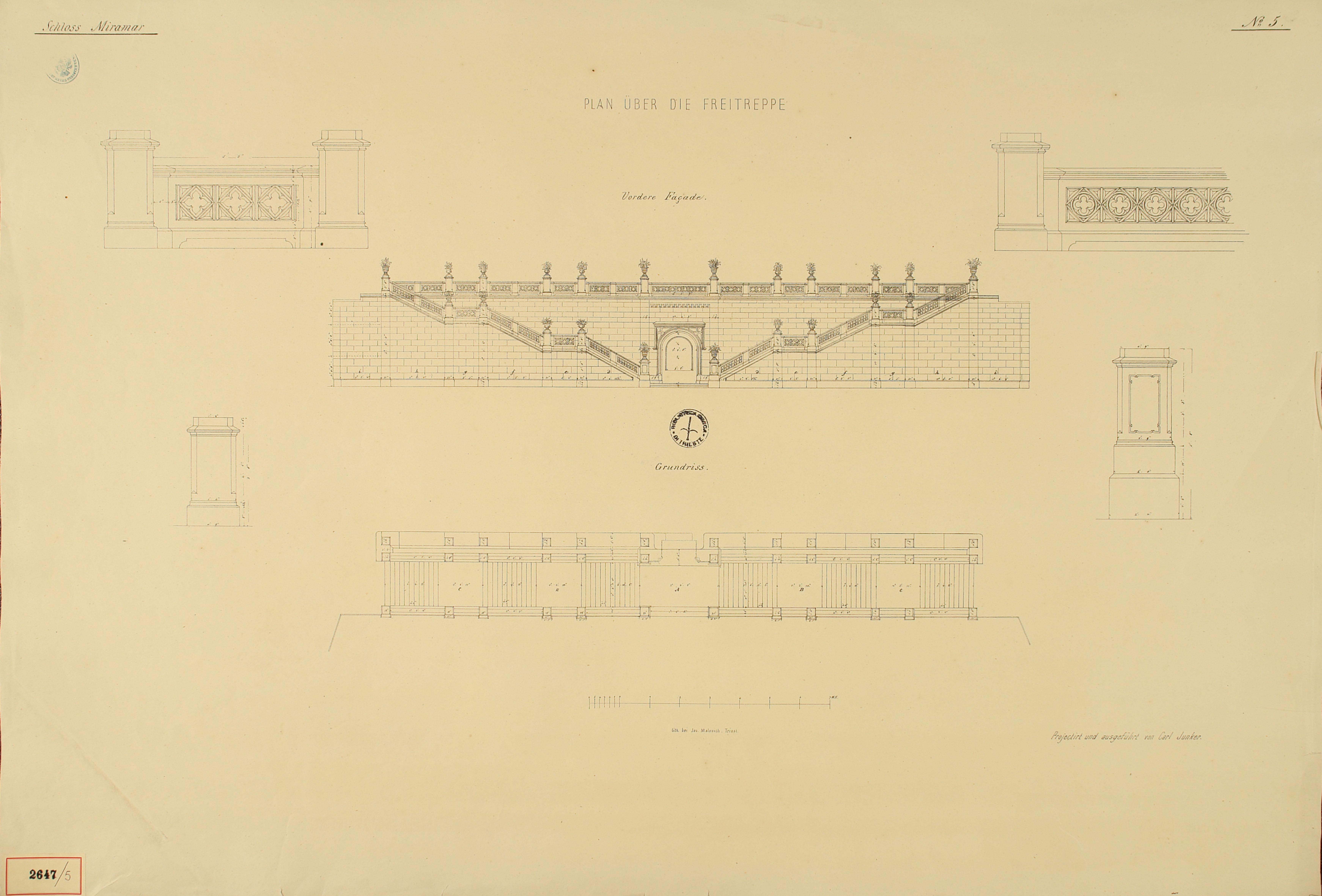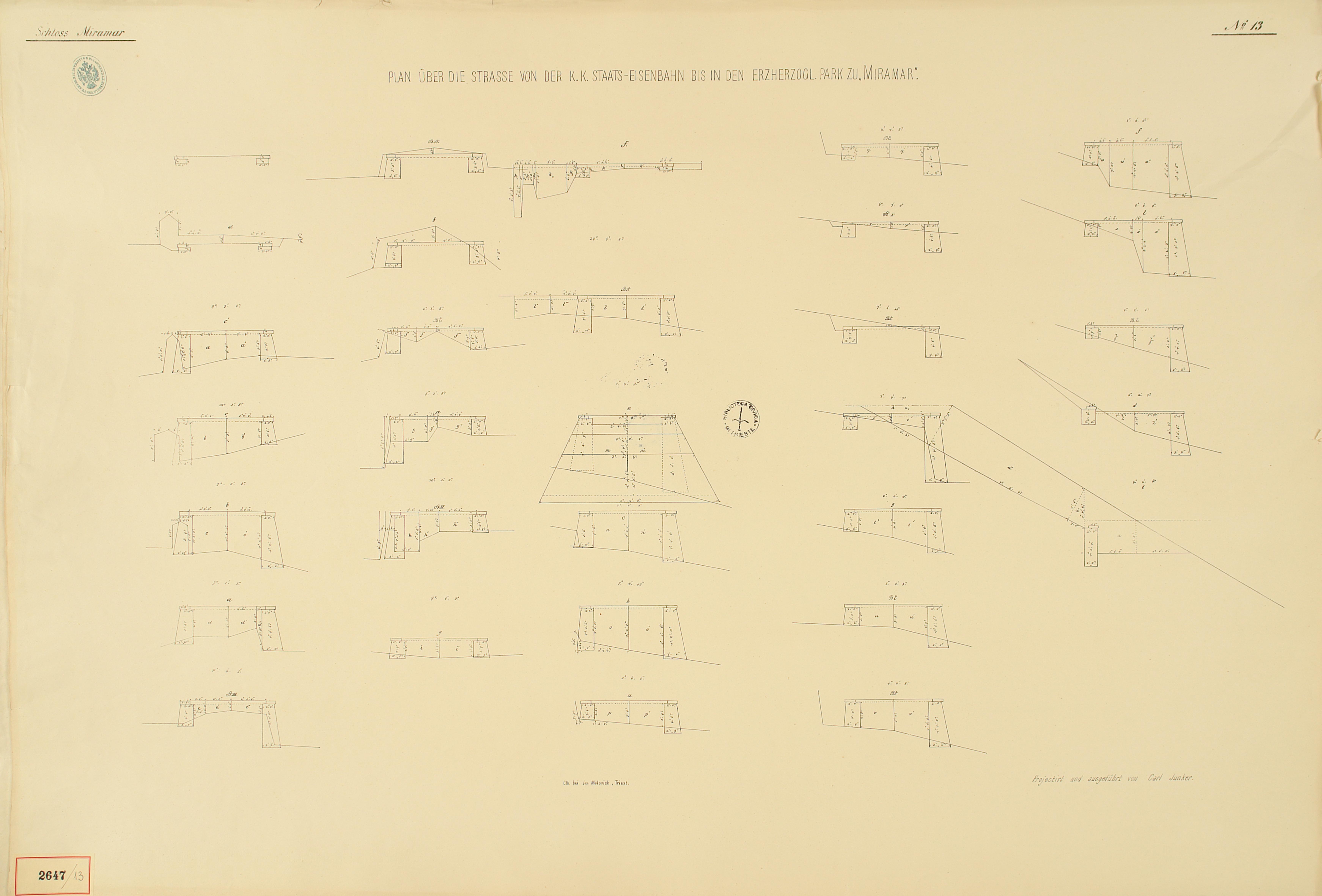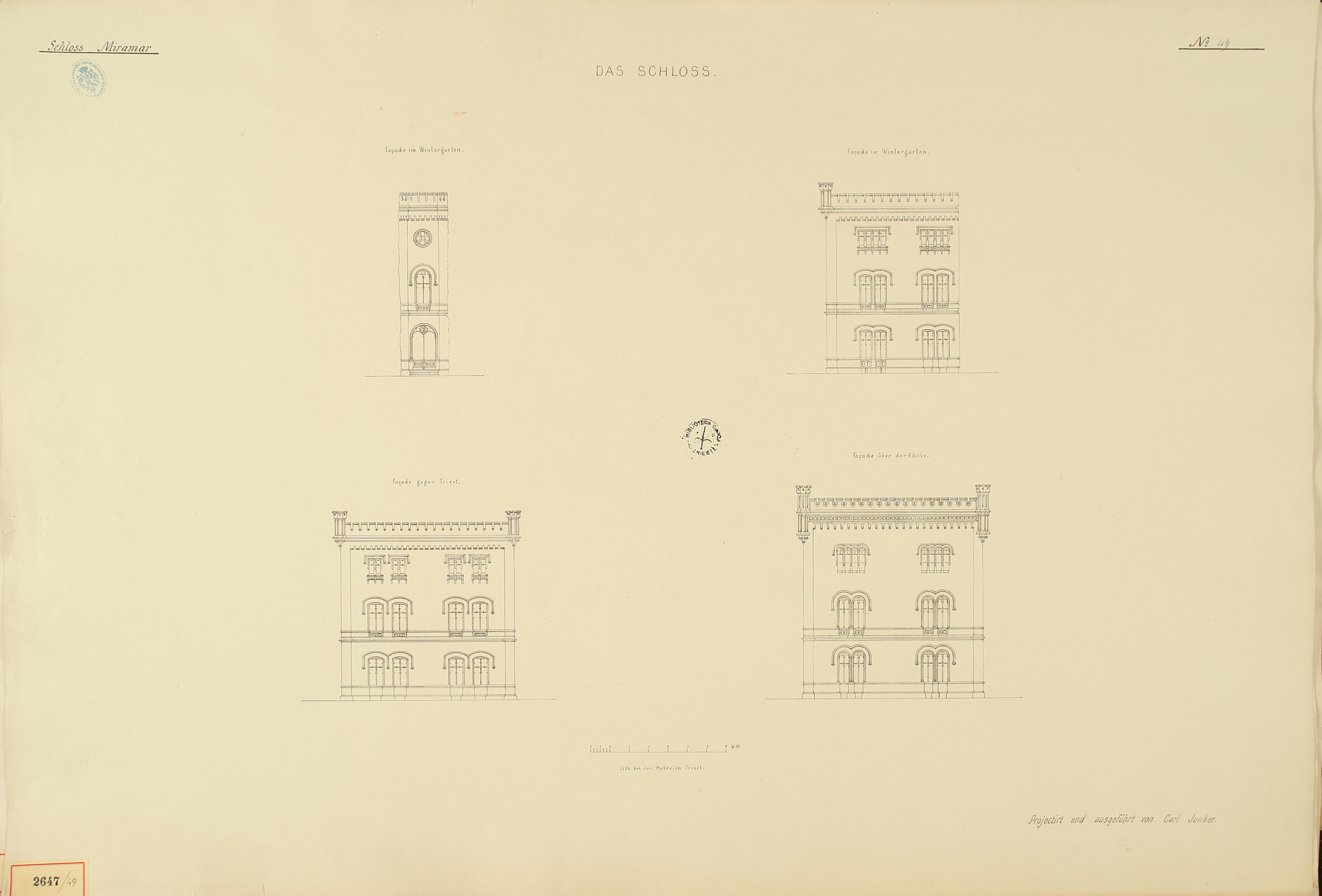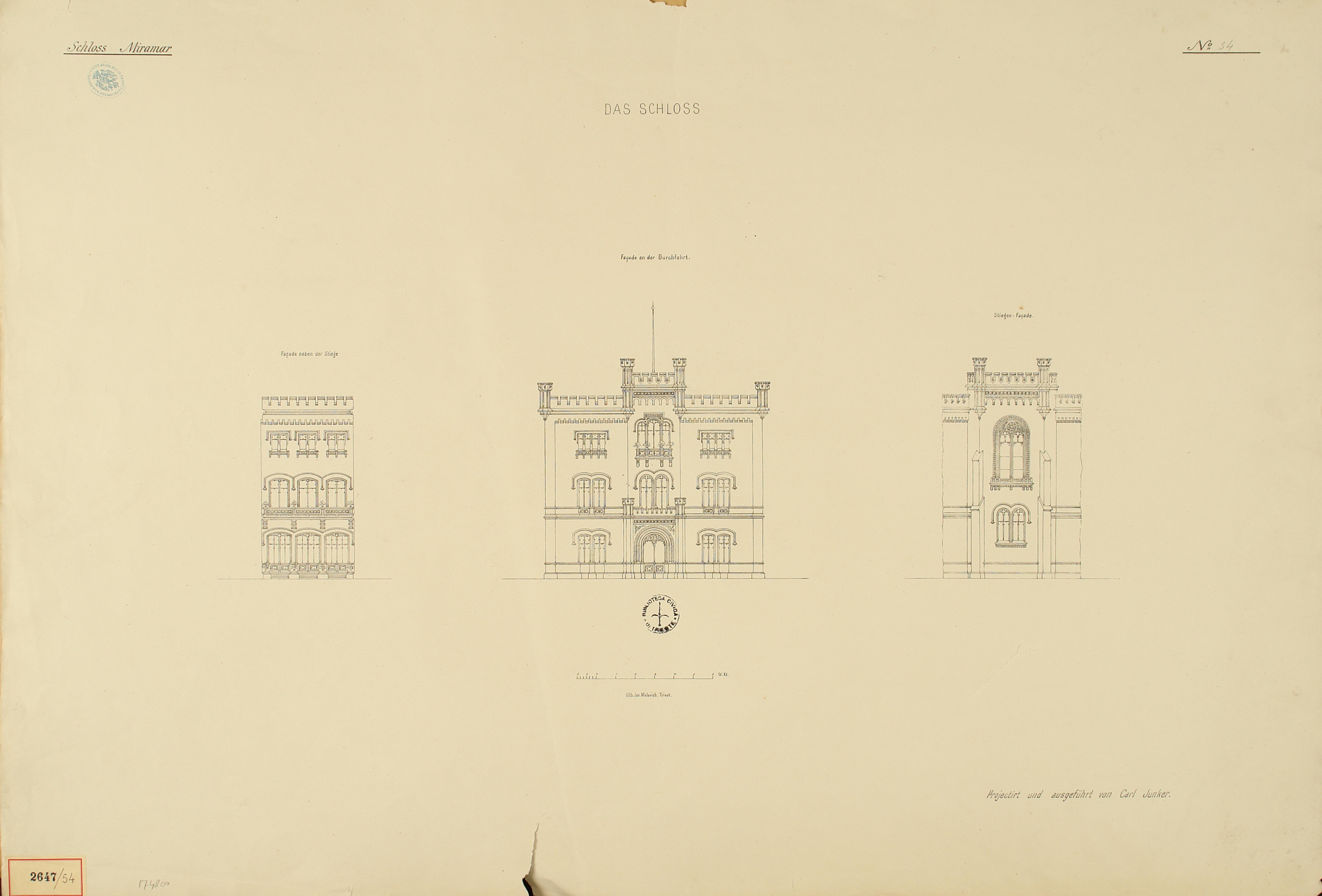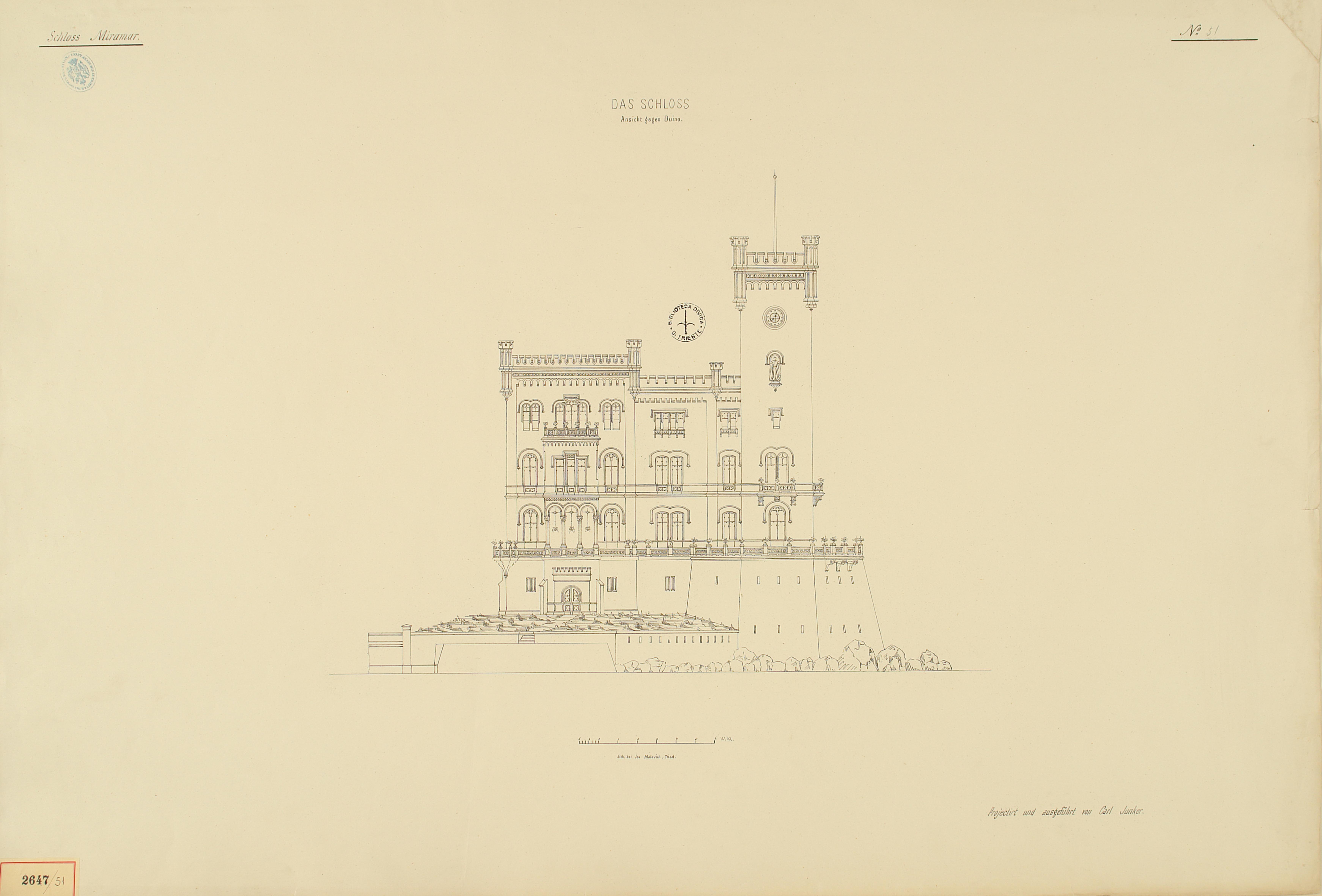 *Schloss Miramar : Im hohen Auftrage seiner k. k. Hoheit des durchlauchtigsten Herrn Erzherzogs Ferdinand Max / Im Zeitraume vom 1. März 1856 bis 27. July 1860, projectirt und ausgeführt von Carl Junker. - Trieste : lith. bei Jos. Malovich, 1856-1860. - 54 tav., 1 pianta e 1 frontespizio : lit. ; 61x90 cm le tav. e 103x142 cm la pianta. ((Tit. della pianta: Situation der Bau- und Garten-Anlagen in Miramar.