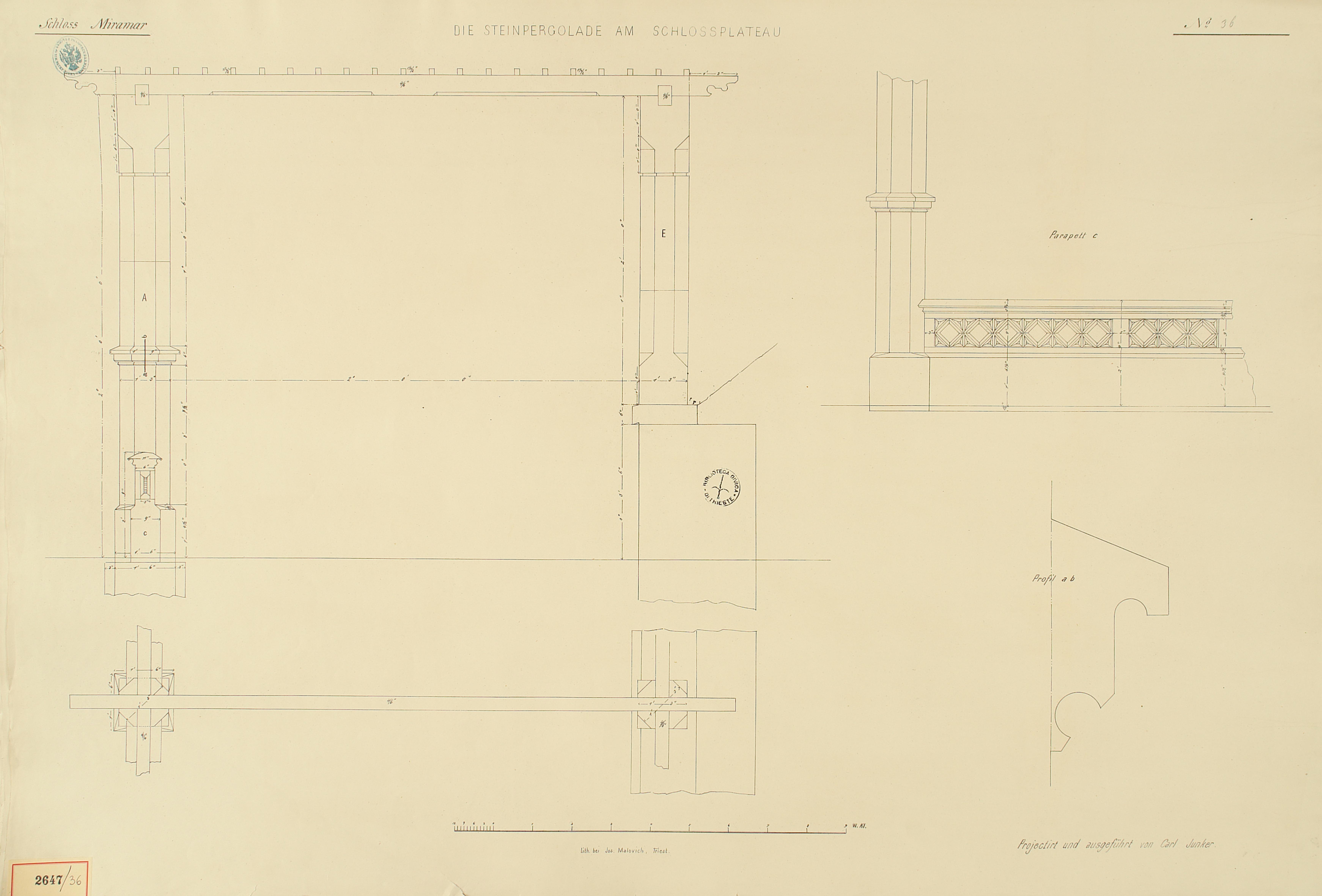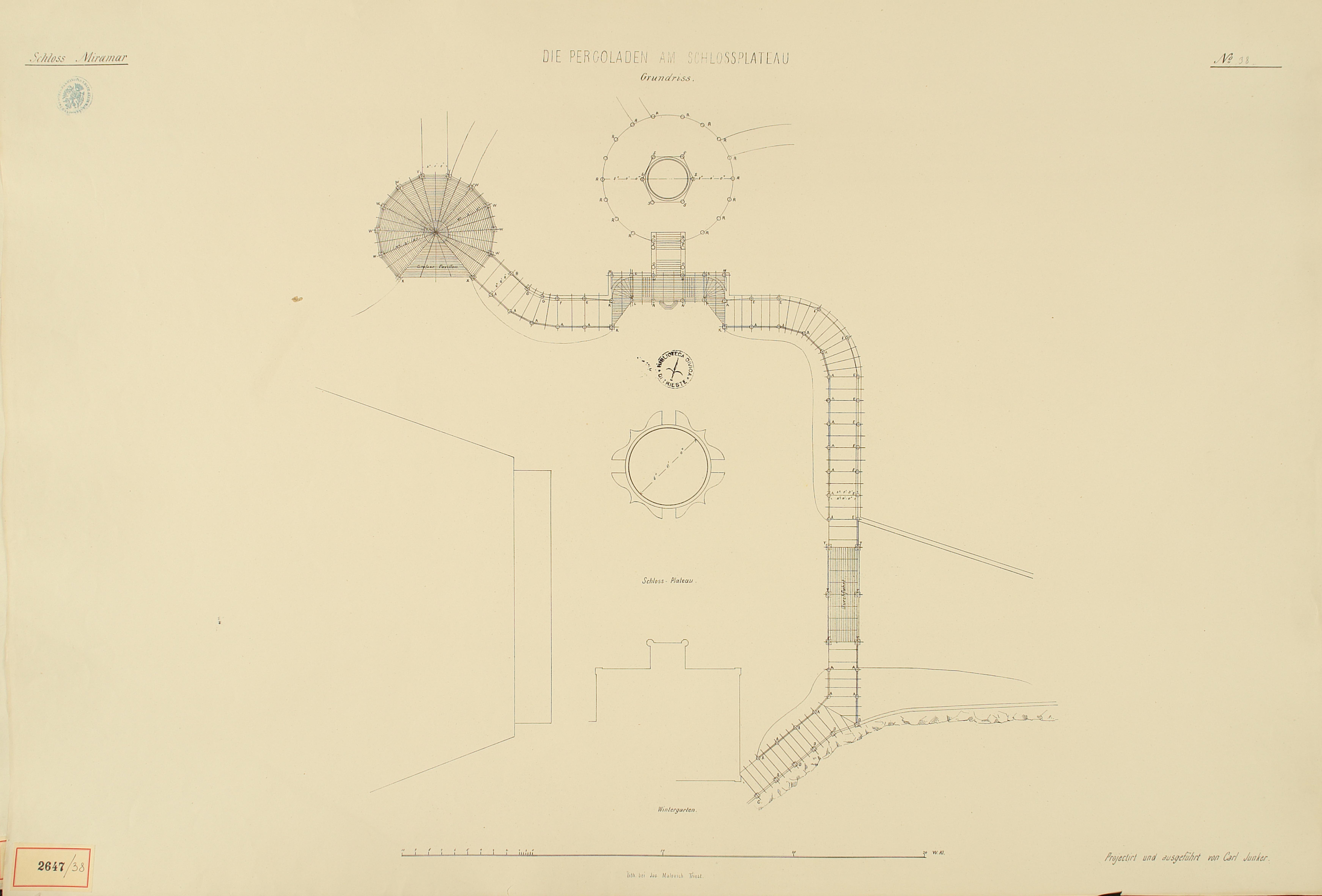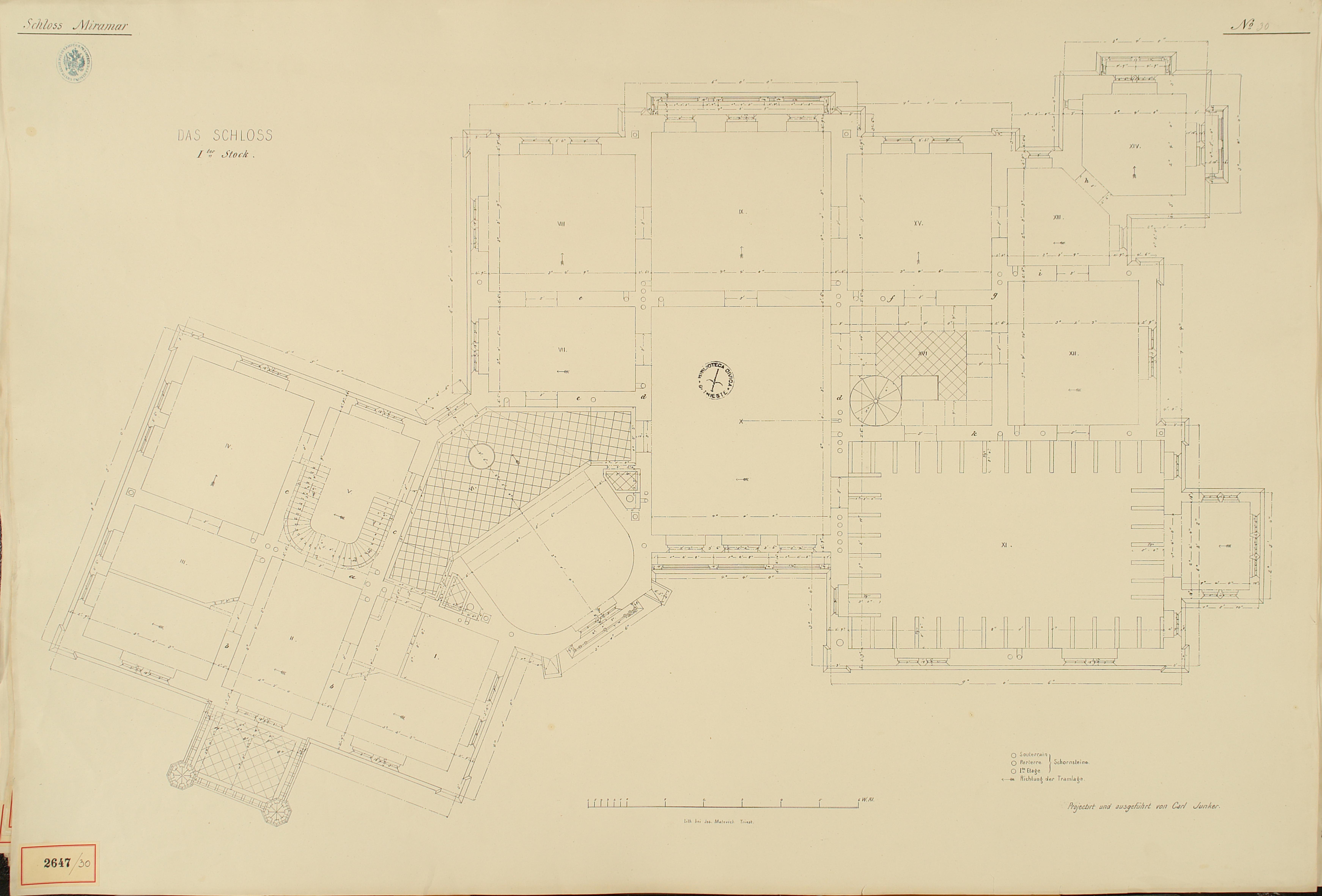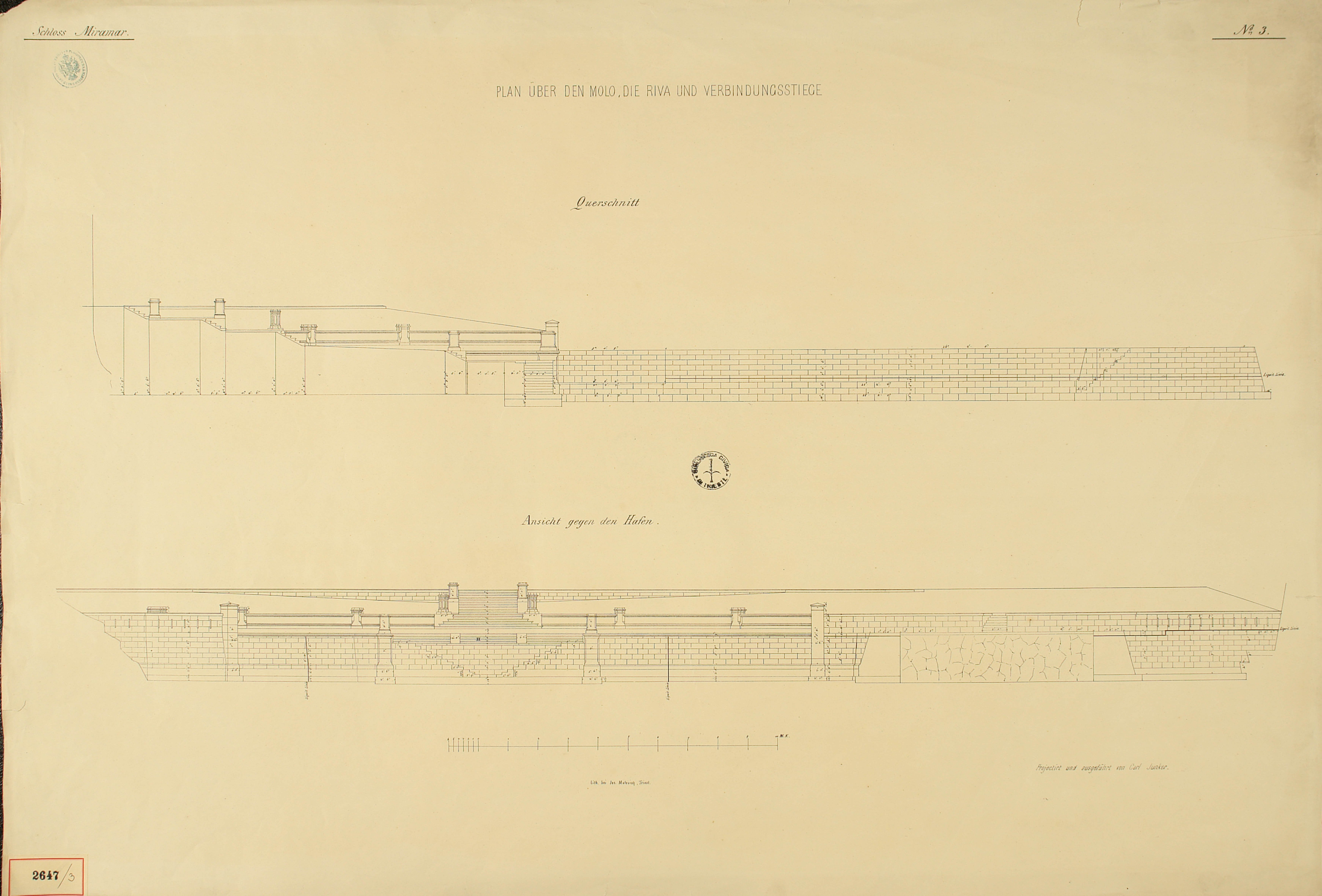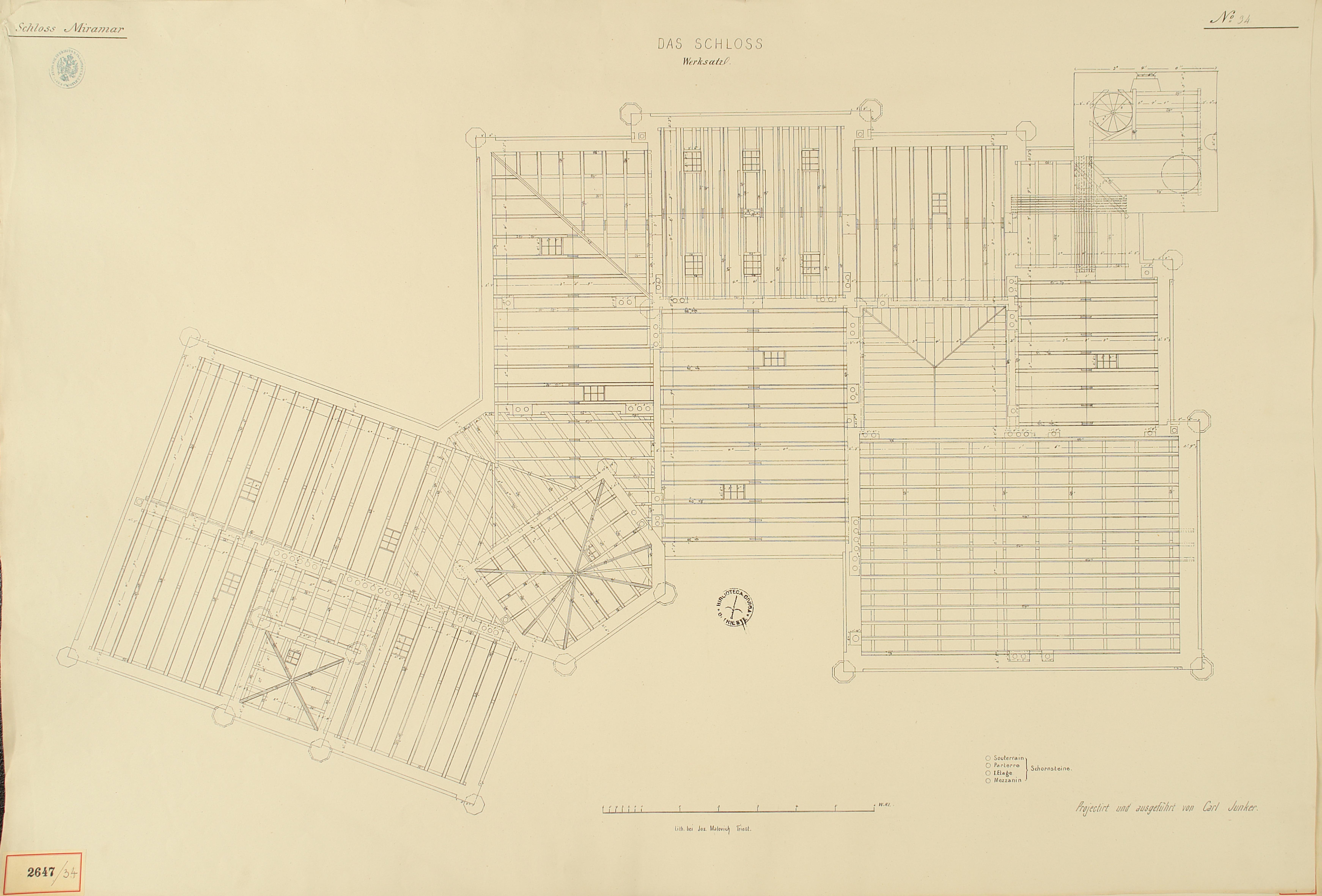 *Schloss Miramar : Im hohen Auftrage seiner k. k. Hoheit des durchlauchtigsten Herrn Erzherzogs Ferdinand Max / Im Zeitraume vom 1. März 1856 bis 27. July 1860, projectirt und ausgeführt von Carl Junker. - Trieste : lith. bei Jos. Malovich, 1856-1860. - 54 tav., 1 pianta e 1 frontespizio : lit. ; 61x90 cm le tav. e 103x142 cm la pianta. ((Tit. della pianta: Situation der Bau- und Garten-Anlagen in Miramar.