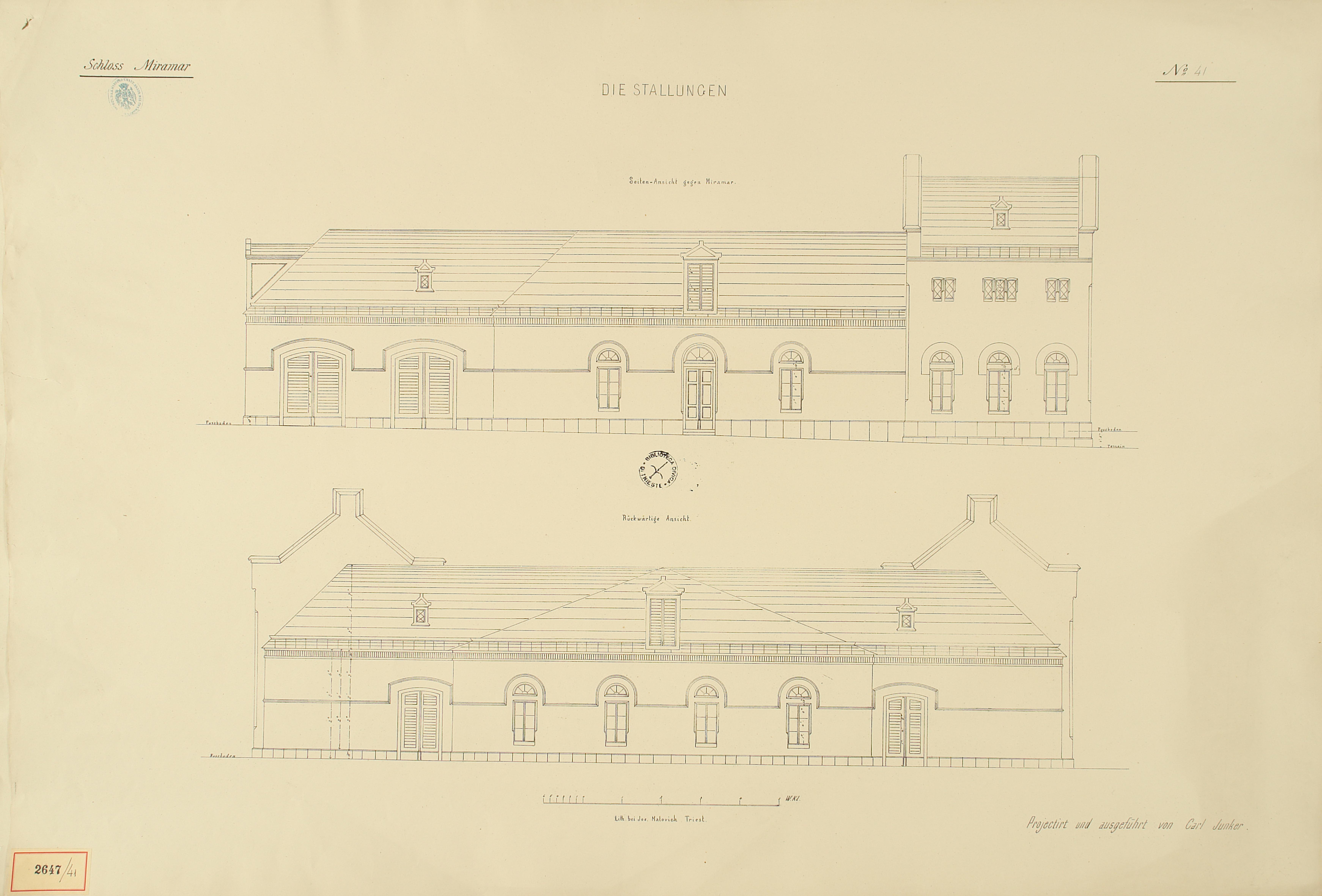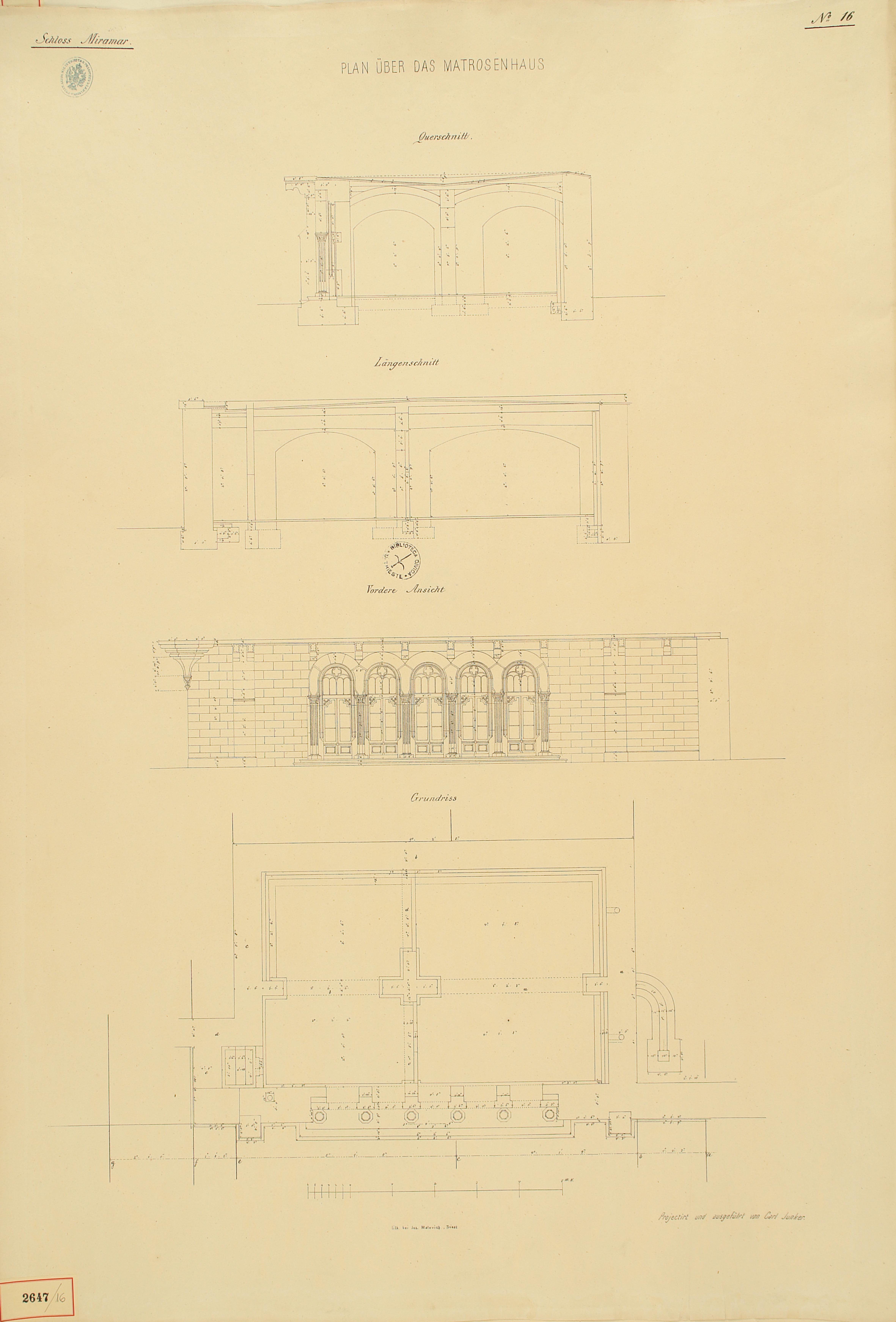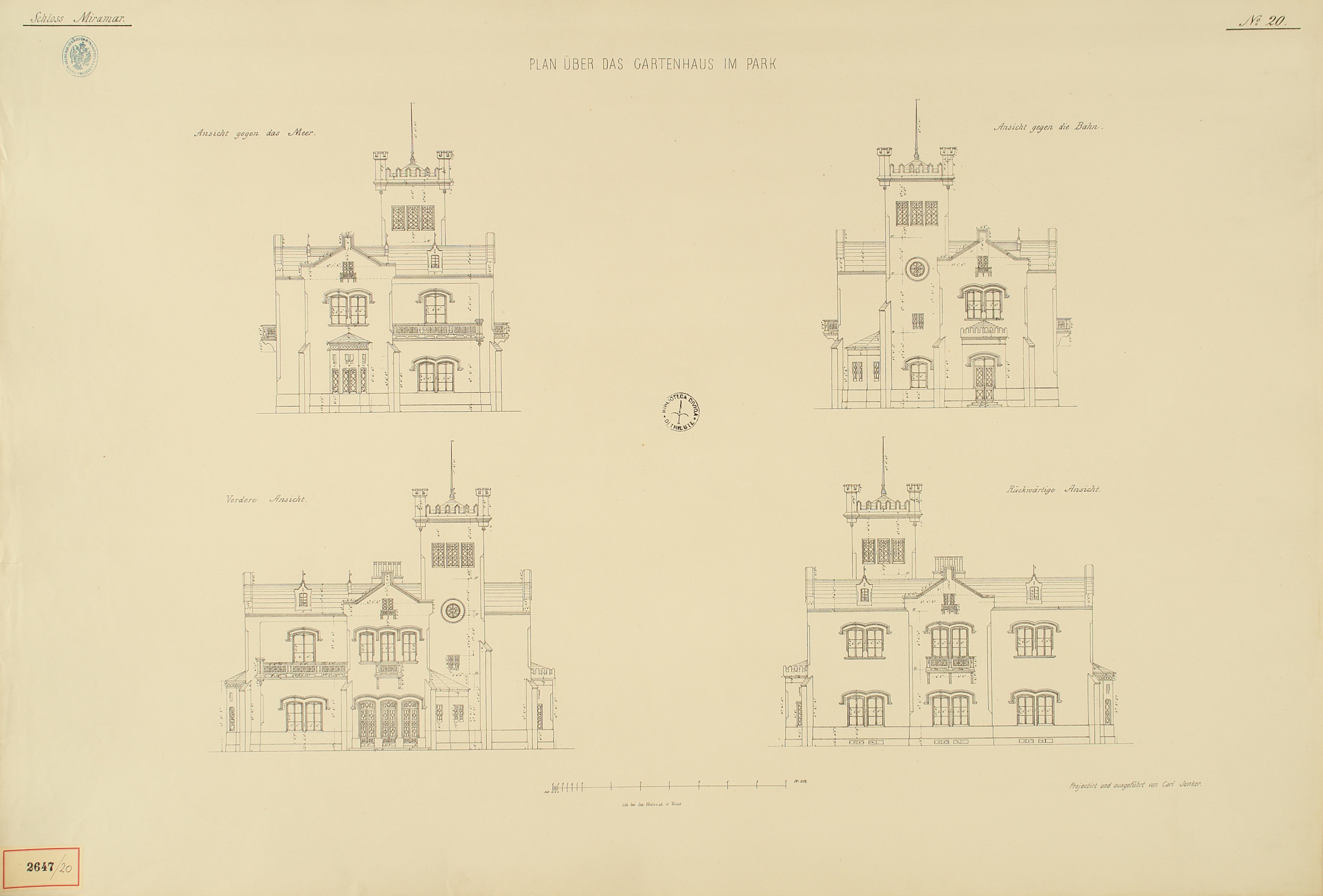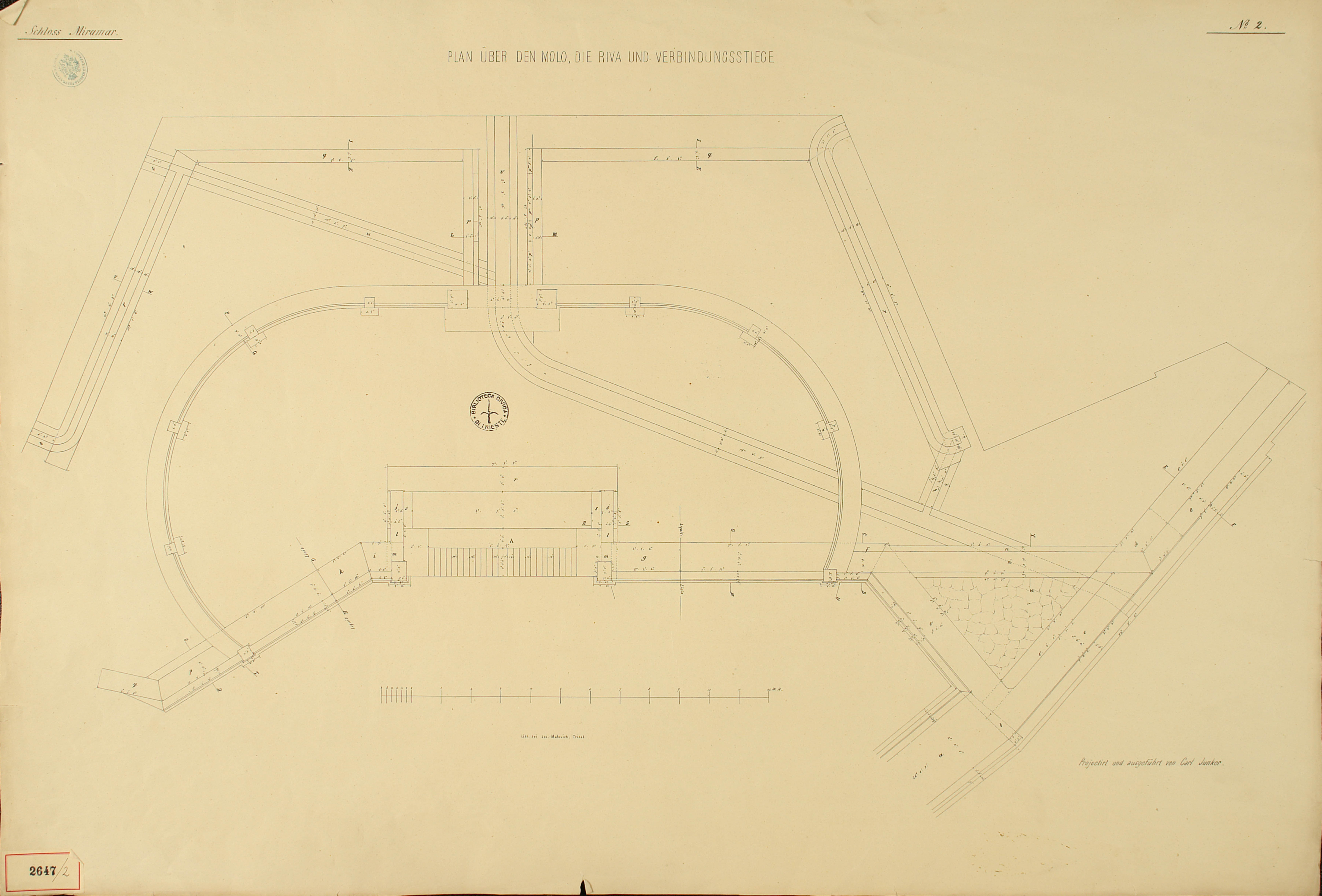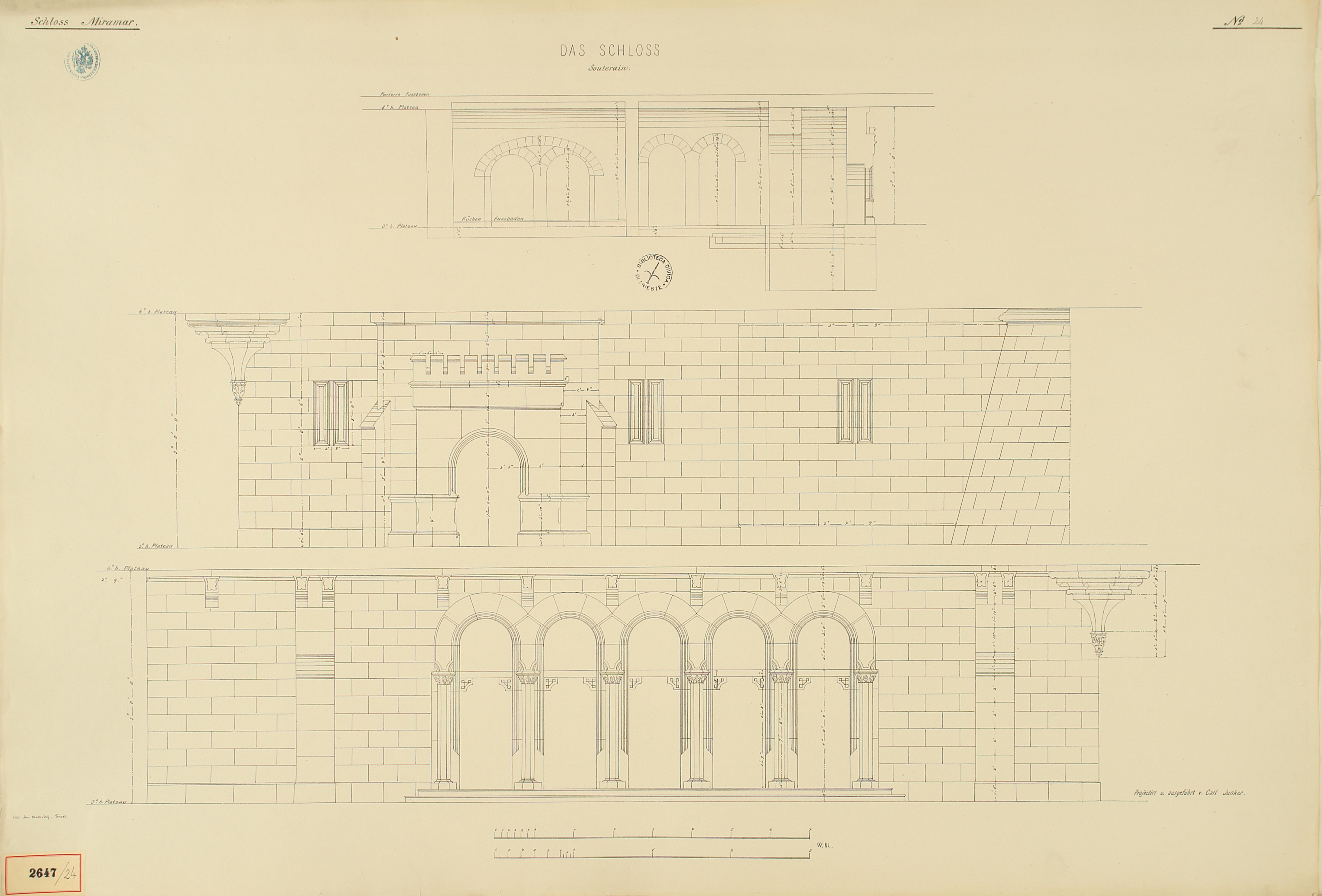 *Schloss Miramar : Im hohen Auftrage seiner k. k. Hoheit des durchlauchtigsten Herrn Erzherzogs Ferdinand Max / Im Zeitraume vom 1. März 1856 bis 27. July 1860, projectirt und ausgeführt von Carl Junker. - Trieste : lith. bei Jos. Malovich, 1856-1860. - 54 tav., 1 pianta e 1 frontespizio : lit. ; 61x90 cm le tav. e 103x142 cm la pianta. ((Tit. della pianta: Situation der Bau- und Garten-Anlagen in Miramar.