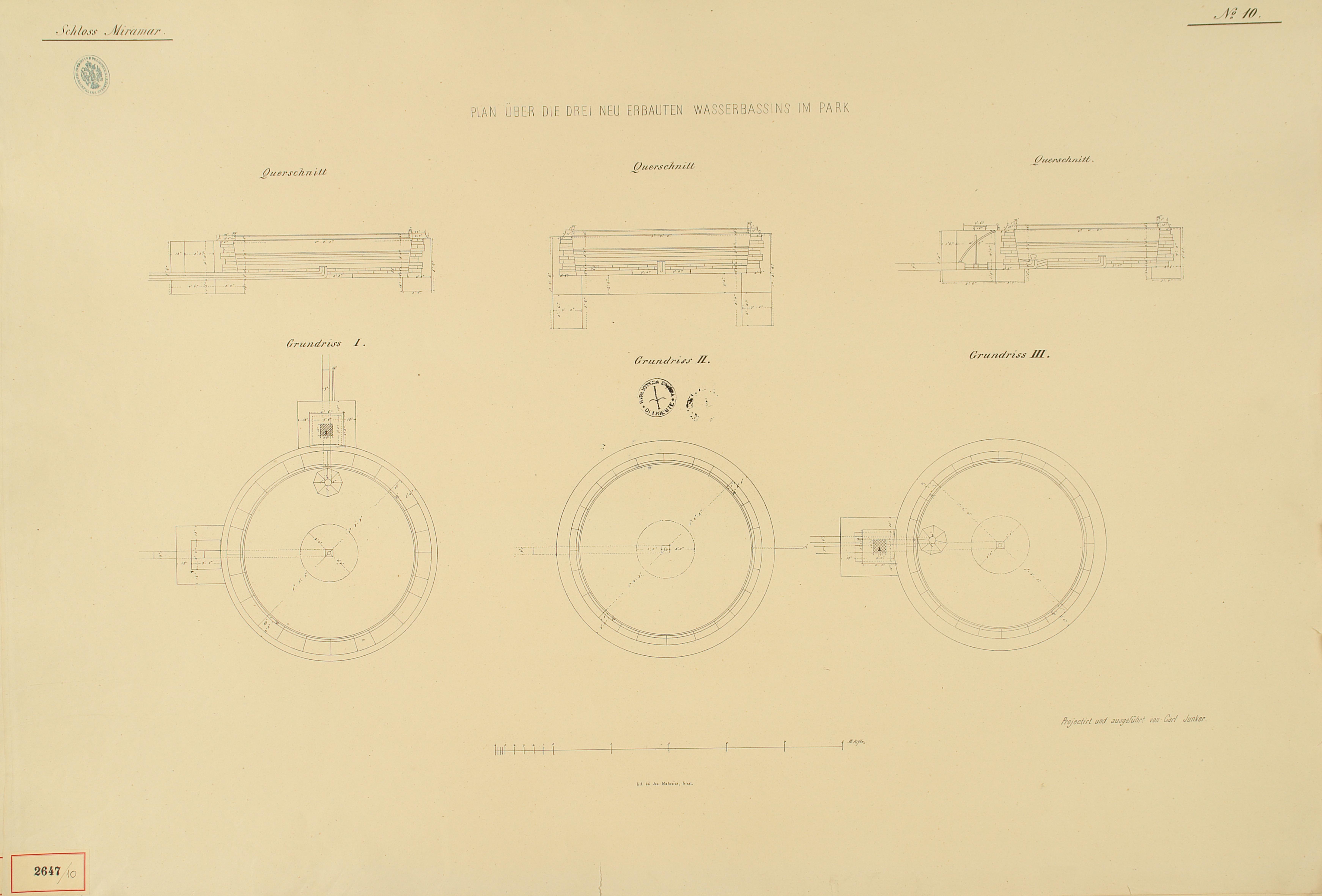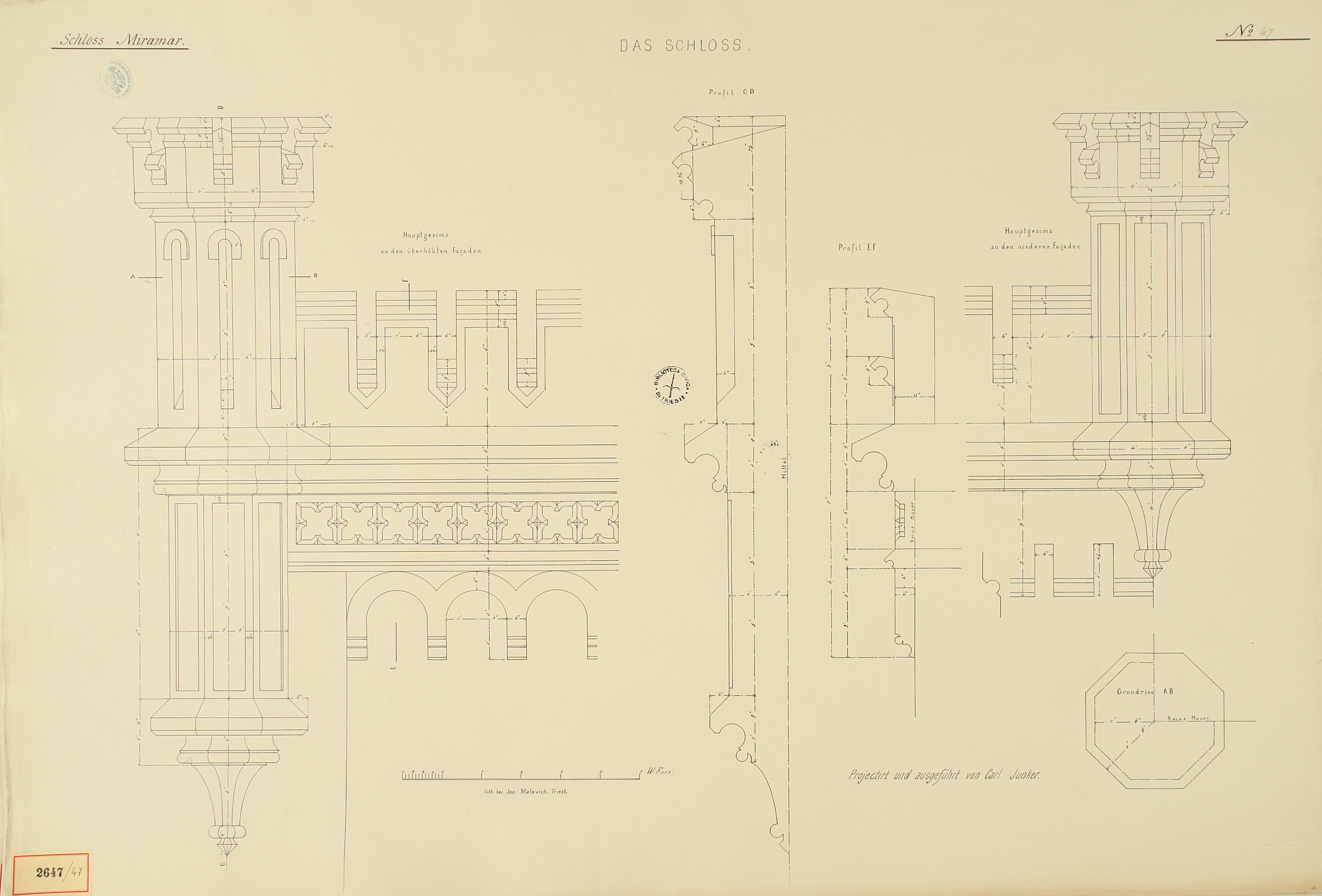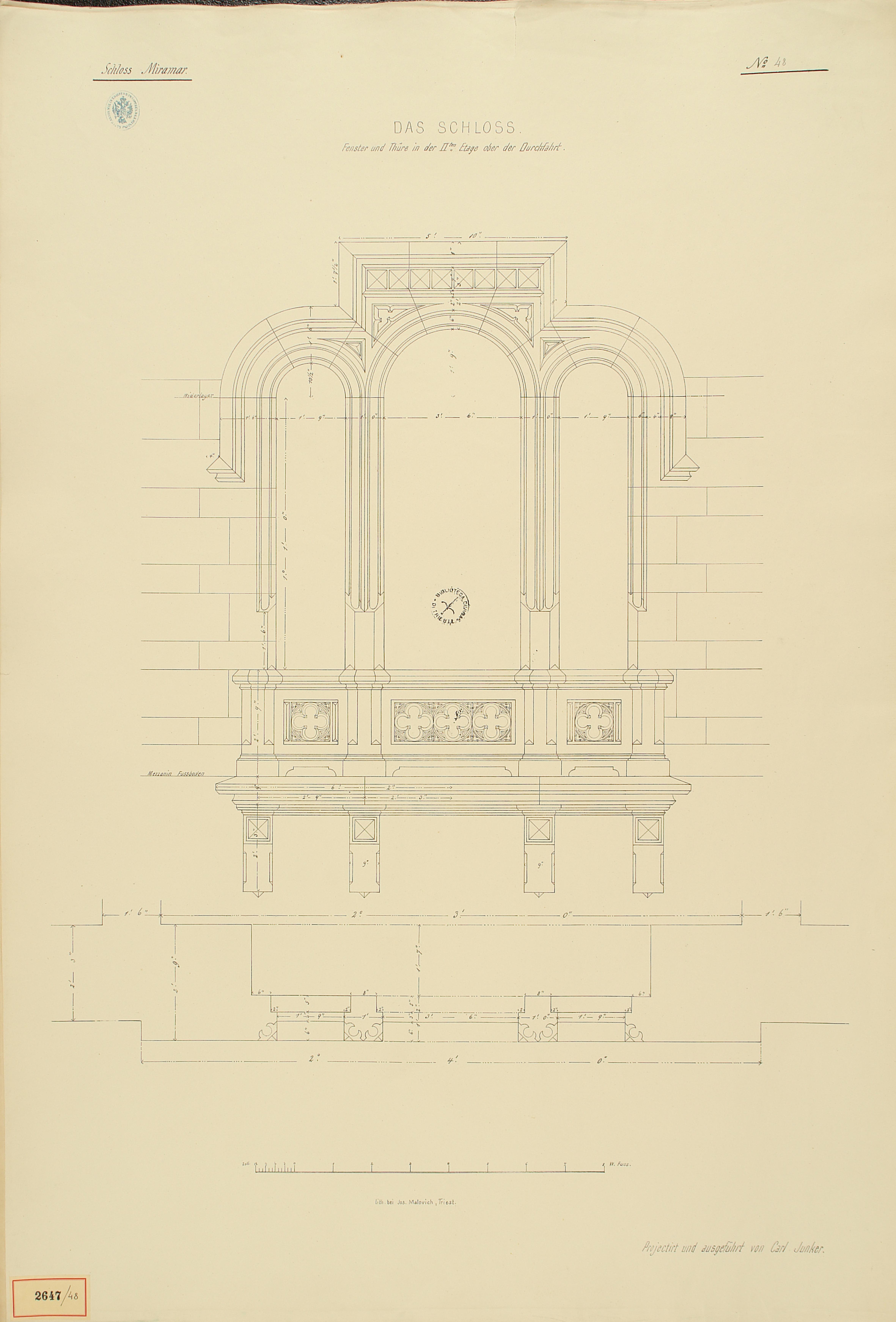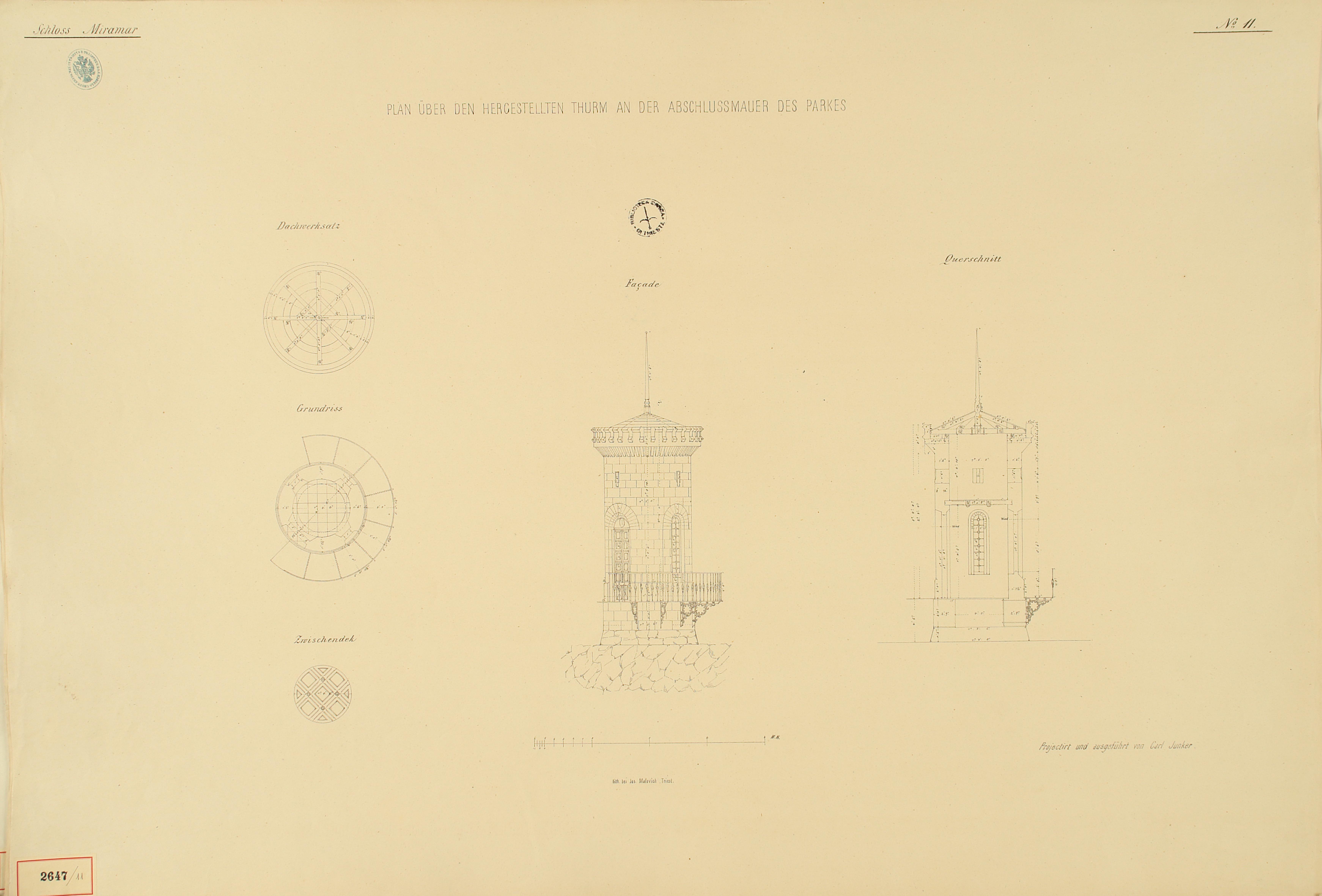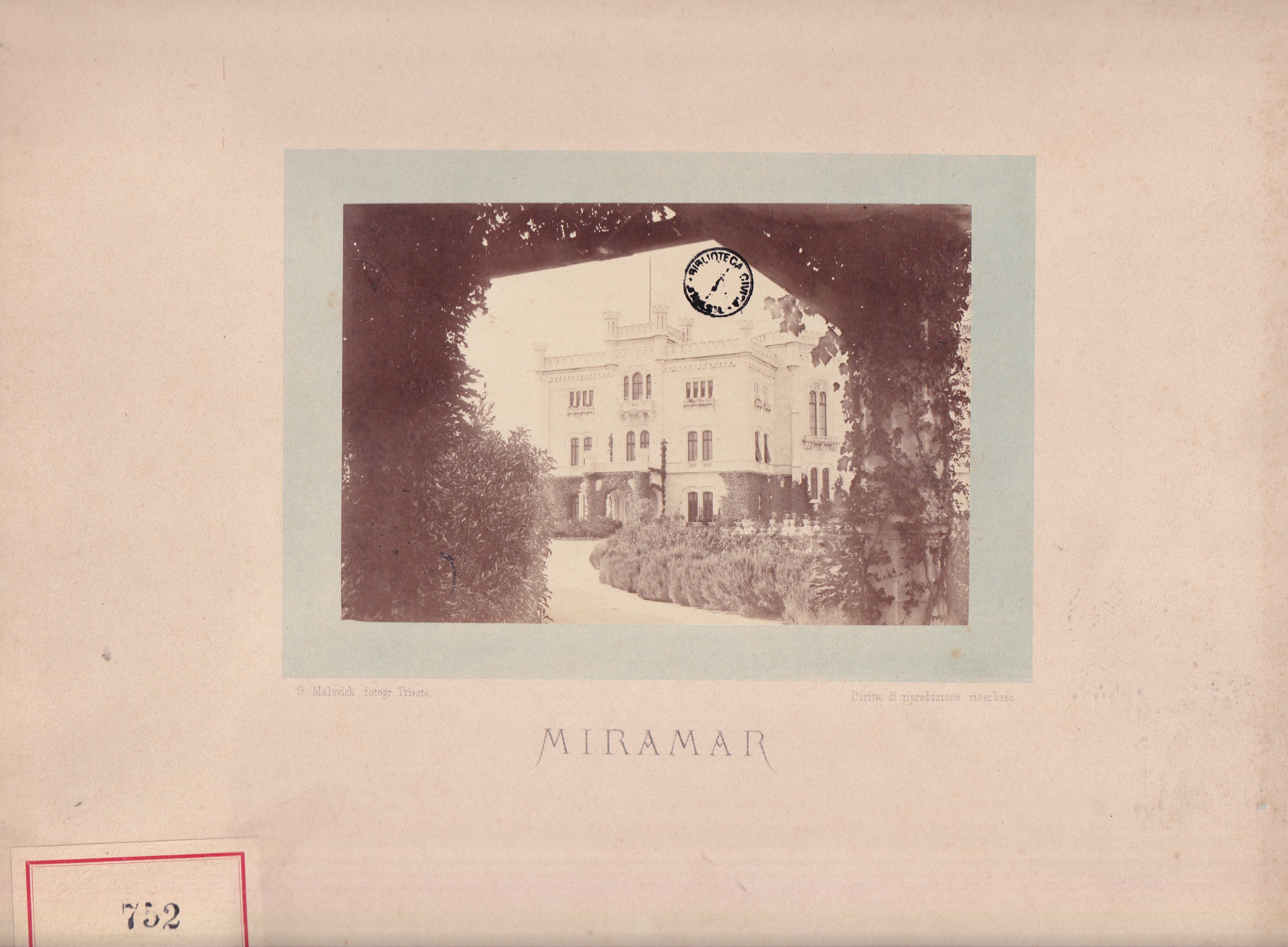 *Schloss Miramar : Im hohen Auftrage seiner k. k. Hoheit des durchlauchtigsten Herrn Erzherzogs Ferdinand Max / Im Zeitraume vom 1. März 1856 bis 27. July 1860, projectirt und ausgeführt von Carl Junker. - Trieste : lith. bei Jos. Malovich, 1856-1860. - 54 tav., 1 pianta e 1 frontespizio : lit. ; 61x90 cm le tav. e 103x142 cm la pianta. ((Tit. della pianta: Situation der Bau- und Garten-Anlagen in Miramar.