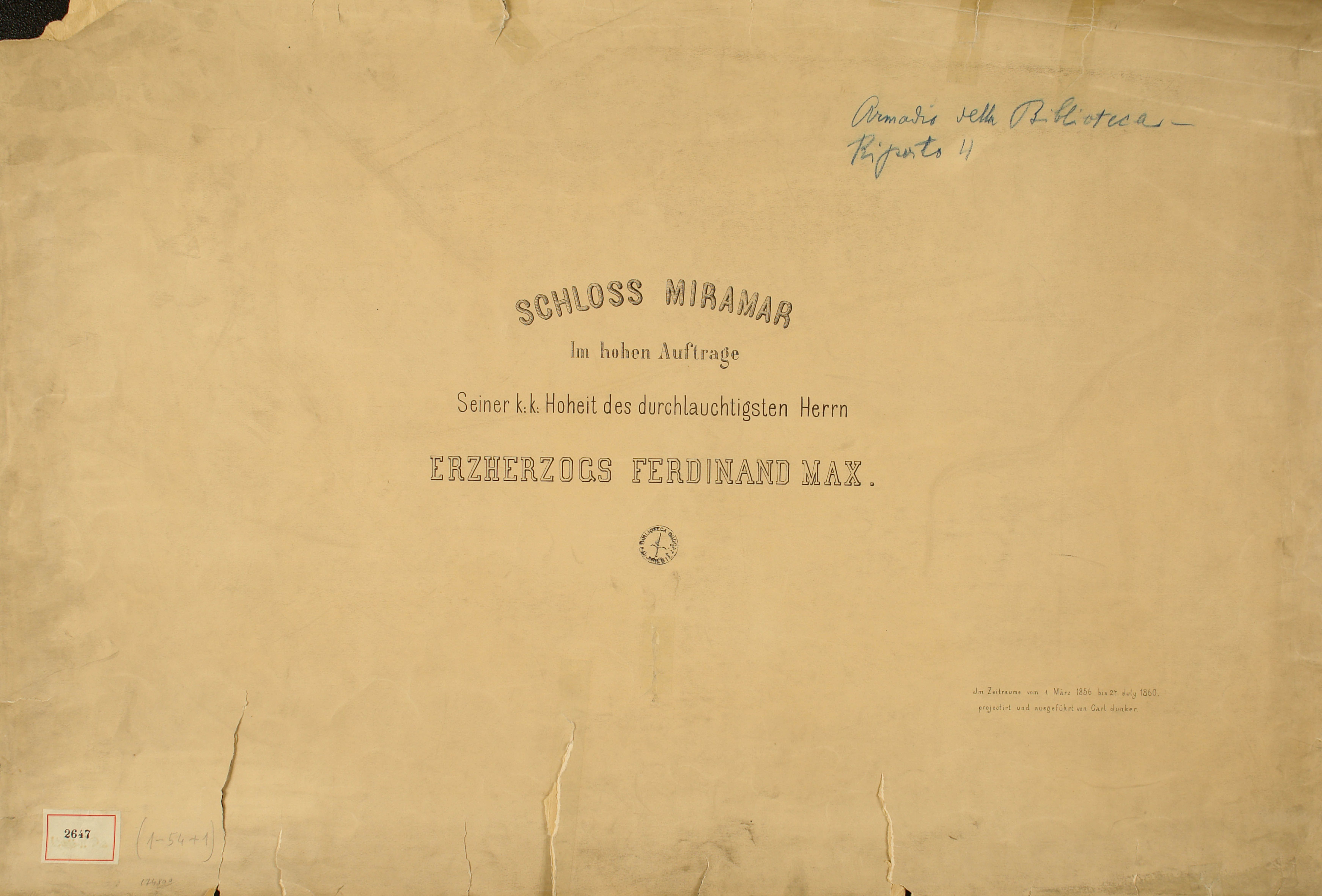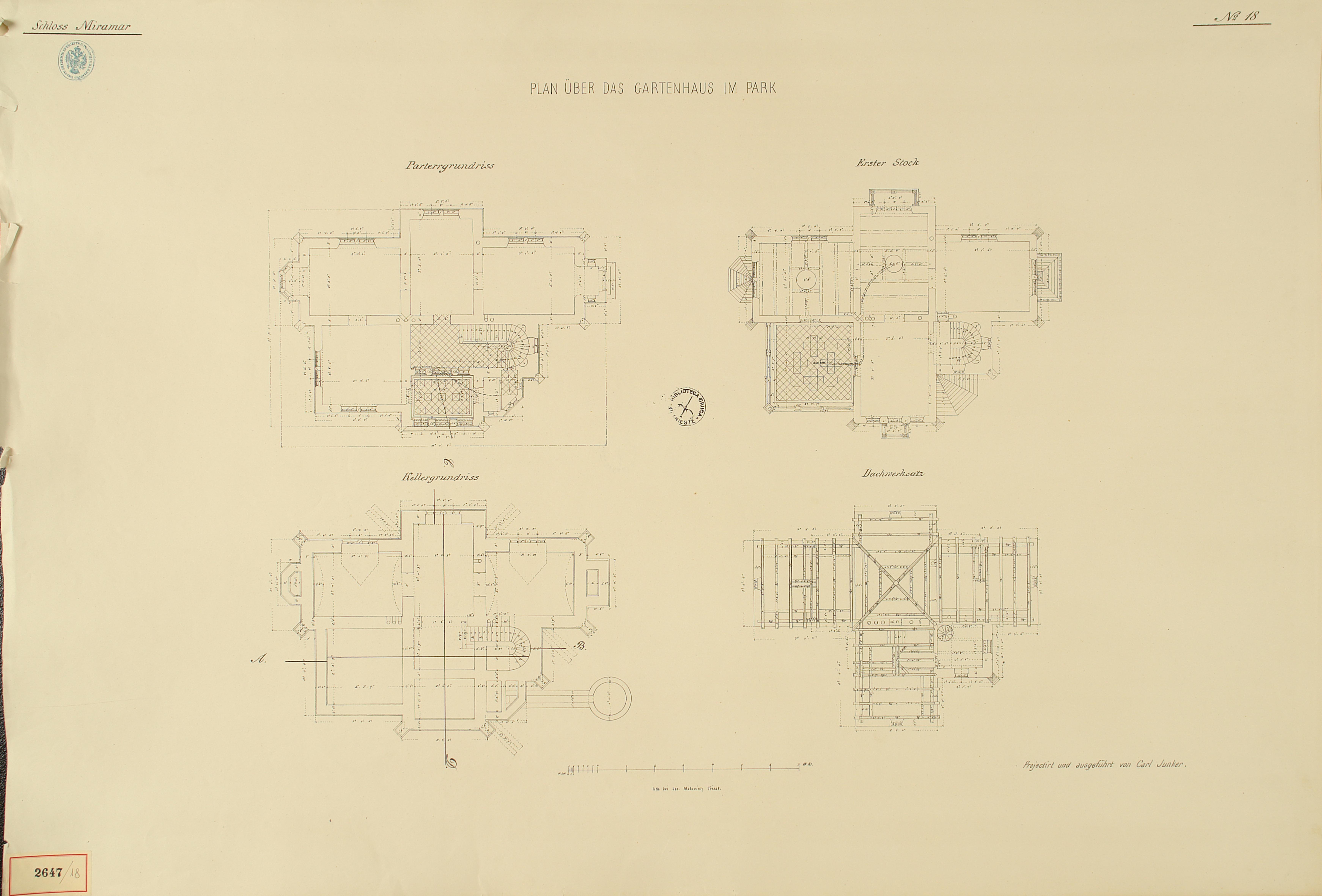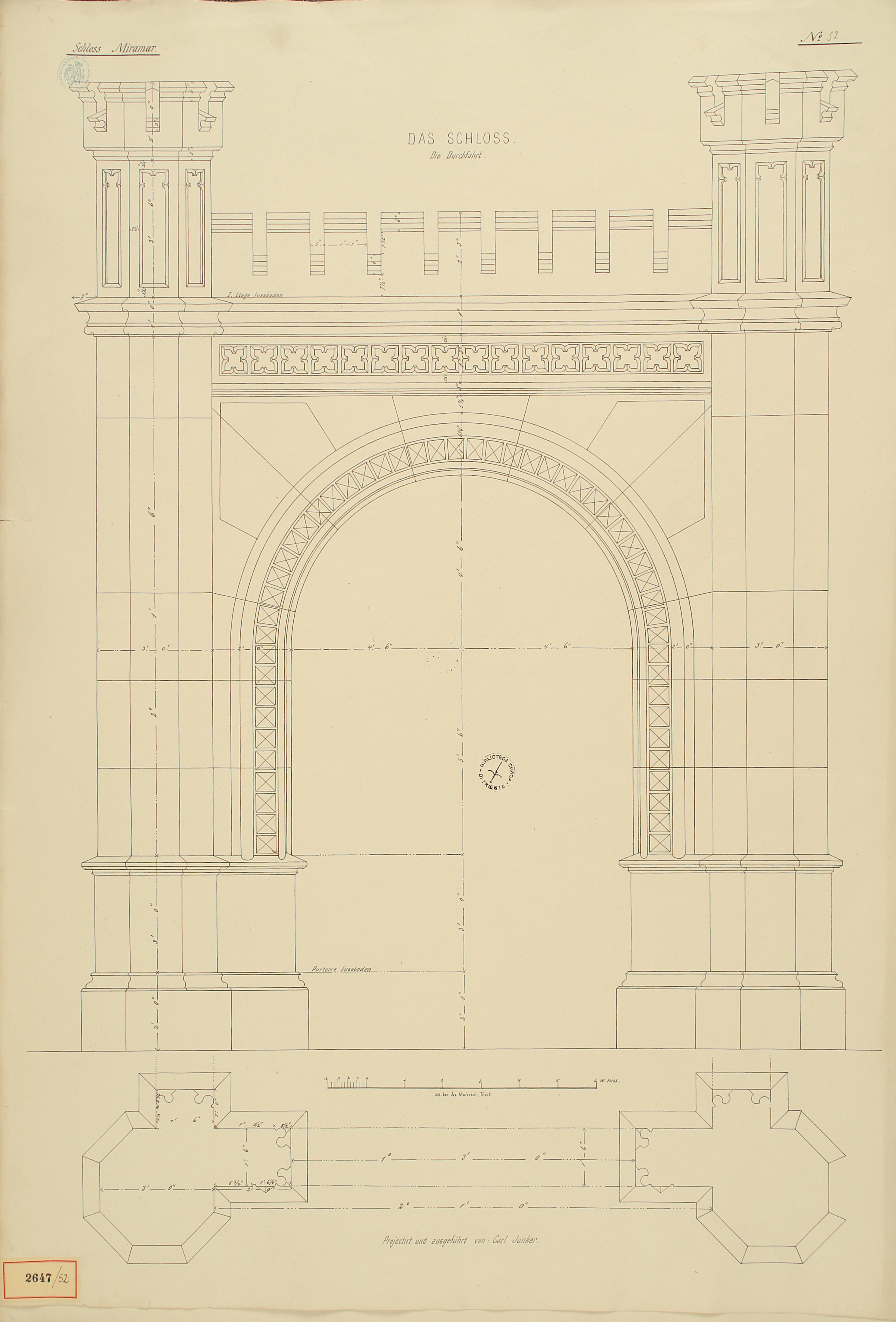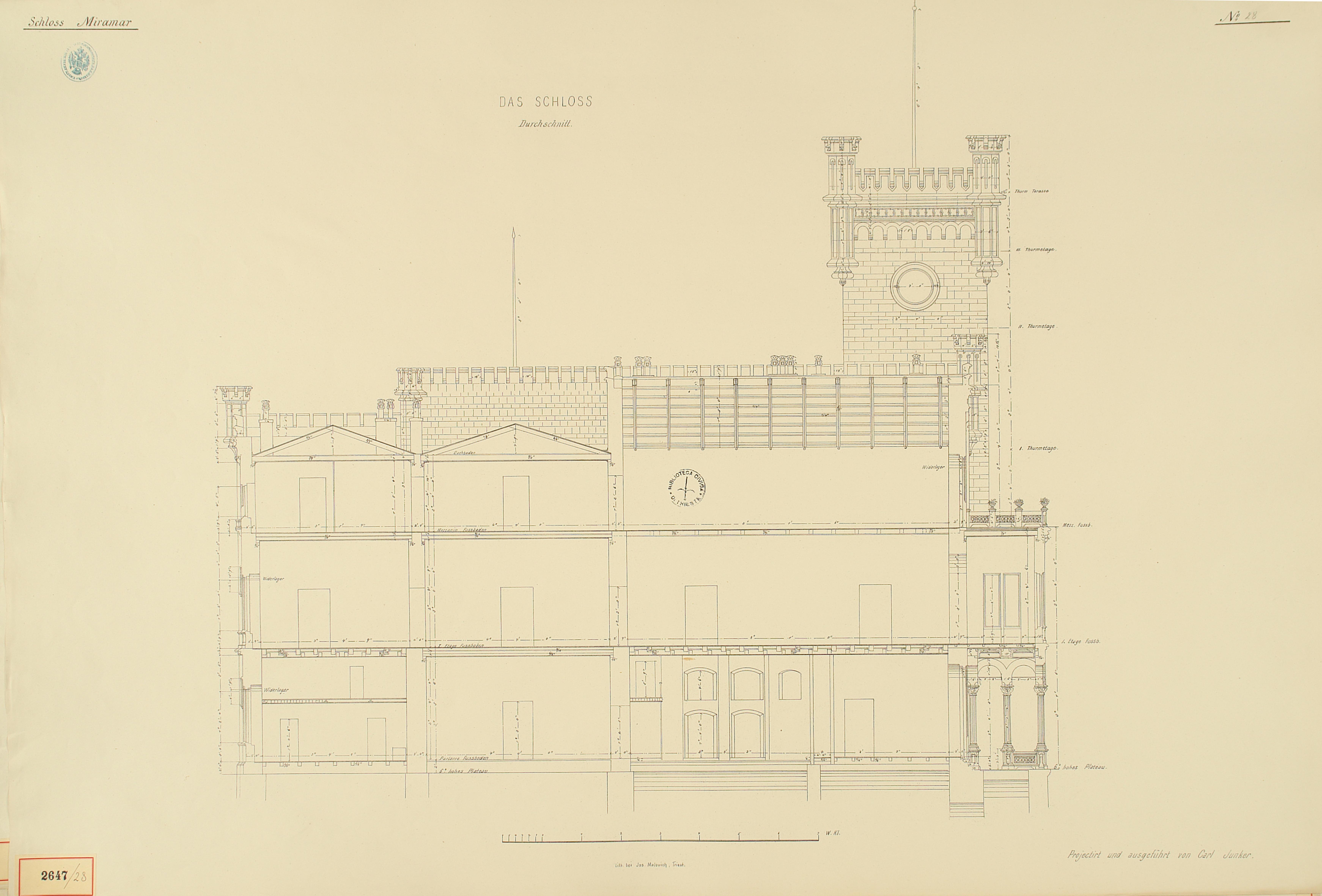 *Schloss Miramar : Im hohen Auftrage seiner k. k. Hoheit des durchlauchtigsten Herrn Erzherzogs Ferdinand Max / Im Zeitraume vom 1. März 1856 bis 27. July 1860, projectirt und ausgeführt von Carl Junker. - Trieste : lith. bei Jos. Malovich, 1856-1860. - 54 tav., 1 pianta e 1 frontespizio : lit. ; 61x90 cm le tav. e 103x142 cm la pianta. ((Tit. della pianta: Situation der Bau- und Garten-Anlagen in Miramar.