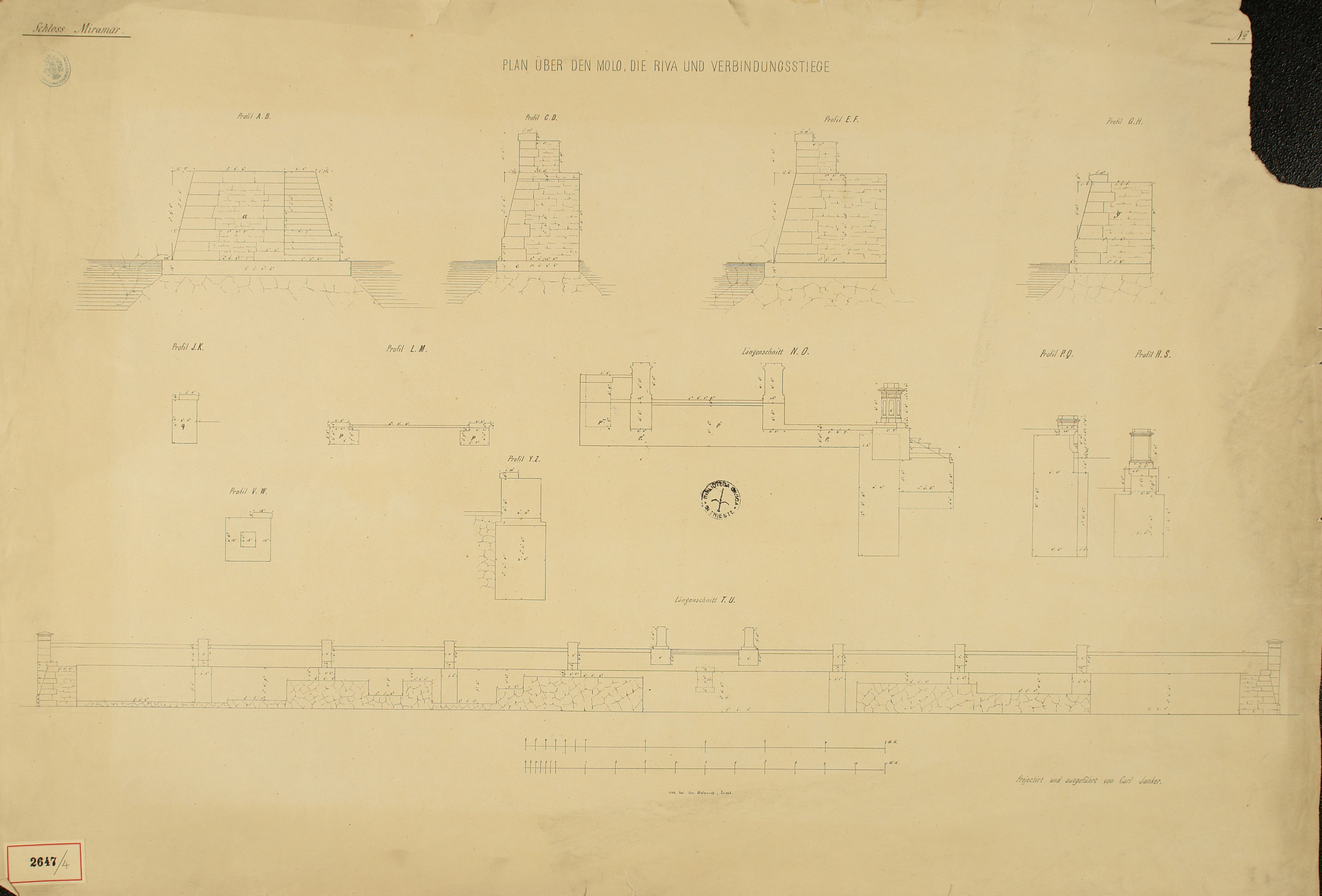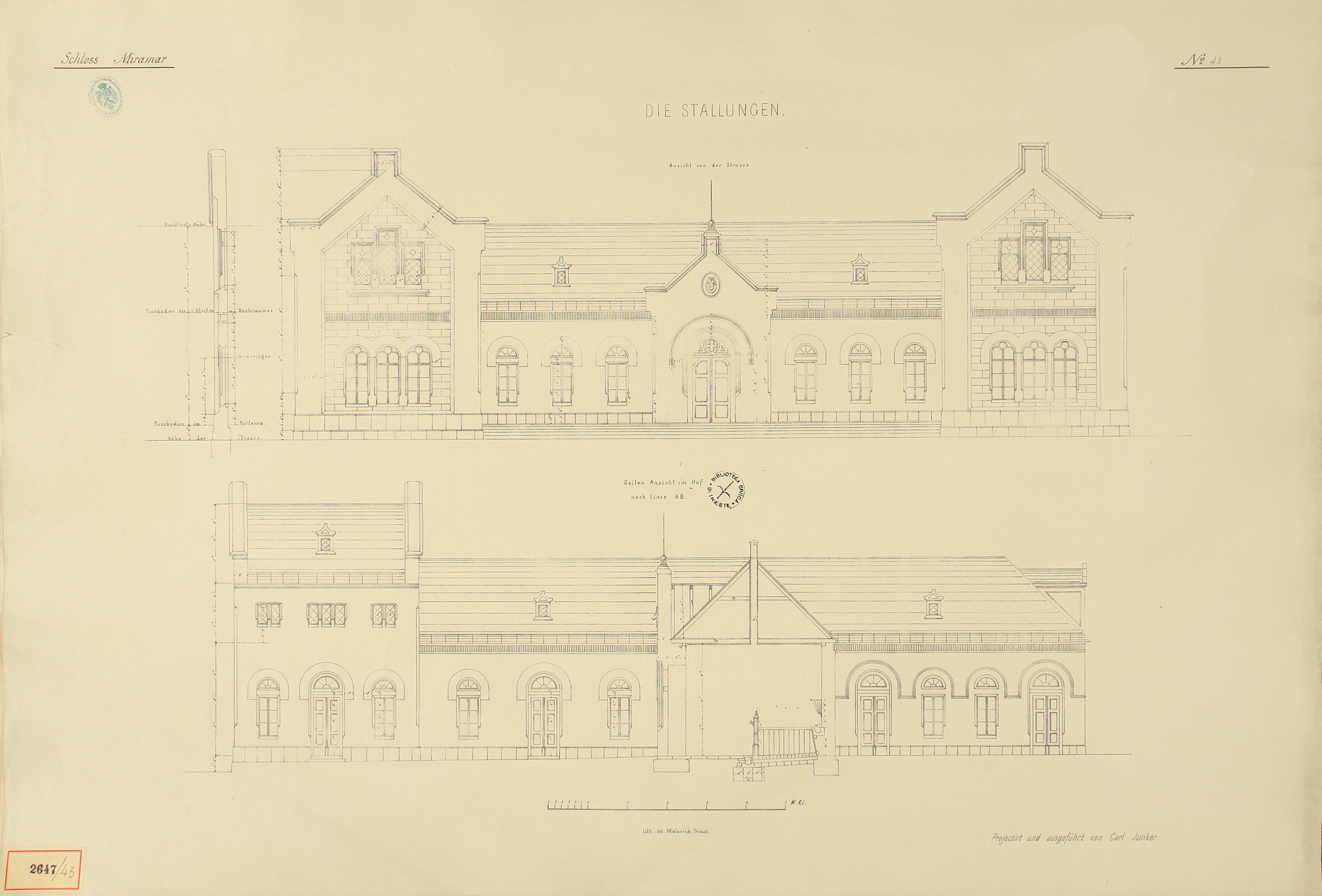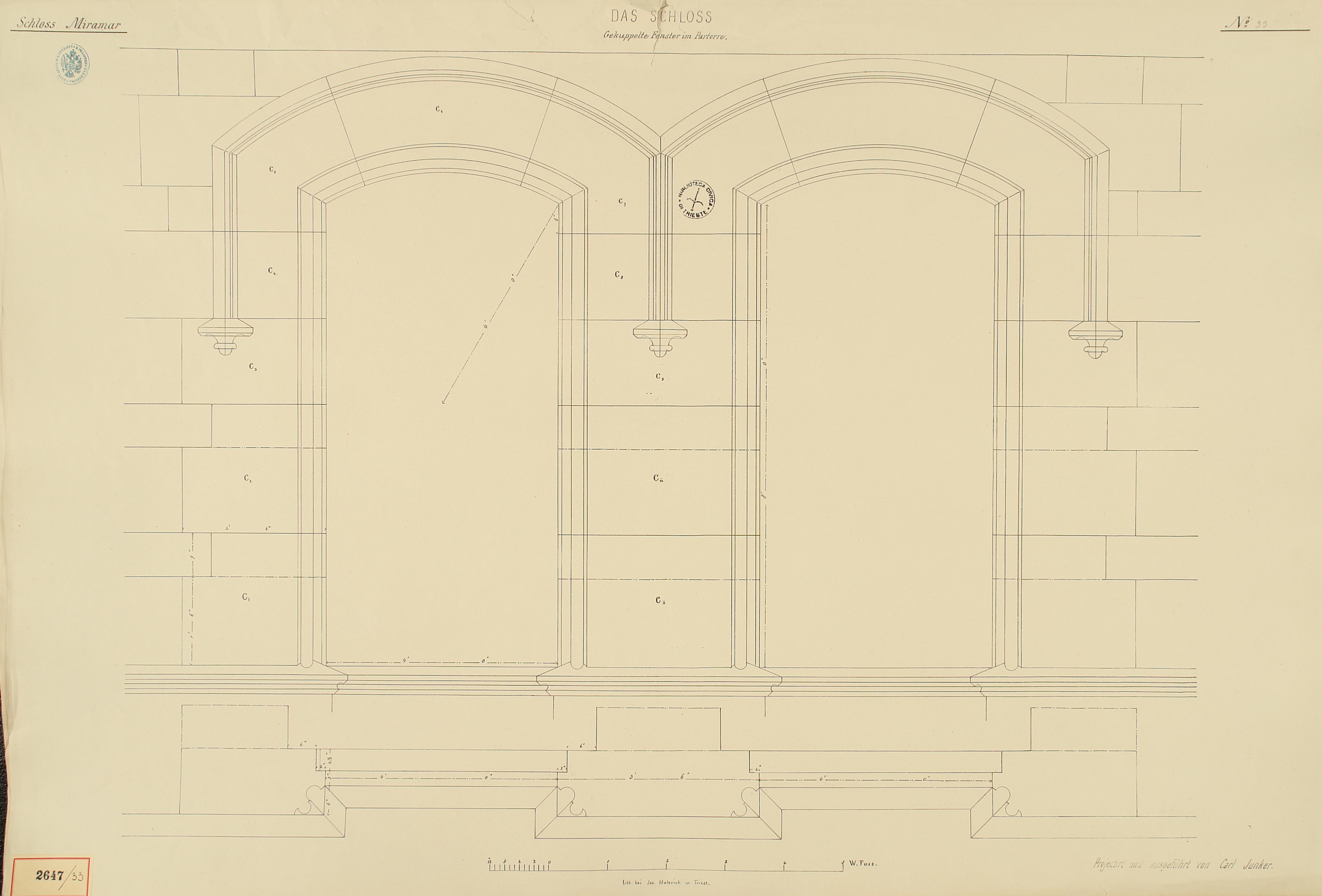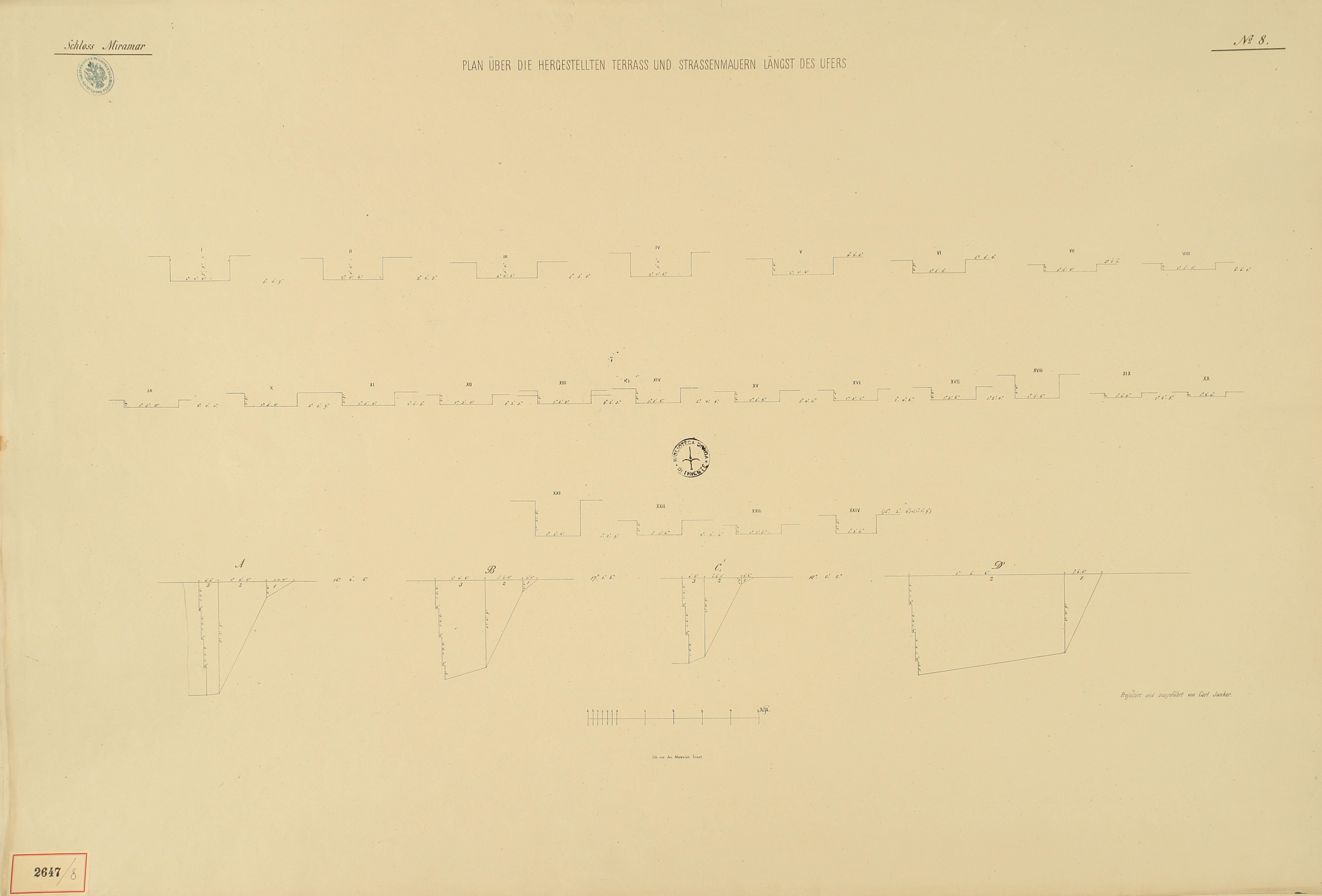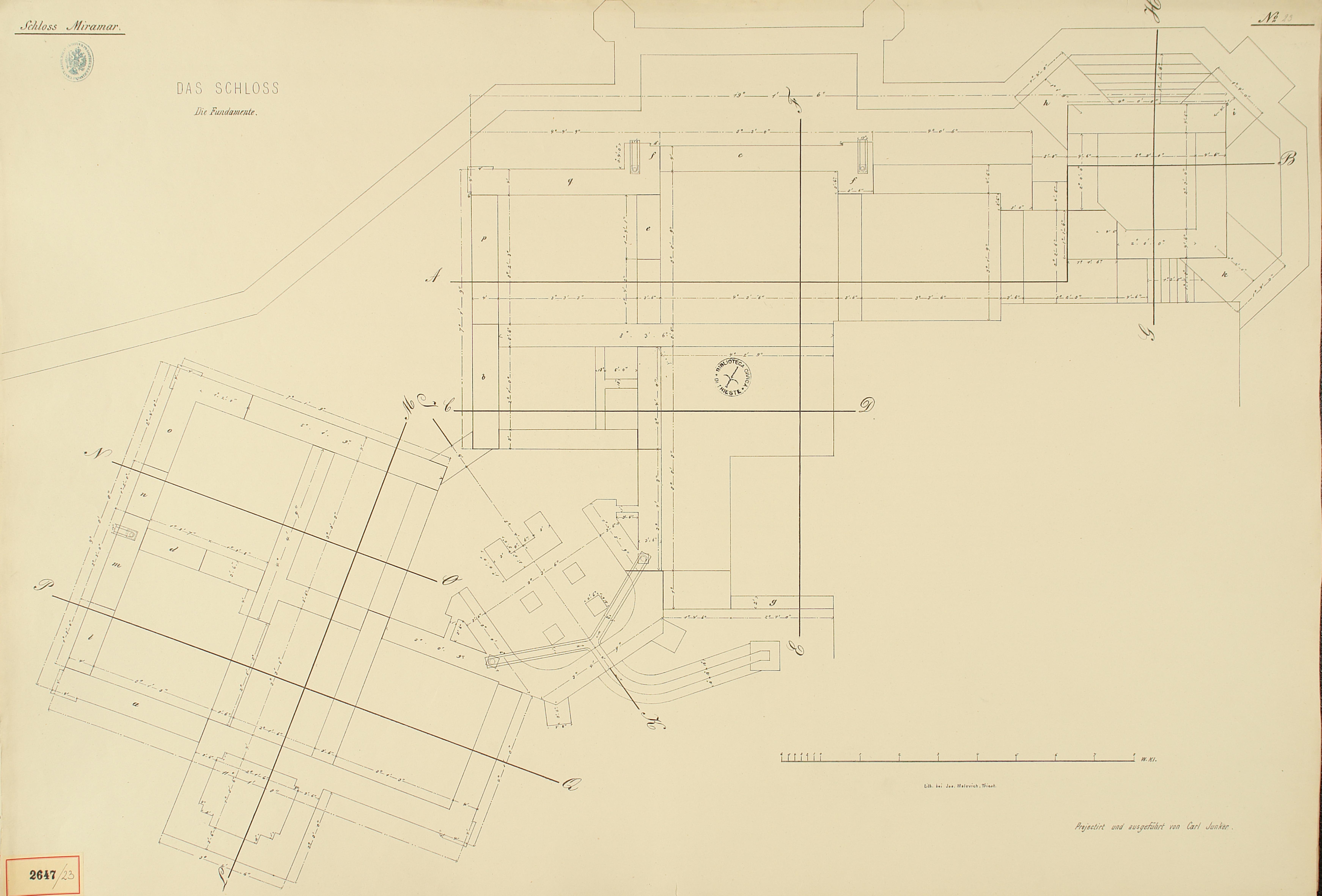*Schloss Miramar : Im hohen Auftrage seiner k. k. Hoheit des durchlauchtigsten Herrn Erzherzogs Ferdinand Max / Im Zeitraume vom 1. März 1856 bis 27. July 1860, projectirt und ausgeführt von Carl Junker. - Trieste : lith. bei Jos. Malovich, 1856-1860. - 54 tav., 1 pianta e 1 frontespizio : lit. ; 61x90 cm le tav. e 103x142 cm la pianta. ((Tit. della pianta: Situation der Bau- und Garten-Anlagen in Miramar.